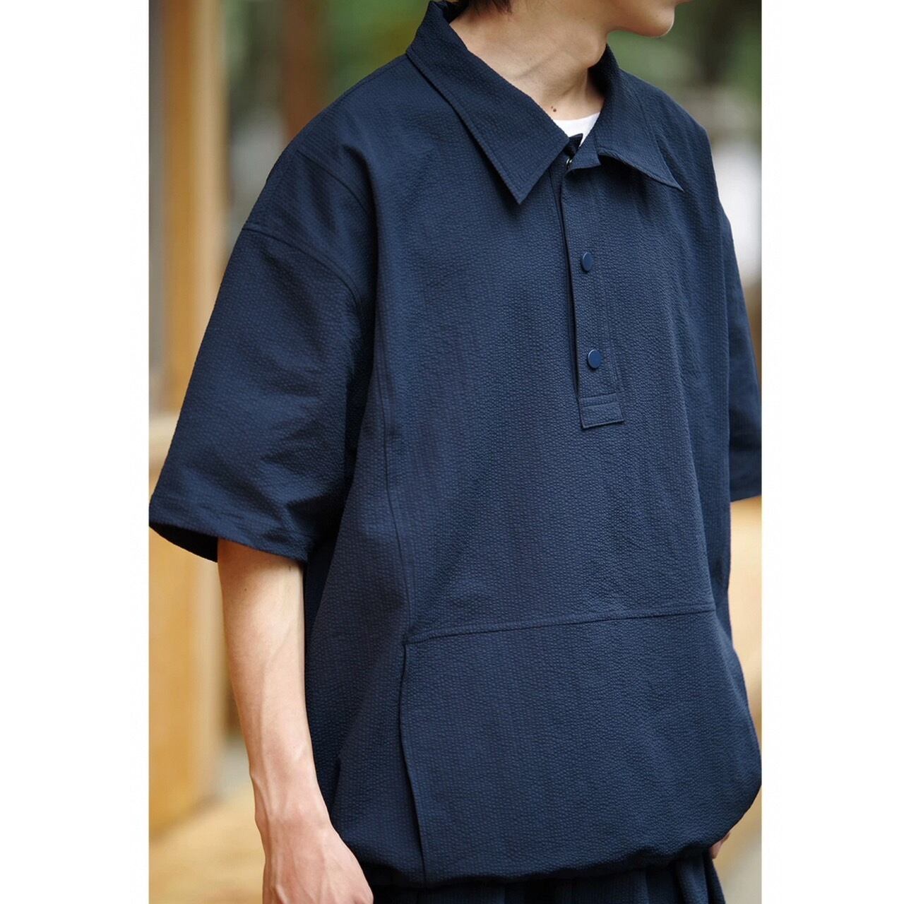 袖口のゴム仕様やフロントのハーフボタンがアクセントに。
