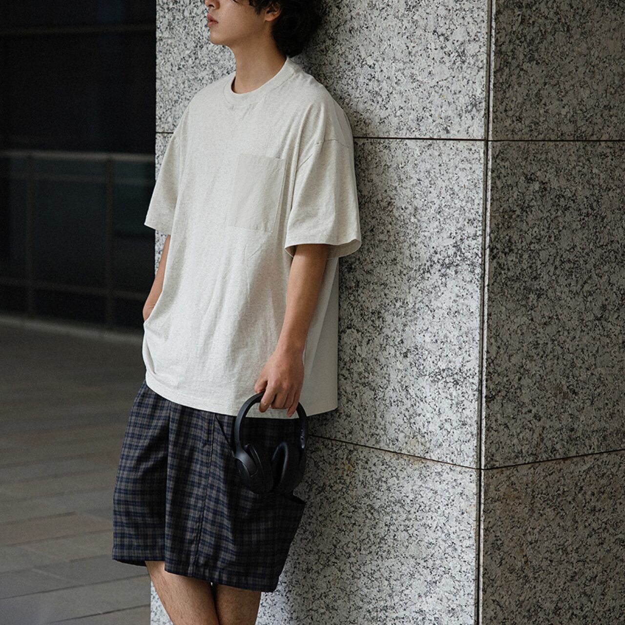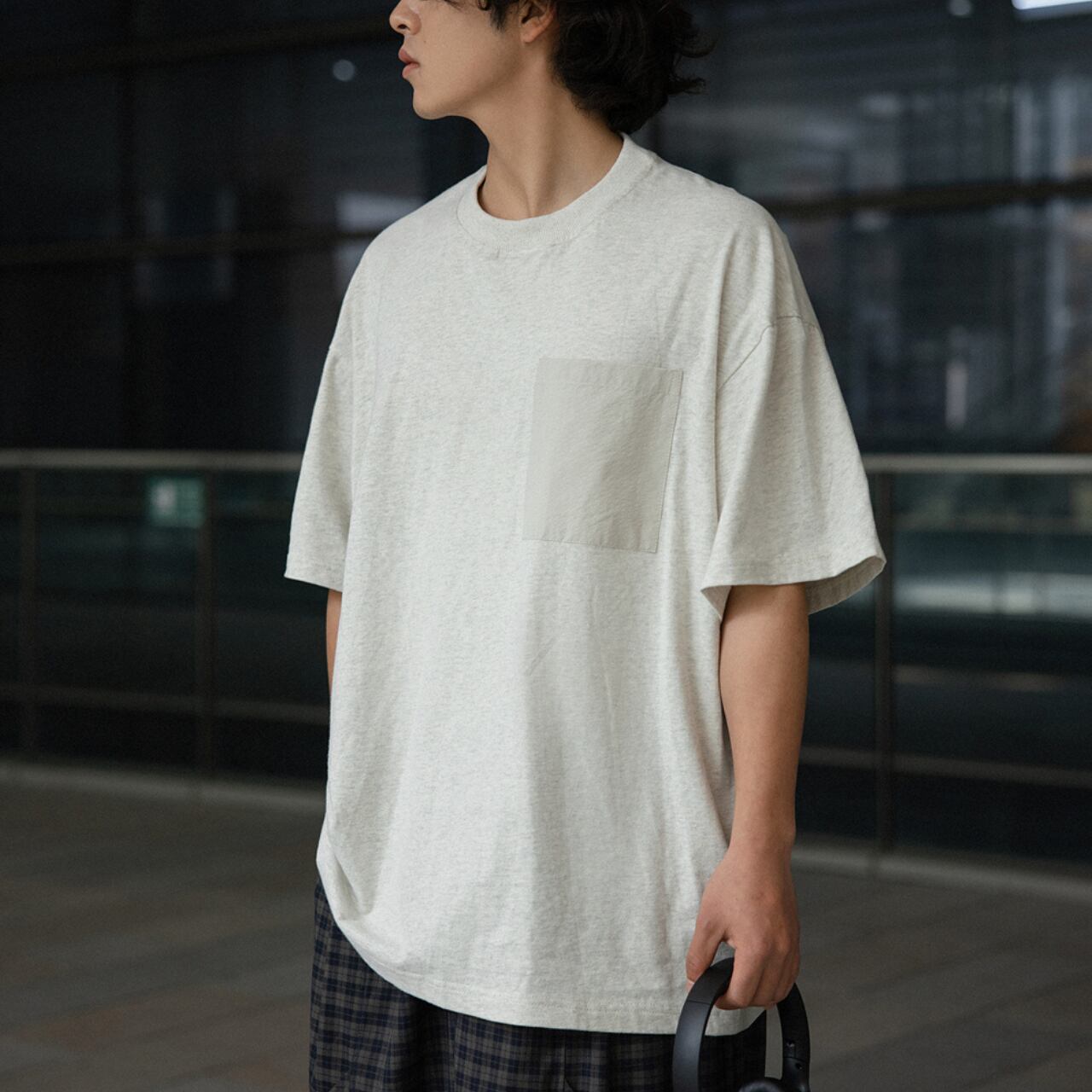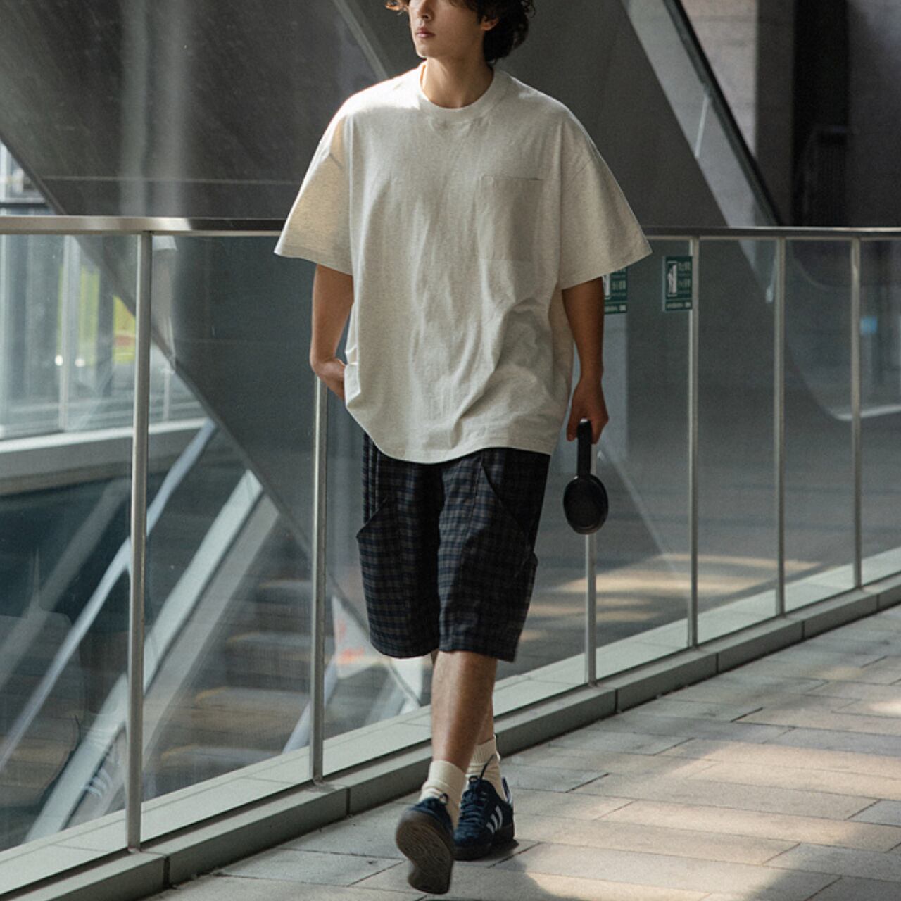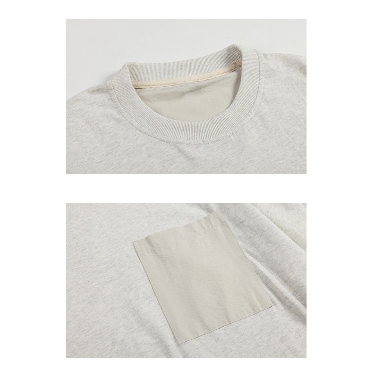 ベーシックなTシャツに異素材のポケットとバックの切り替えをプラスし、シンプルながらも遊び心のある仕上がりに。