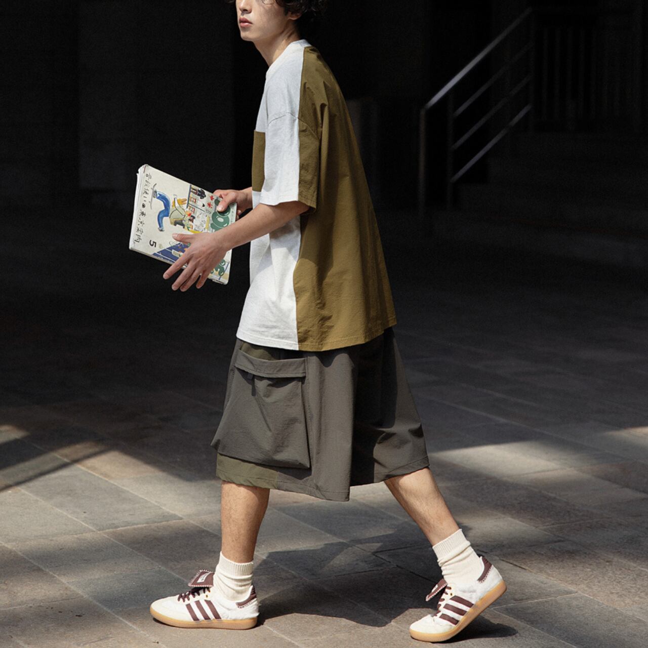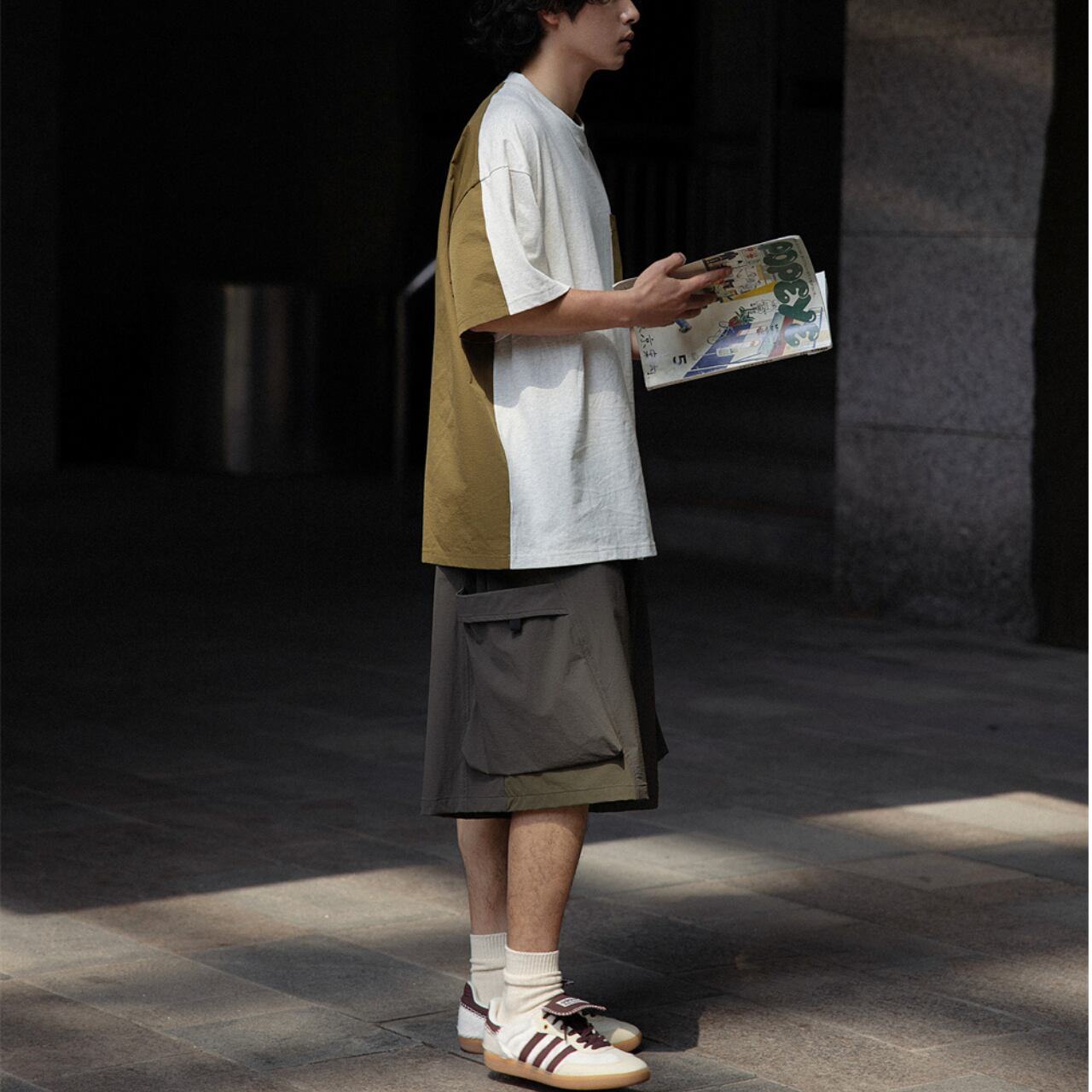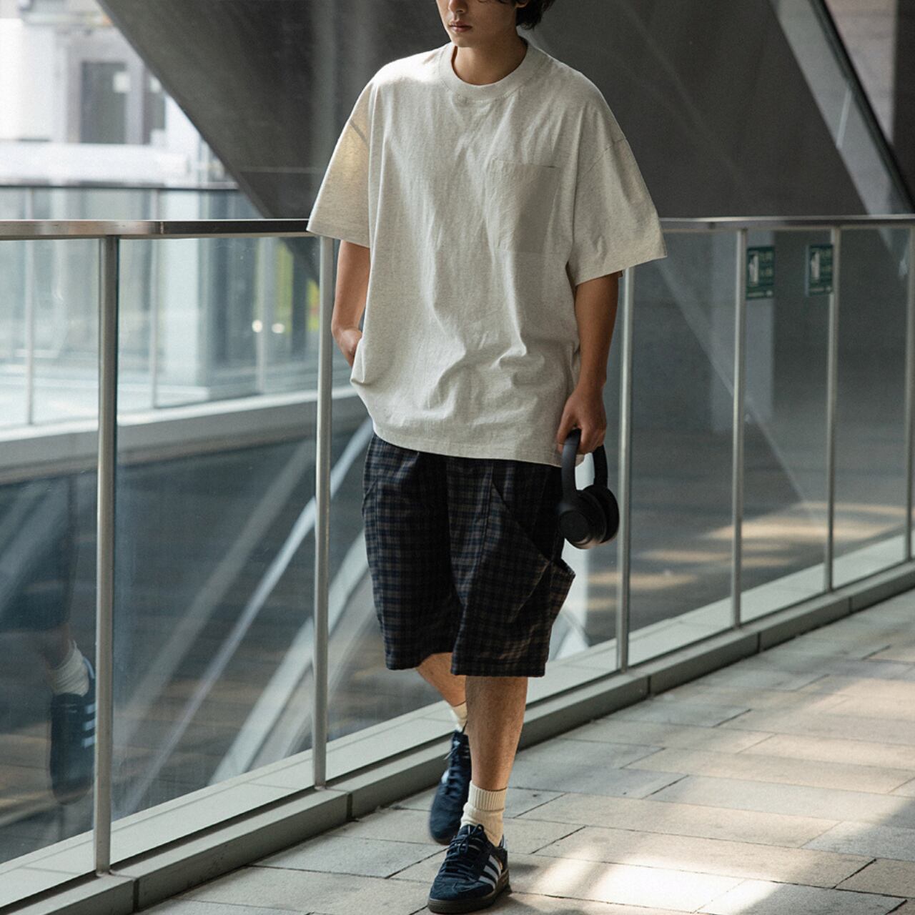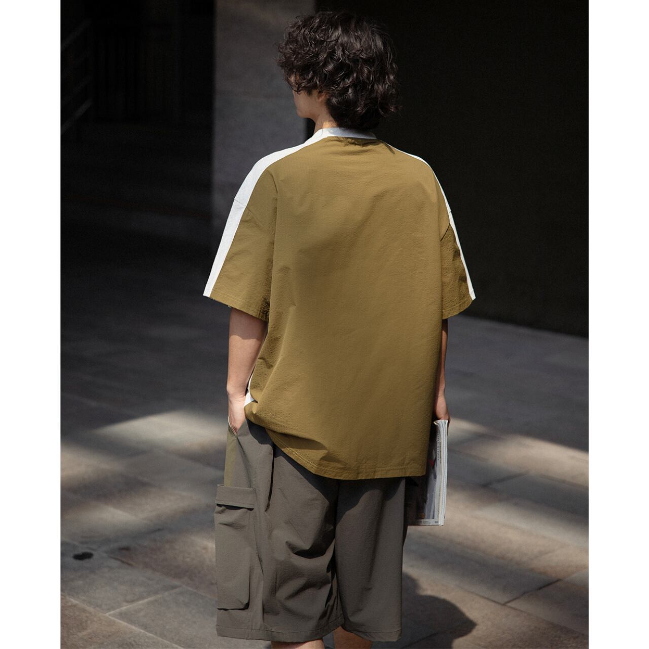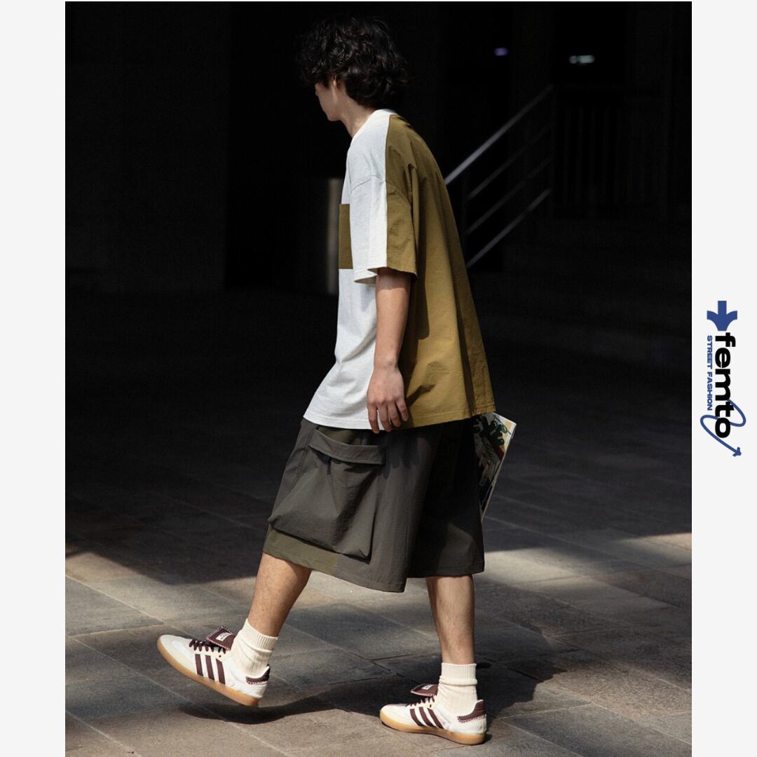 ベーシックなTシャツに異素材のポケットとバックの切り替えをプラスし、シンプルながらも遊び心のある仕上がりに。