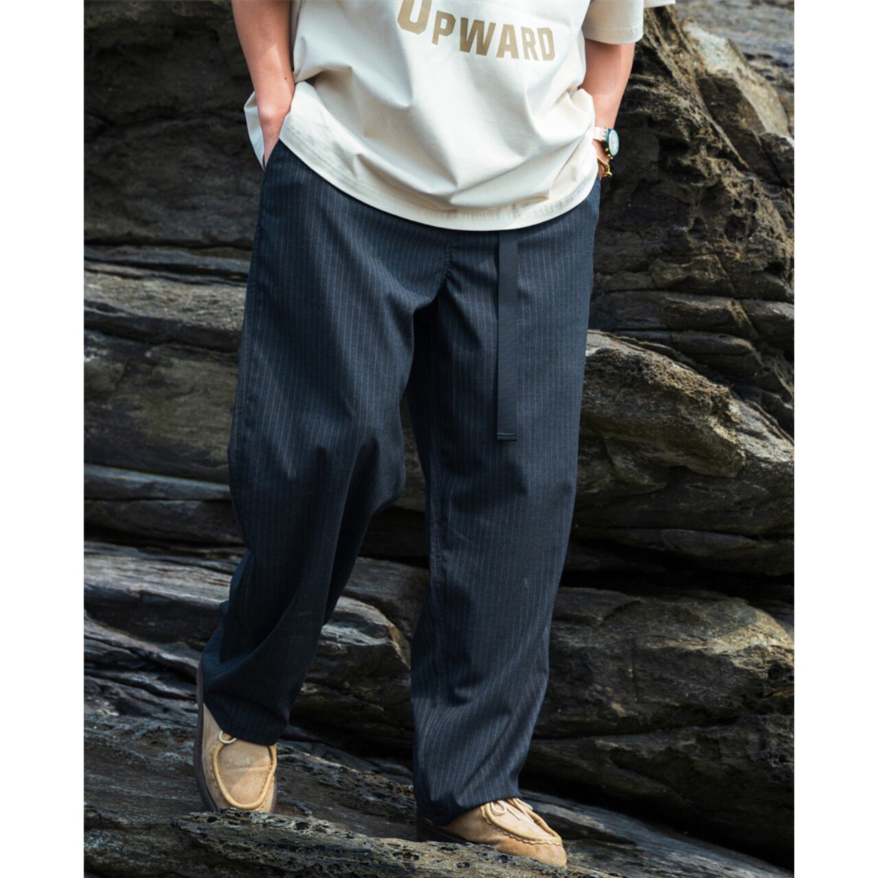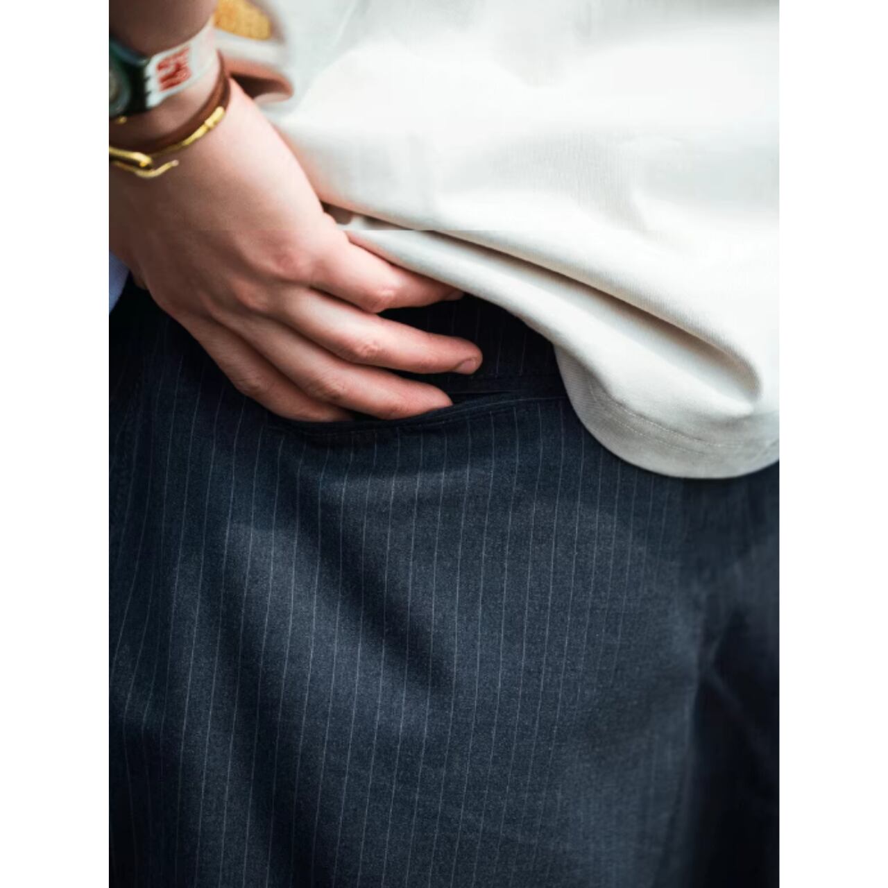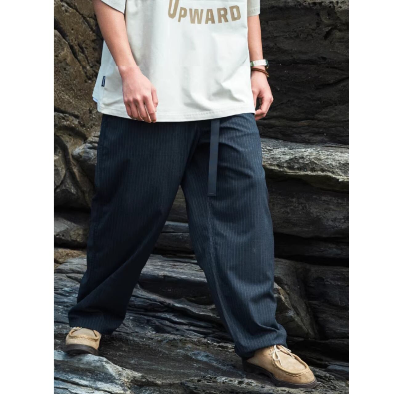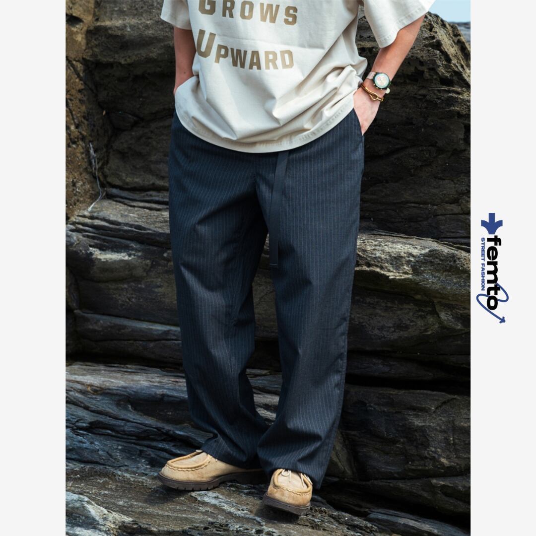 上品なピンストライプ柄とリラックス感のあるシルエットが魅力のワイドパンツ。