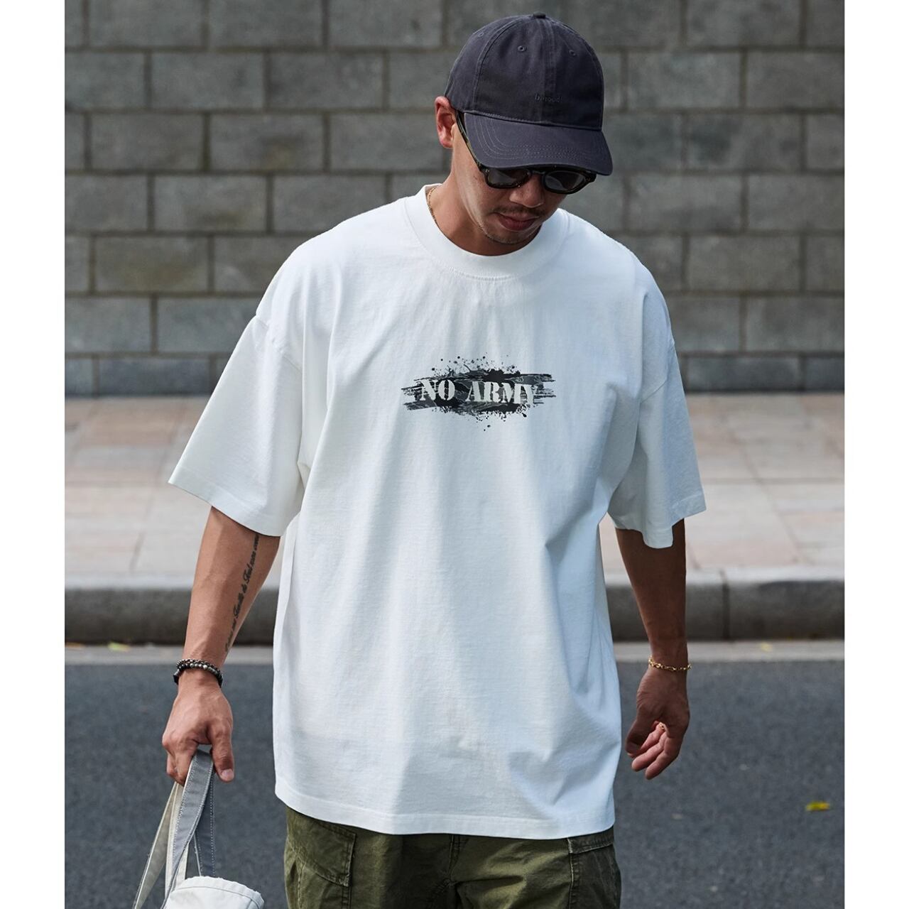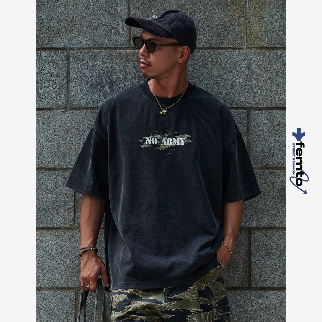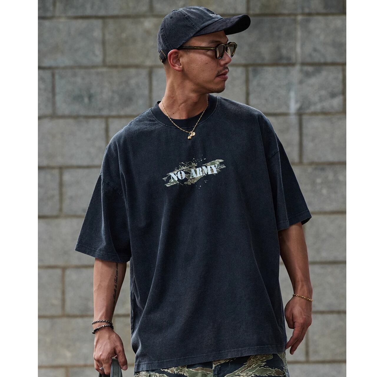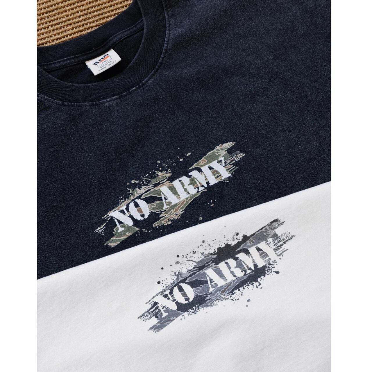 中央に配置された「NO ARMY」プリントがスタイリングのアクセントに。