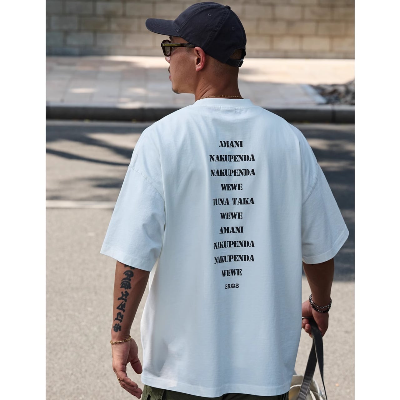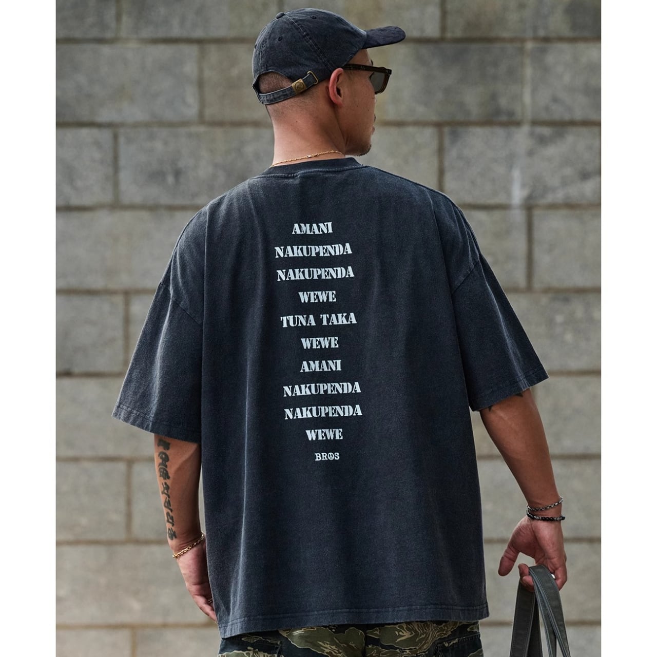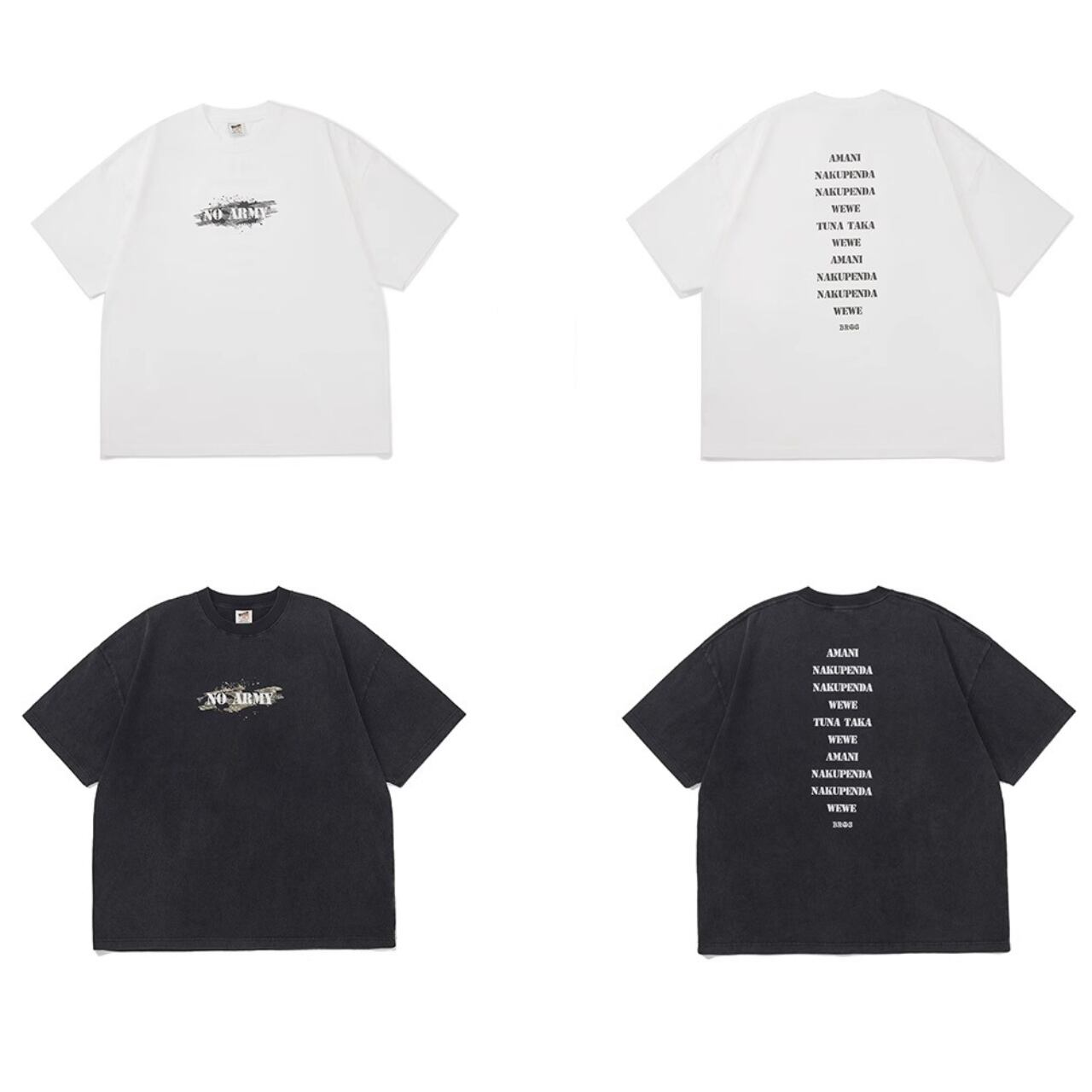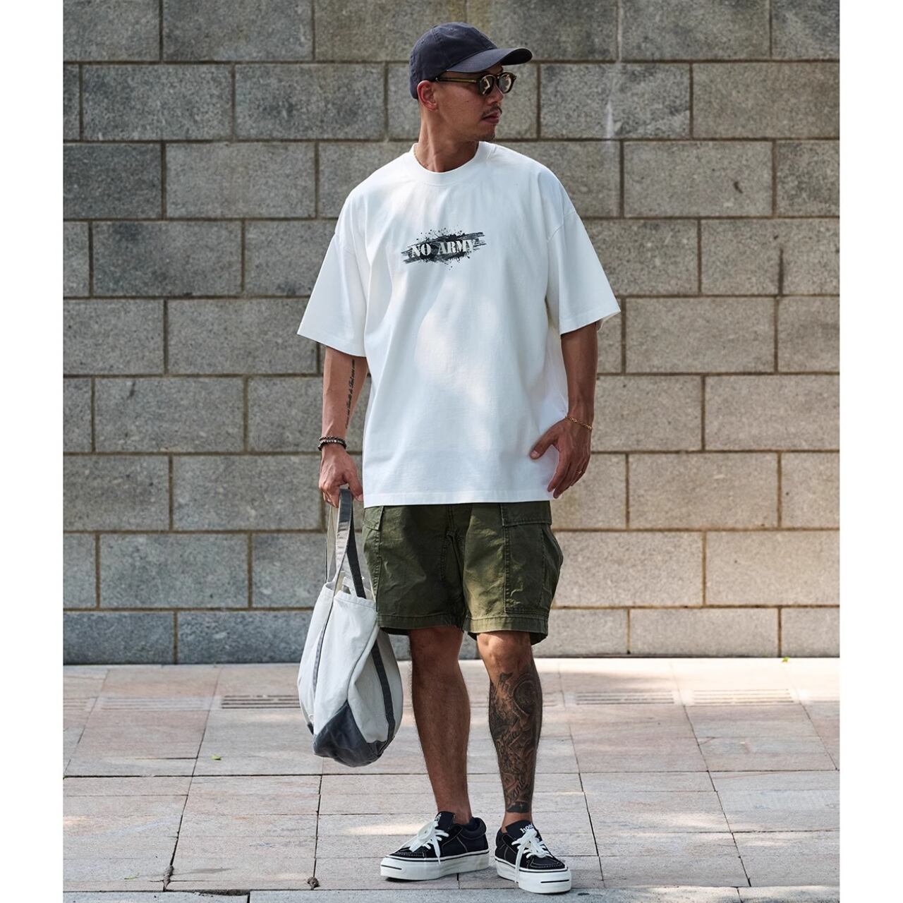 中央に配置された「NO ARMY」プリントがスタイリングのアクセントに。