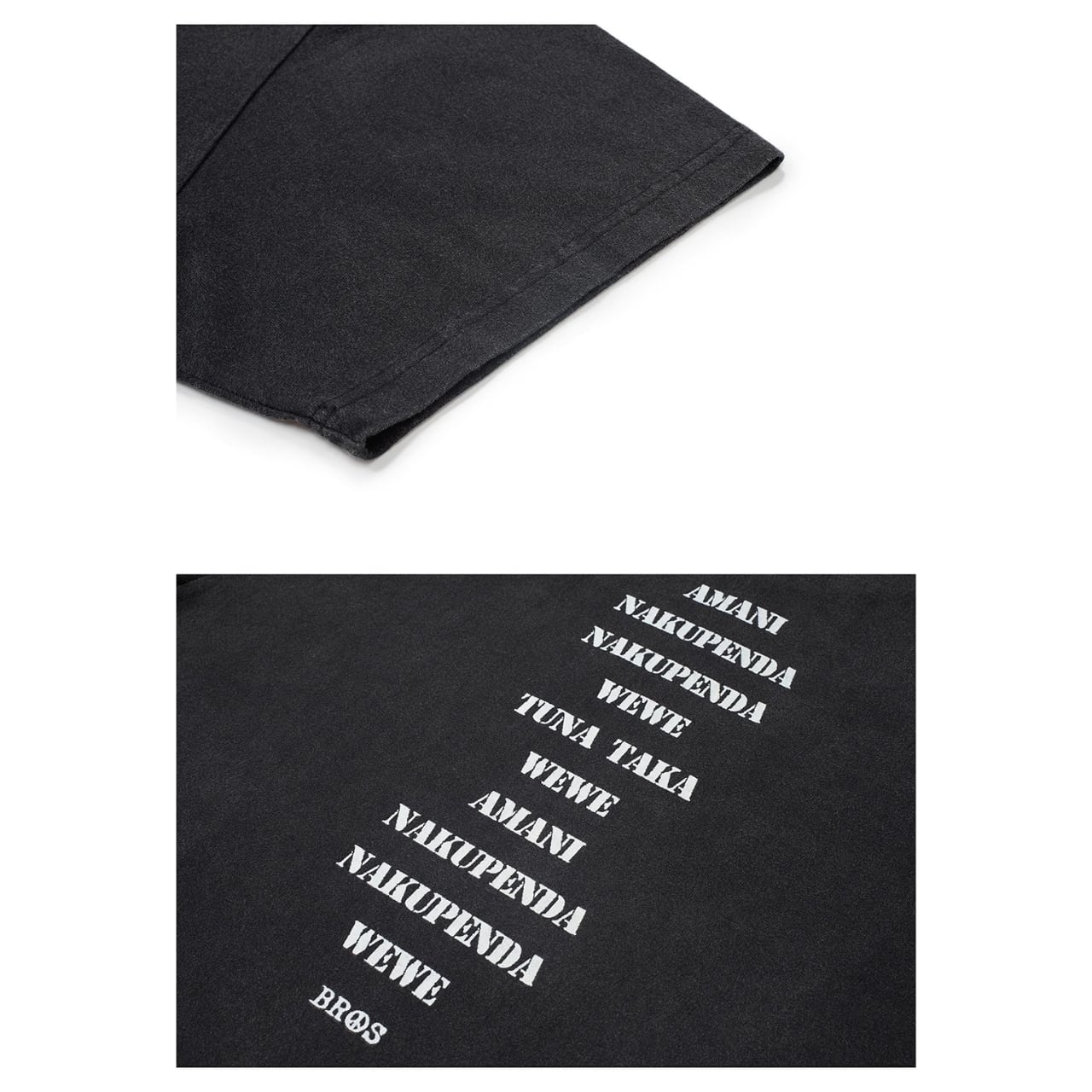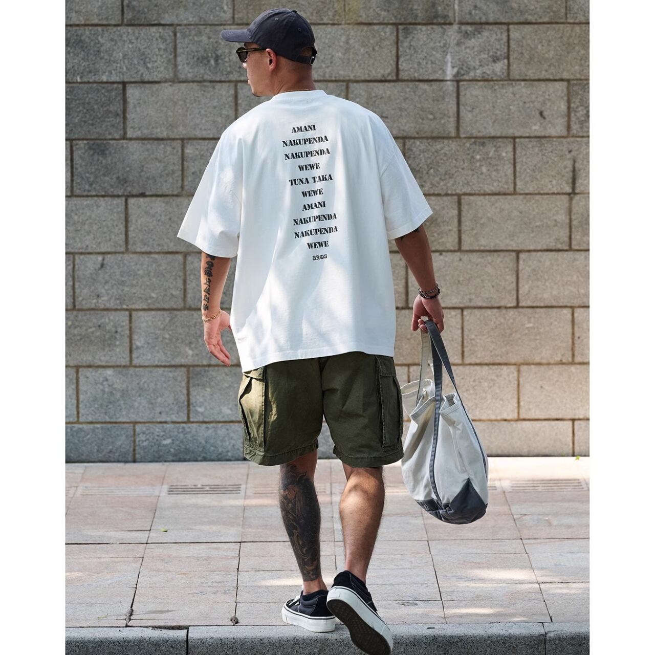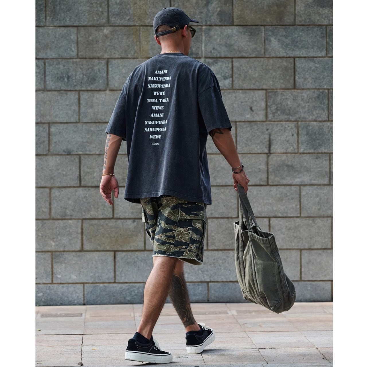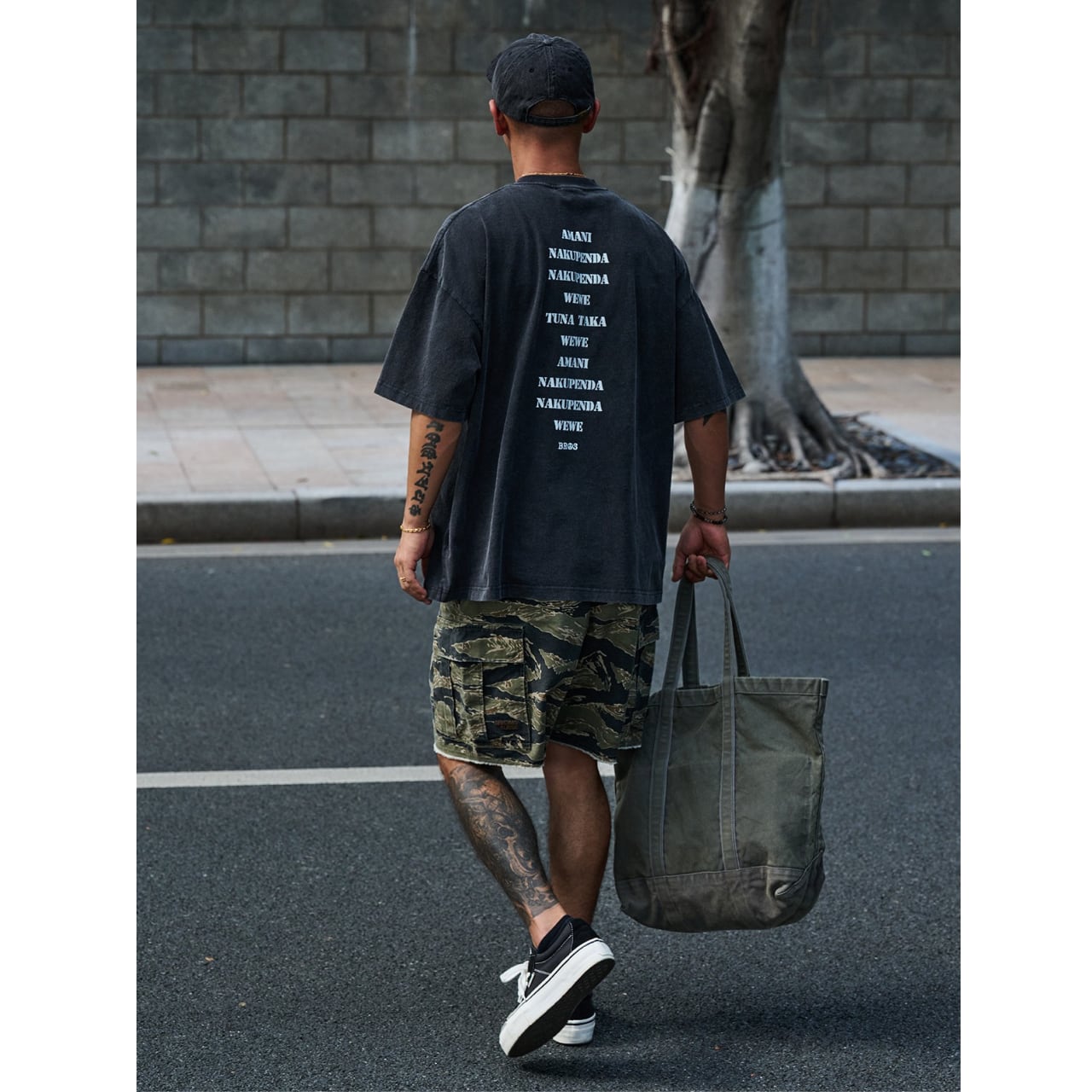 中央に配置された「NO ARMY」プリントがスタイリングのアクセントに。