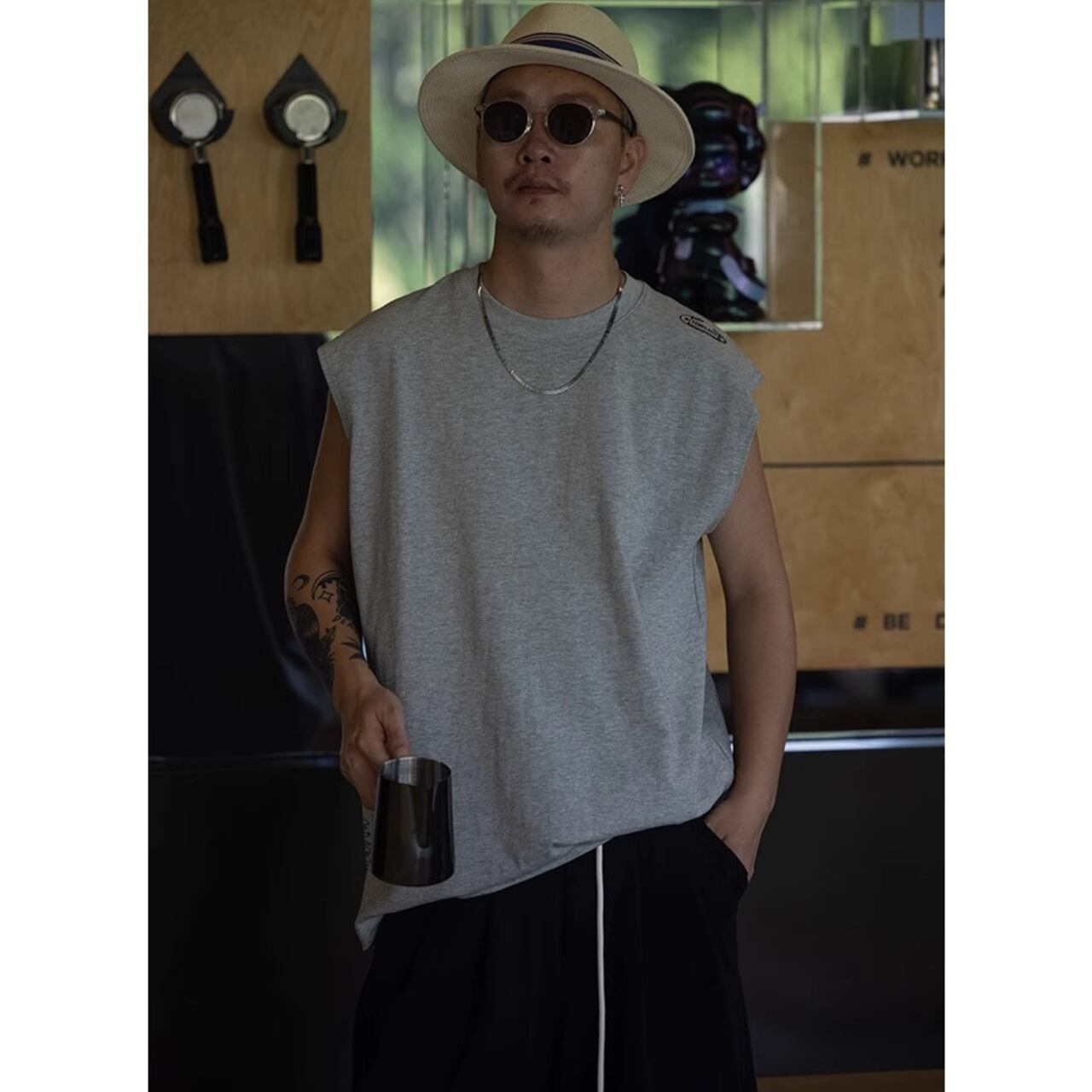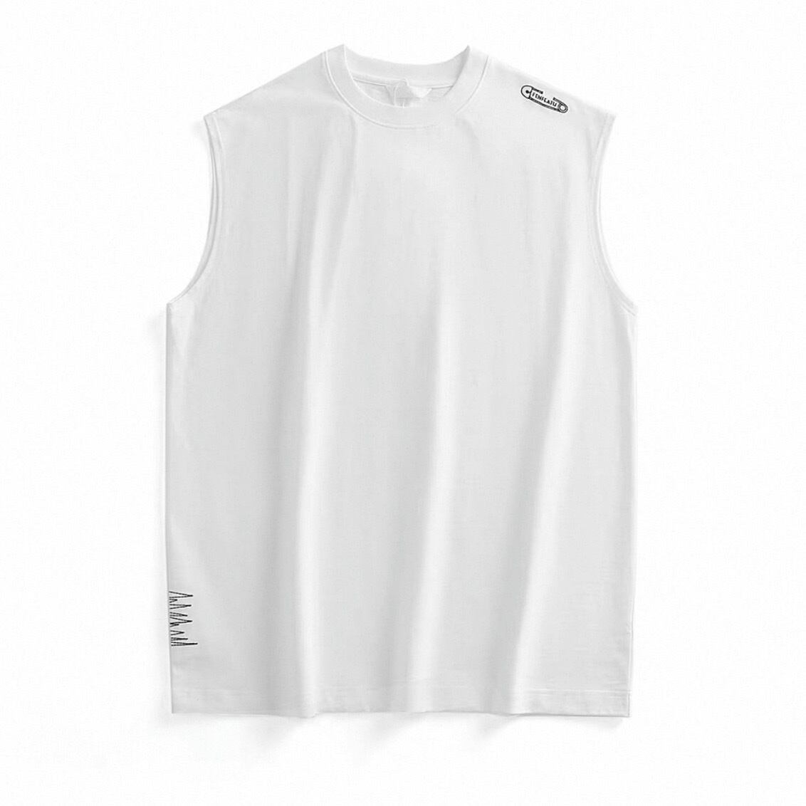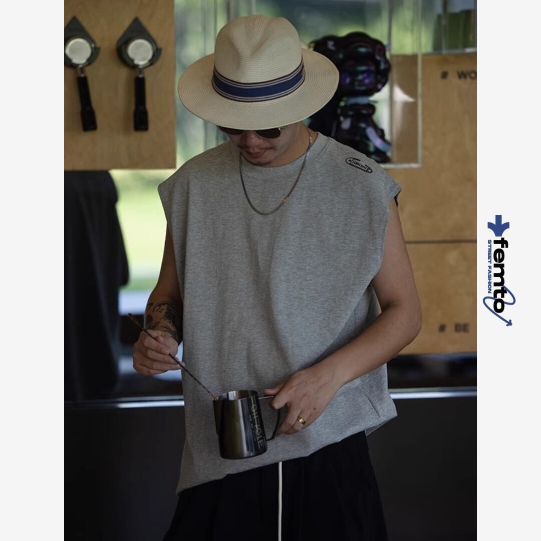 シンプルながらも肩元と裾にロゴを効かせたデザインで、ストリート感を演出するノースリーブトップス。