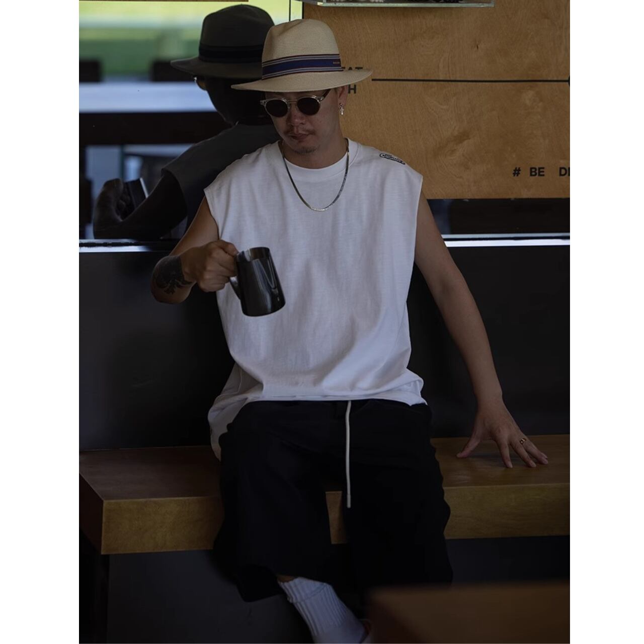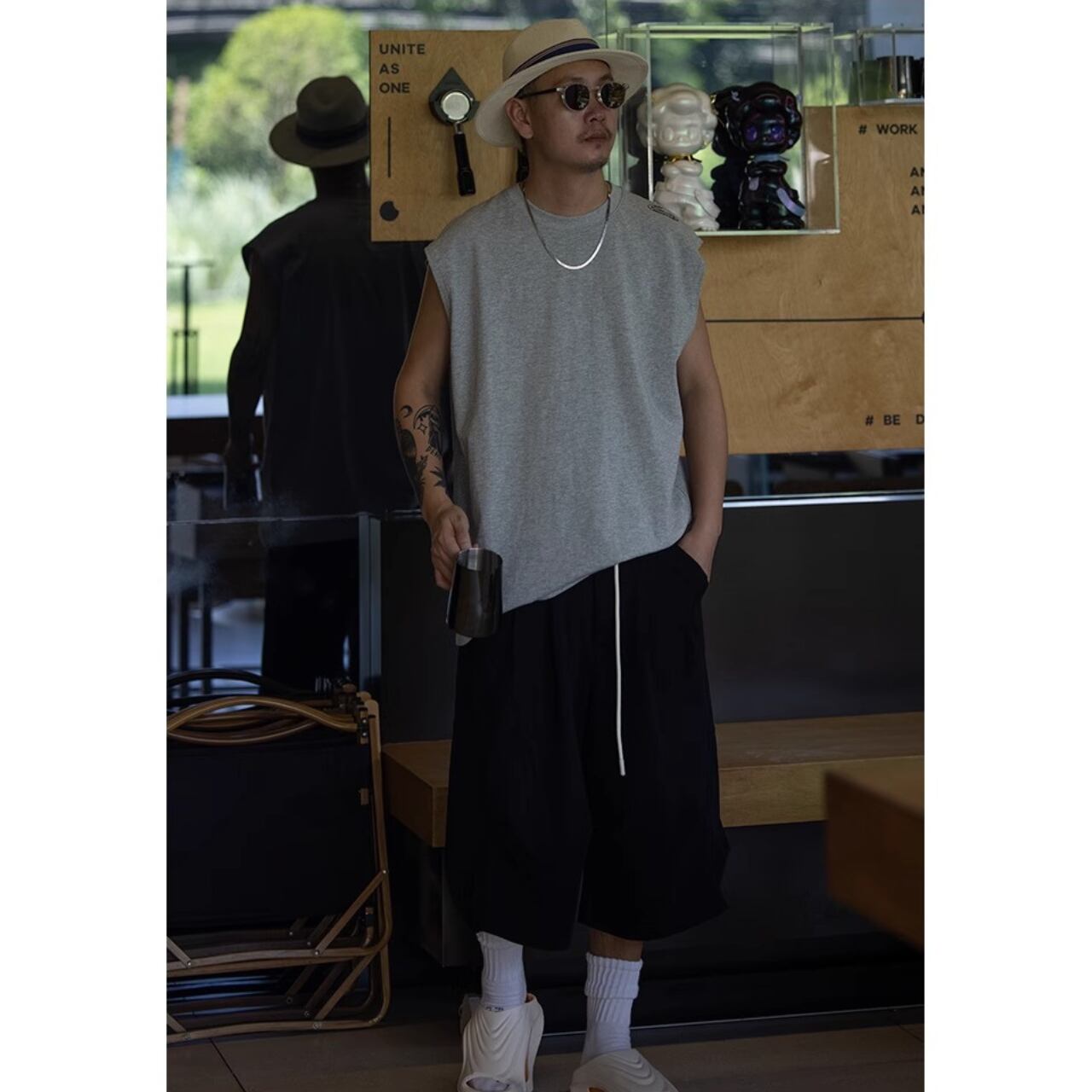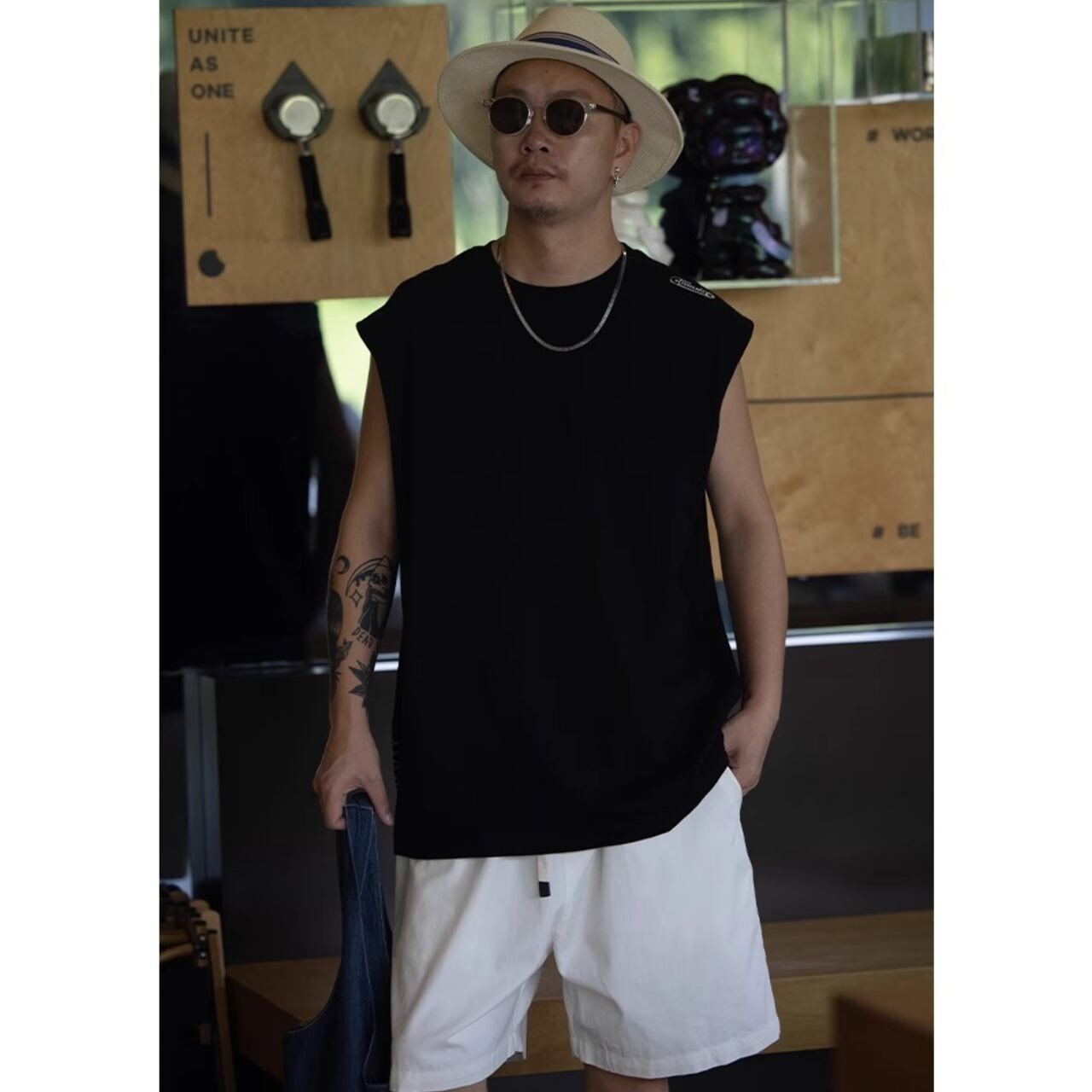 シンプルながらも肩元と裾にロゴを効かせたデザインで、ストリート感を演出するノースリーブトップス。
