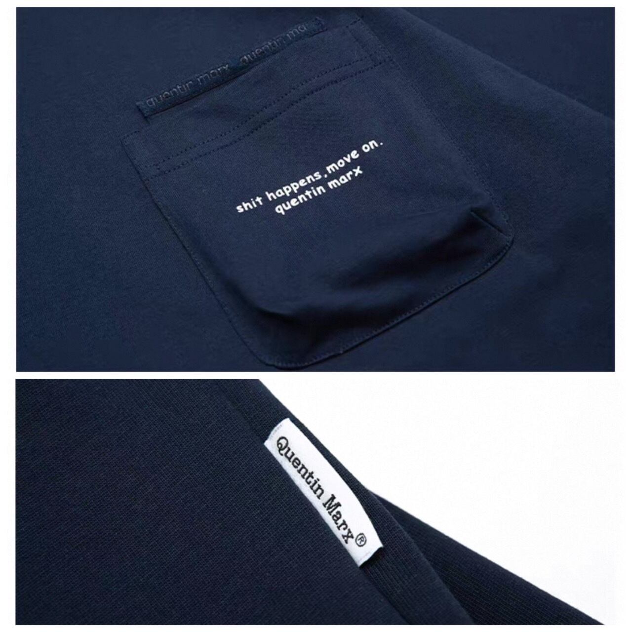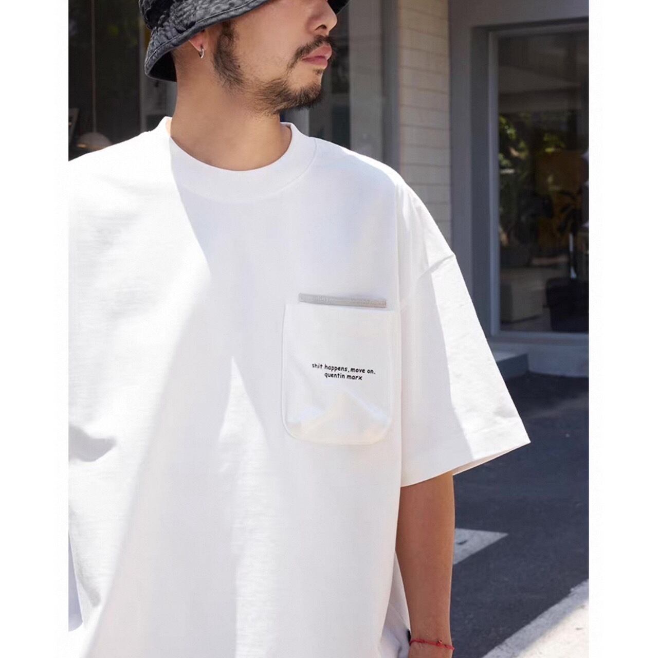 フロントポケットにシンプルなメッセージを配した、遊び心のあるデザインが魅力のTシャツ。