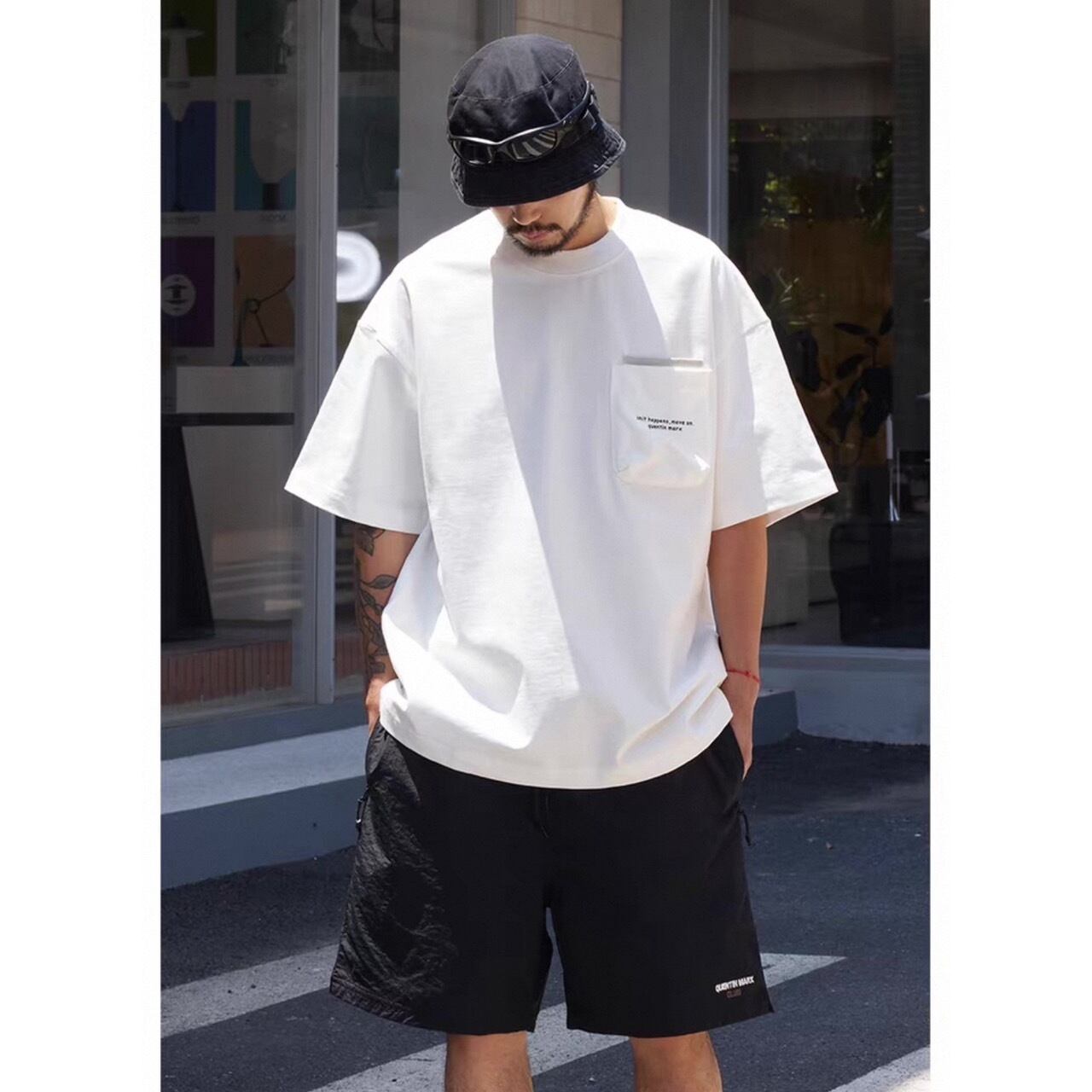 帽子やサングラスなどの小物と合わせて、シンプルながらも完成度の高いコーデに仕上がります。