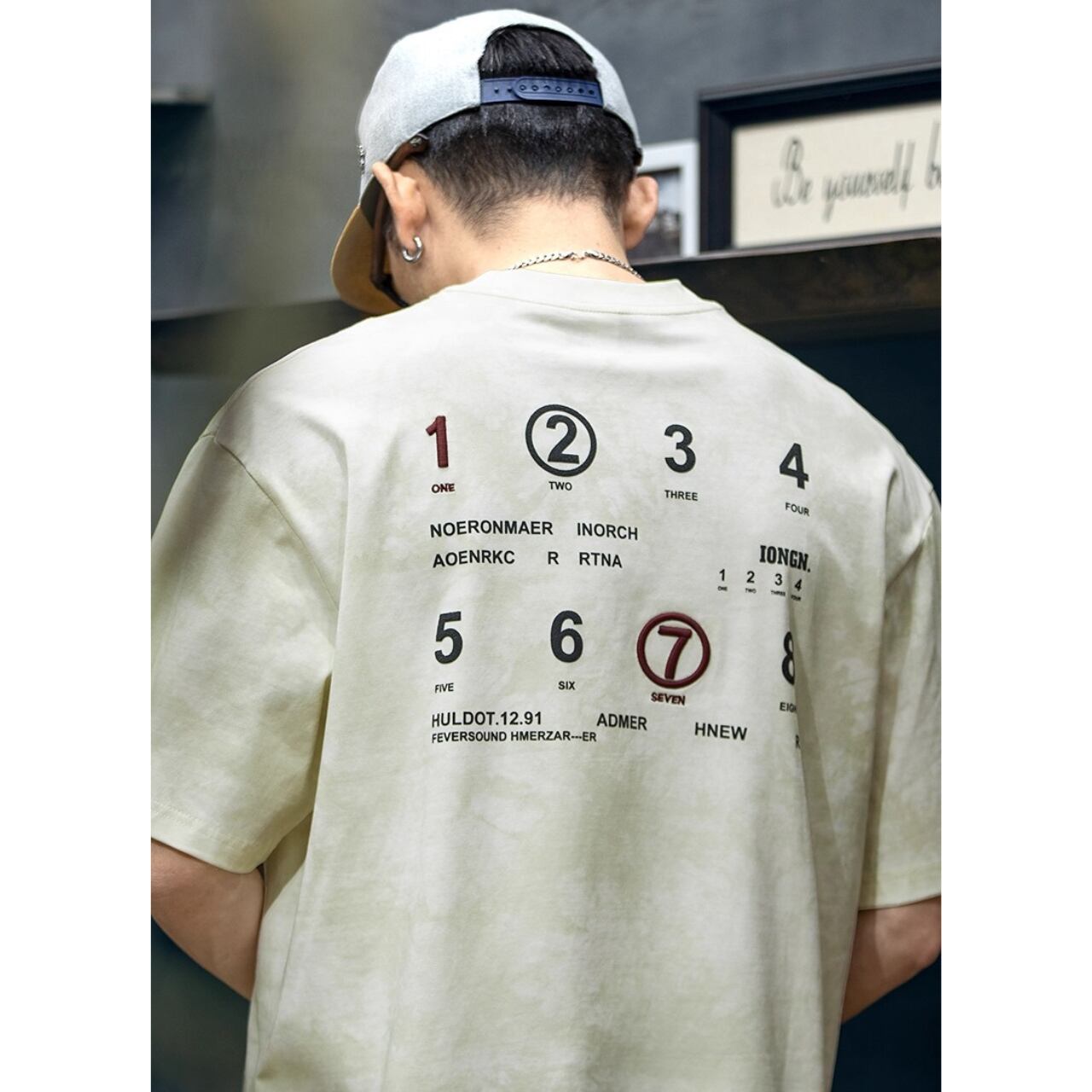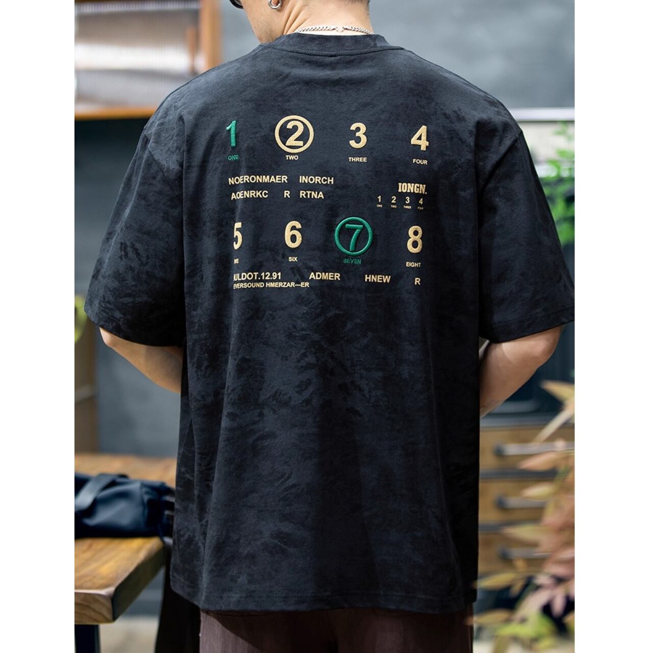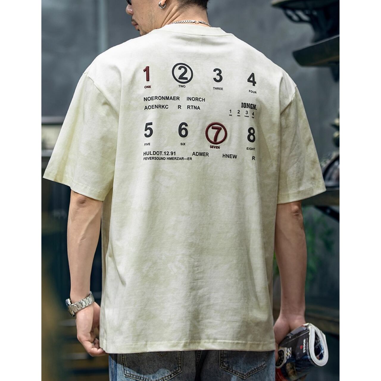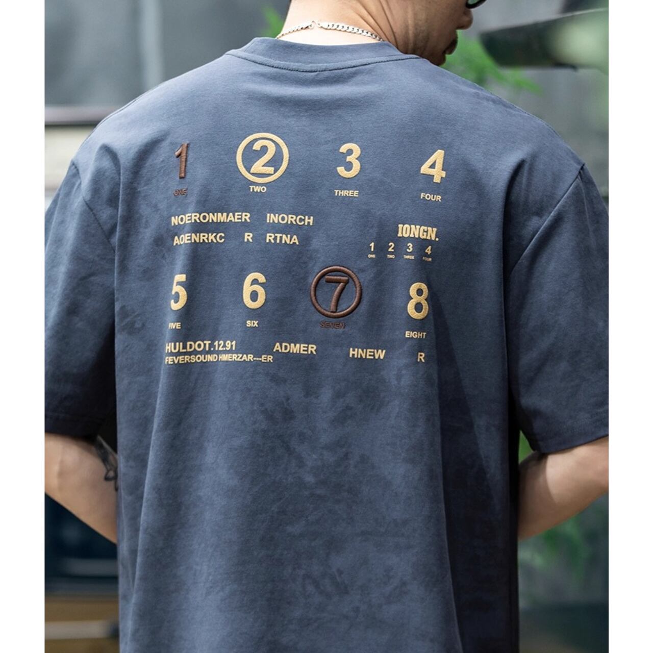 遊び心あるナンバリングデザインが目を惹く、バックプリントTシャツ。