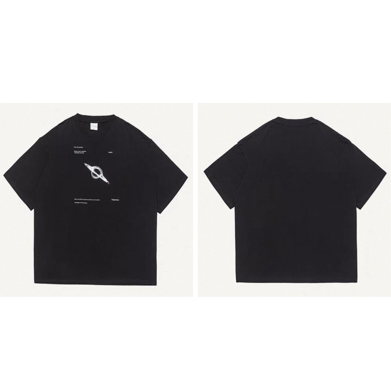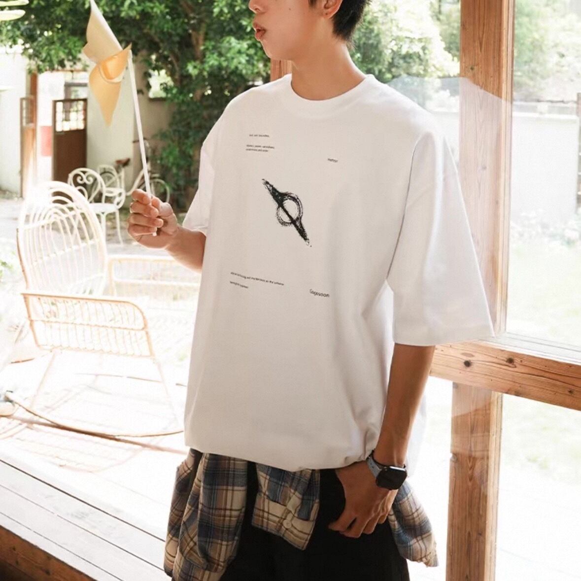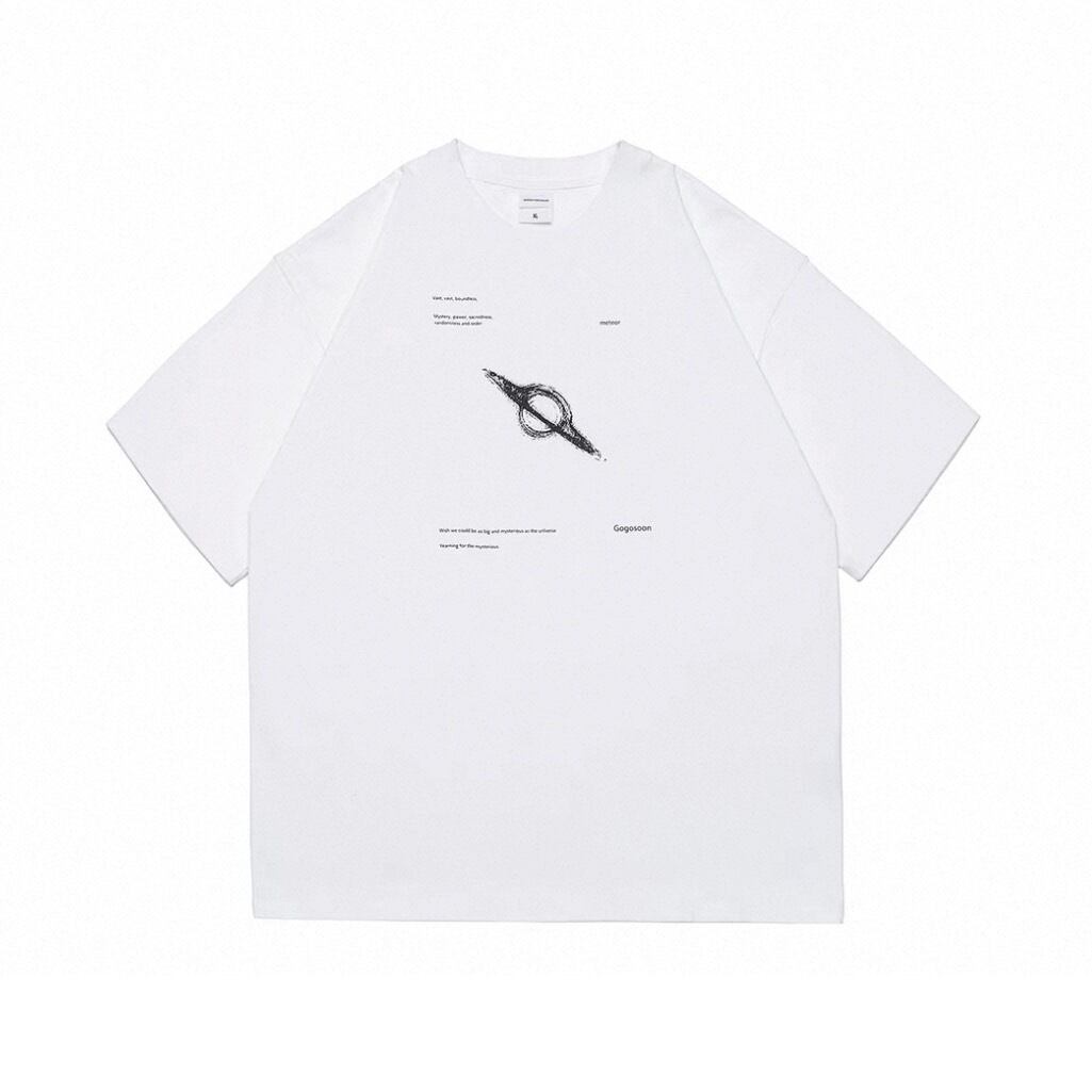 中央には惑星の軌道を思わせるデザインがプリントされ、シンプルながらも視線を集める1枚です。