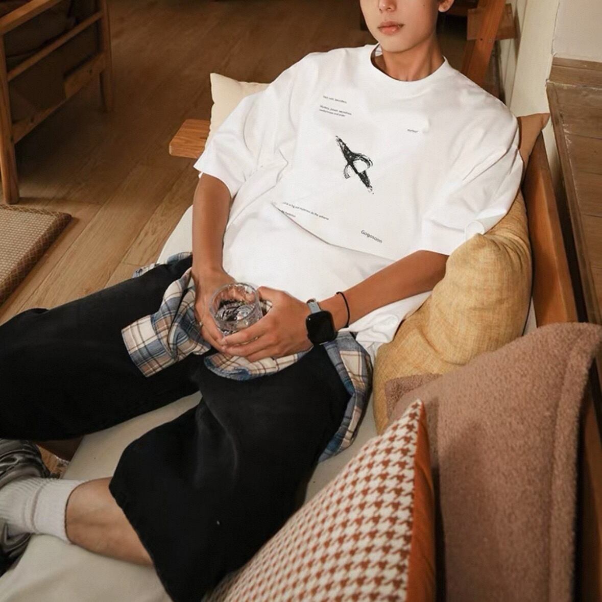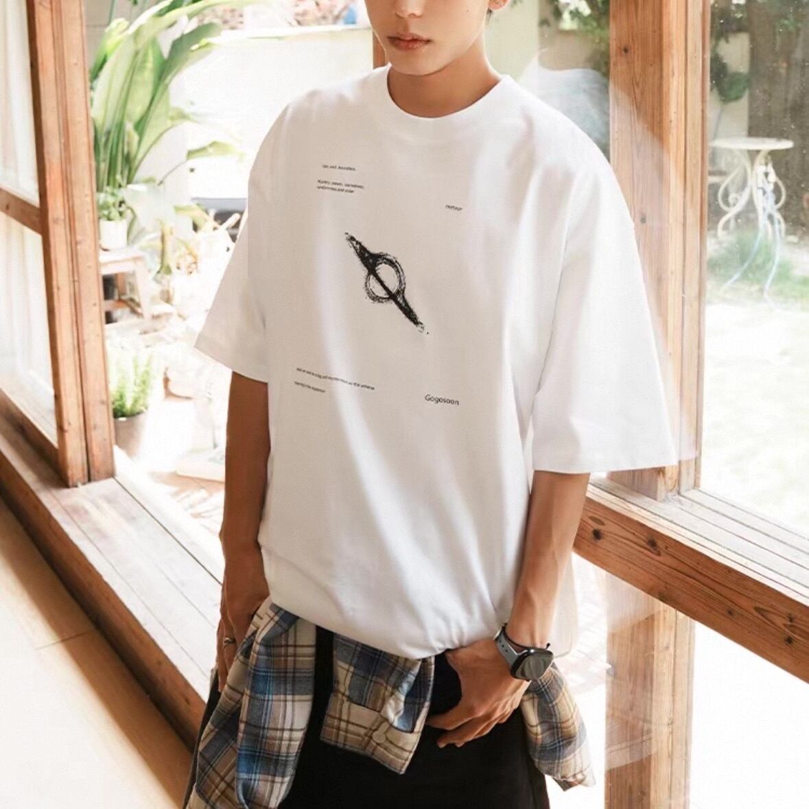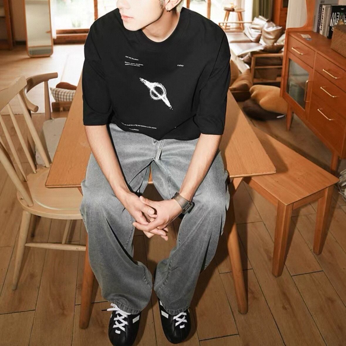 中央には惑星の軌道を思わせるデザインがプリントされ、シンプルながらも視線を集める1枚です。