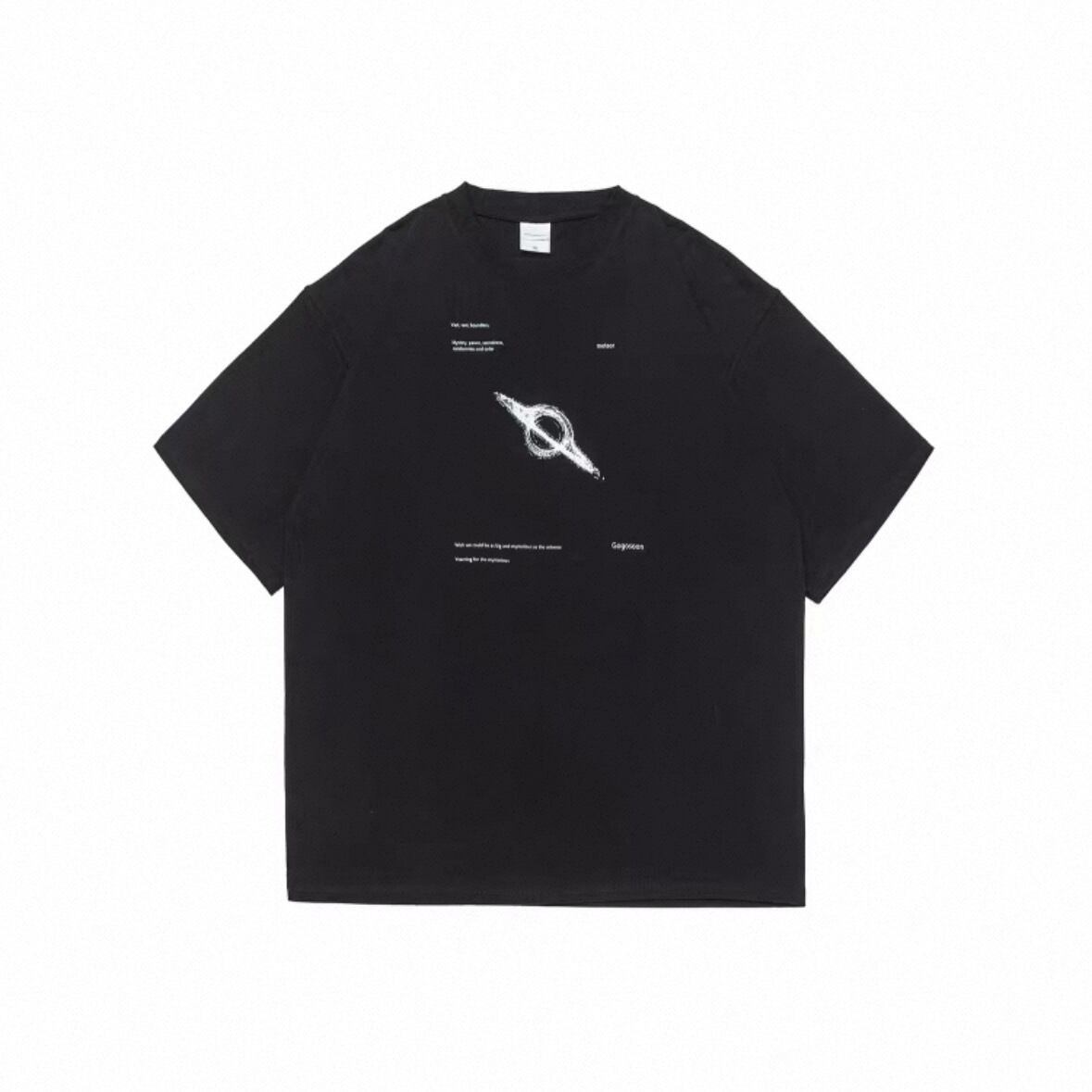 宇宙をテーマにした独創的なグラフィックが印象的なTシャツ。