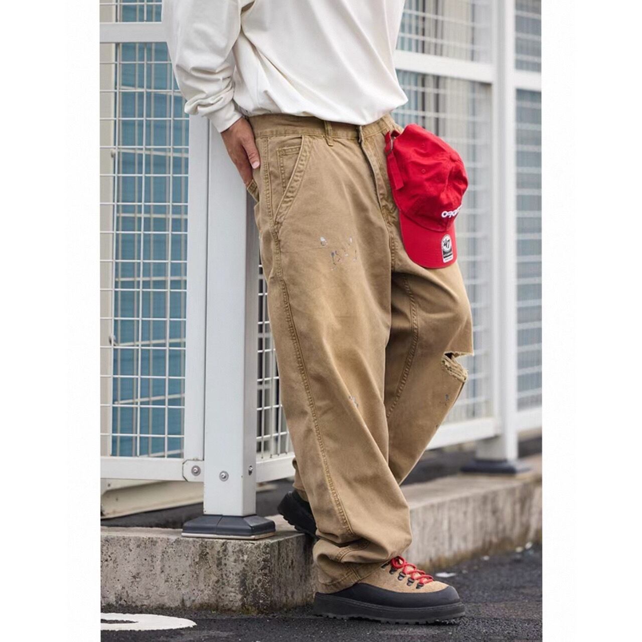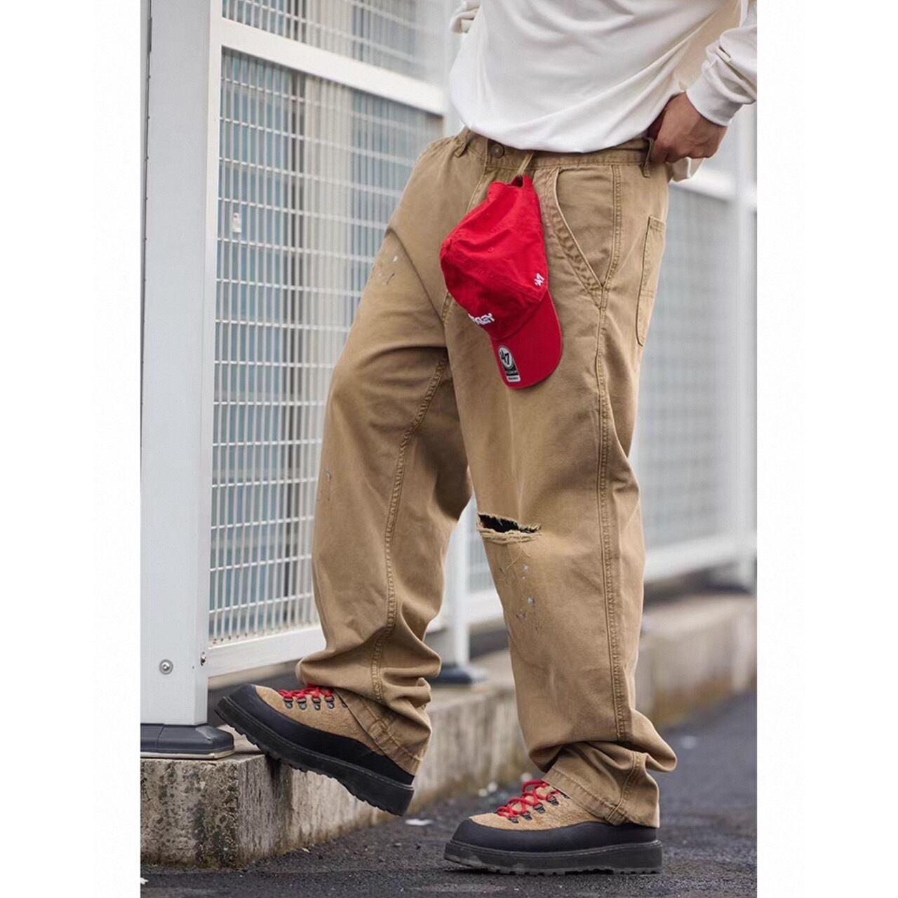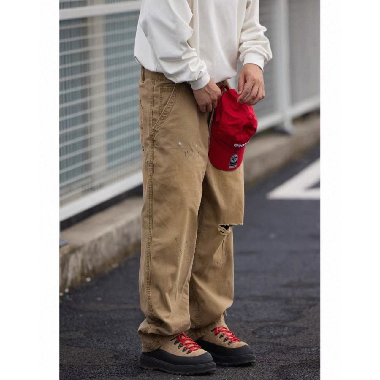 ひざ部分のダメージやペイント加工がアクセントとなり、シンプルな着こなしにも抜群の存在感を発揮します。