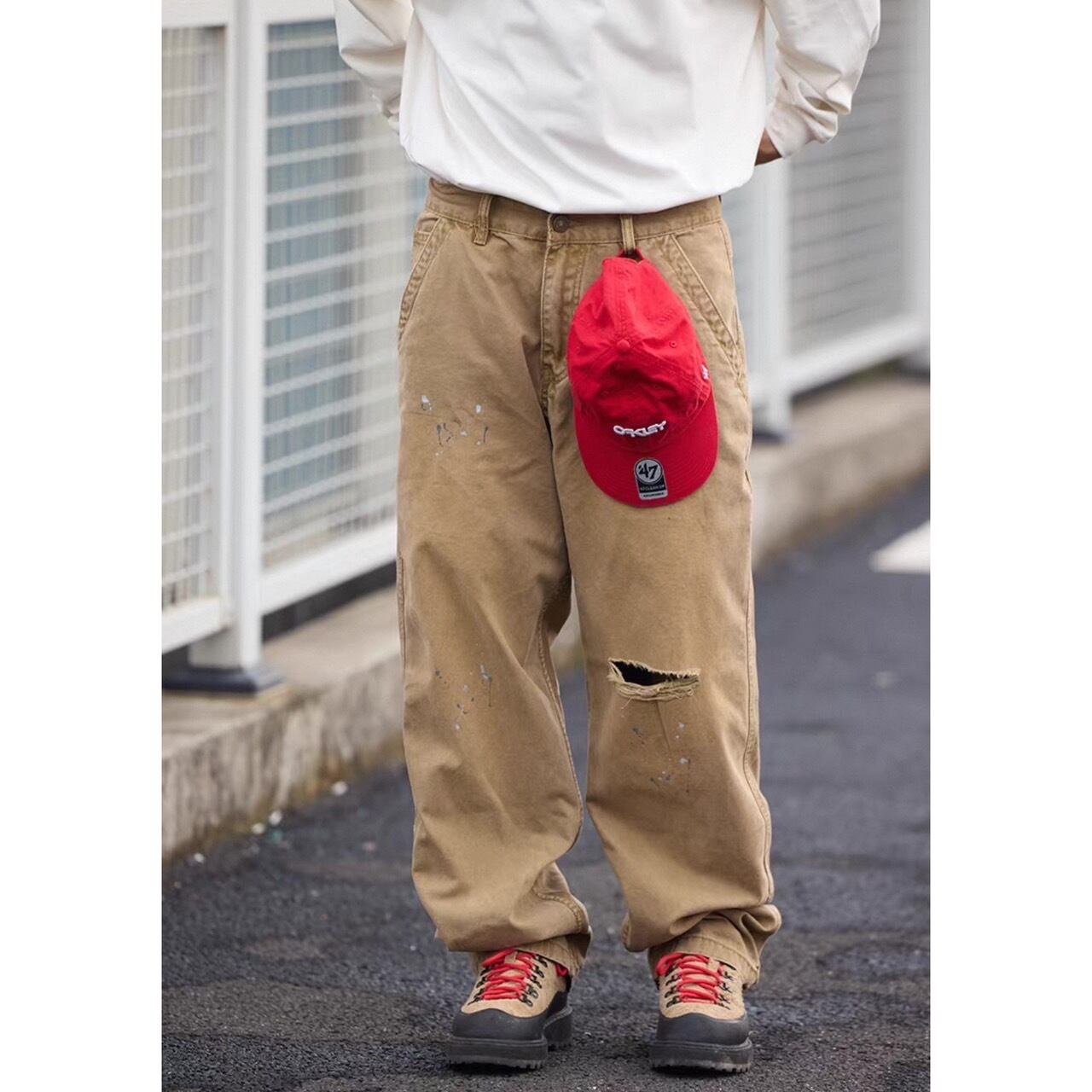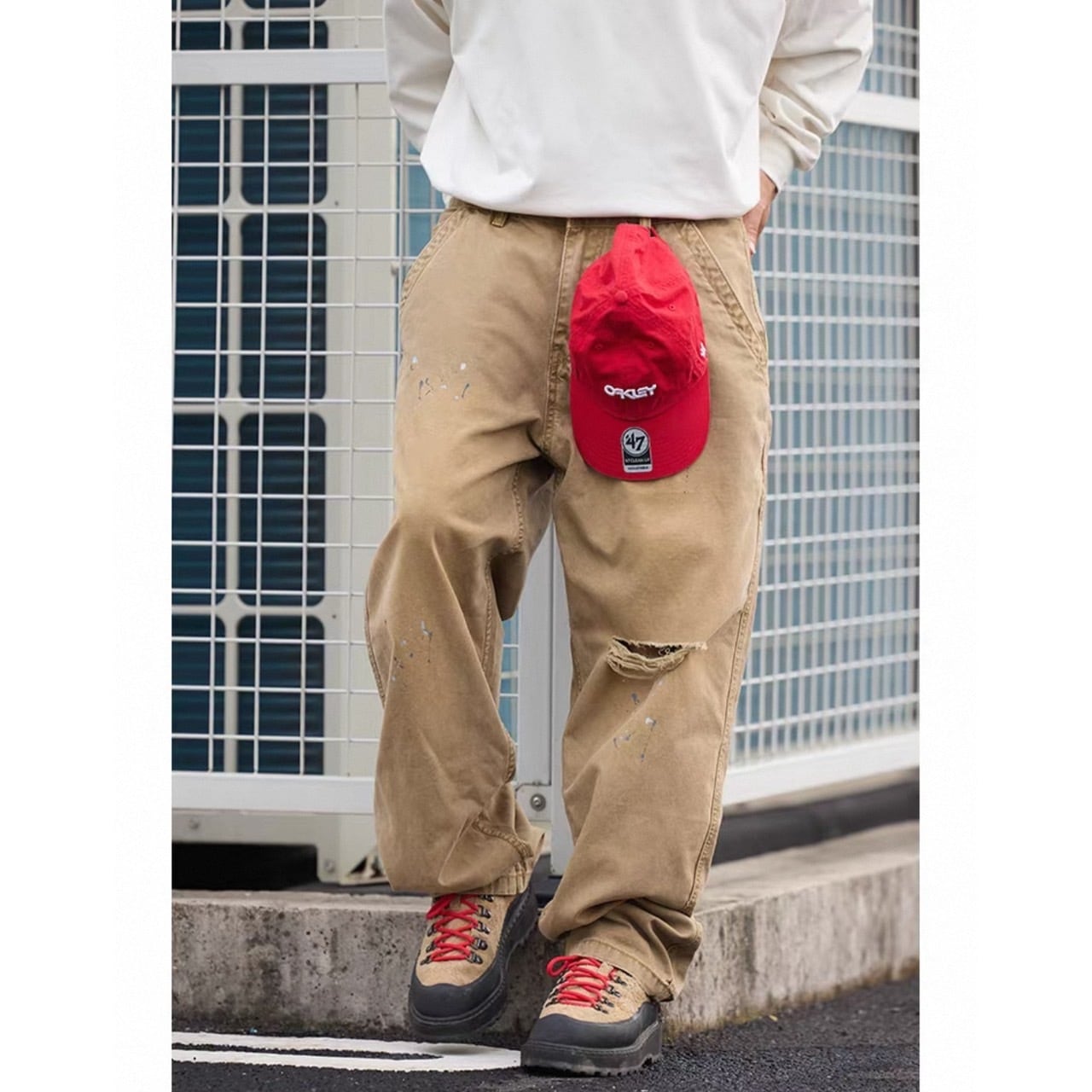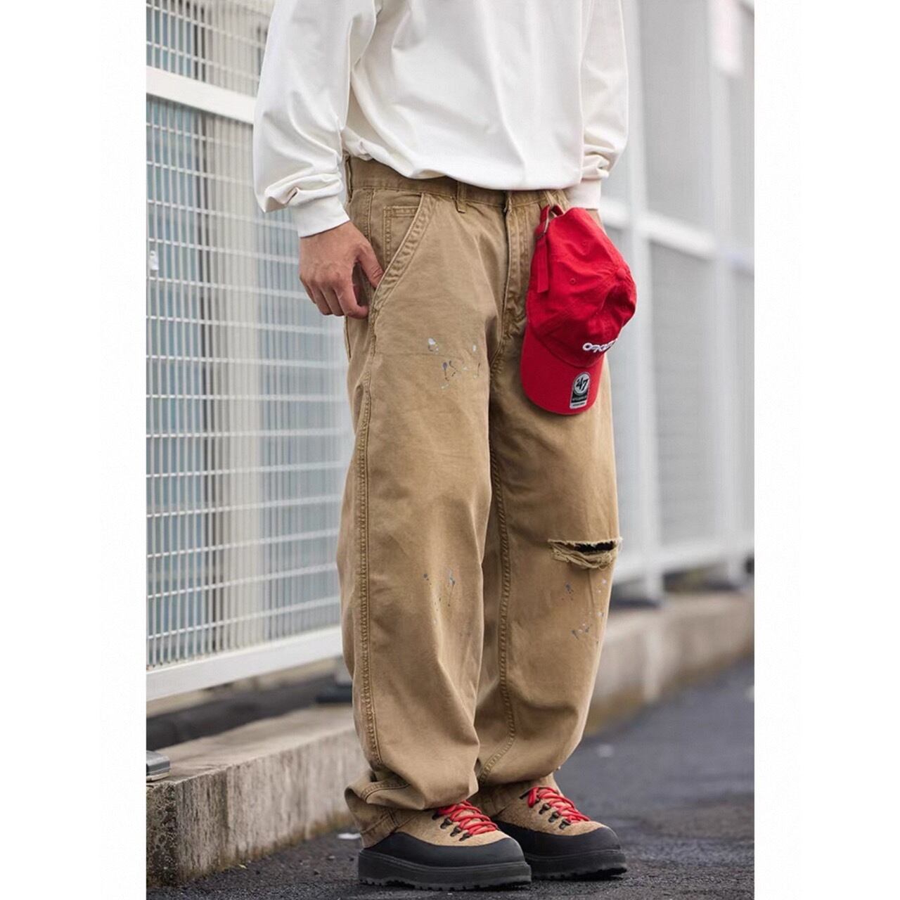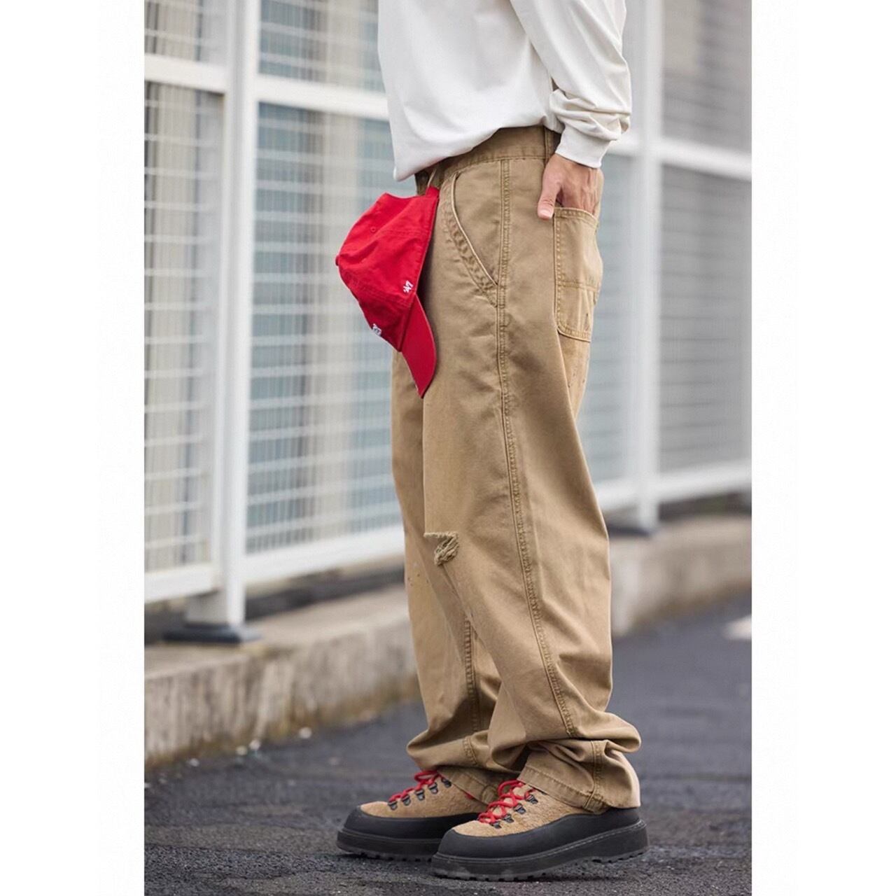ひざ部分のダメージやペイント加工がアクセントとなり、シンプルな着こなしにも抜群の存在感を発揮します。