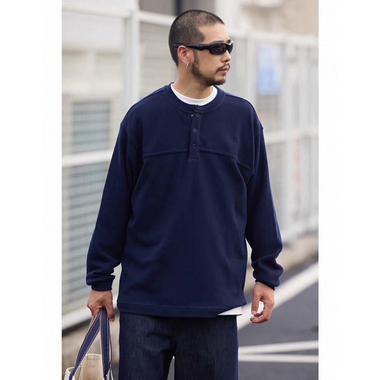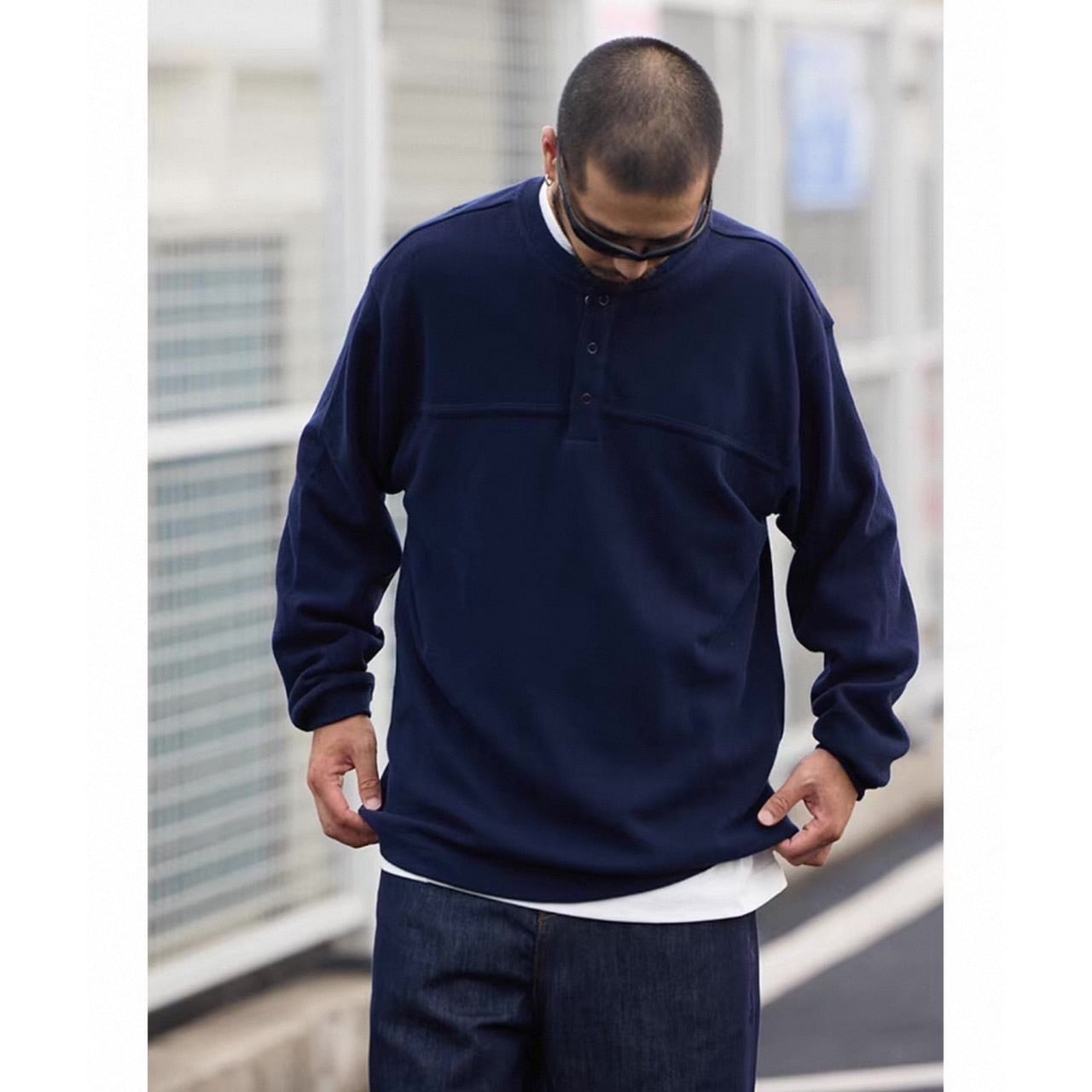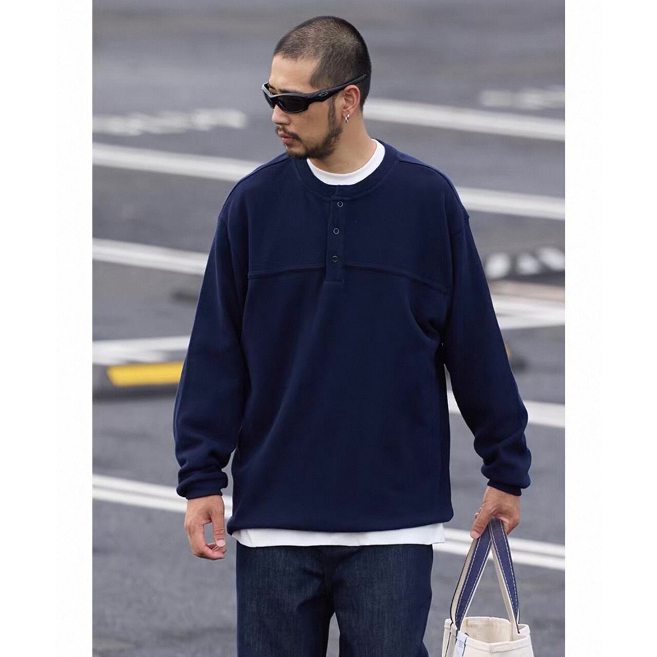 フロントのボタンデザインがポイントのヘンリーネックプルオーバー。