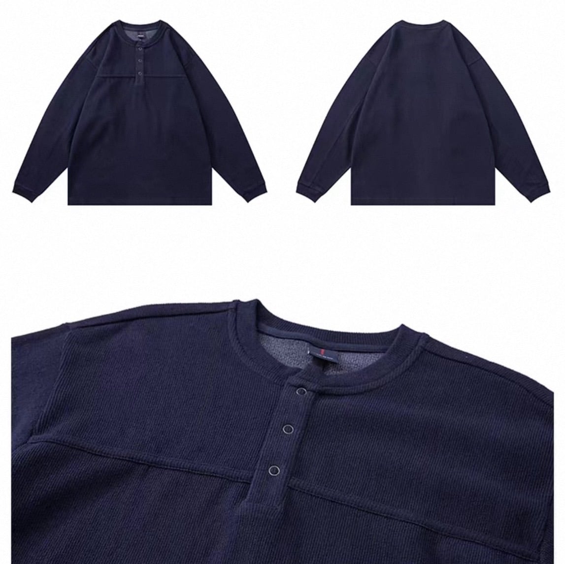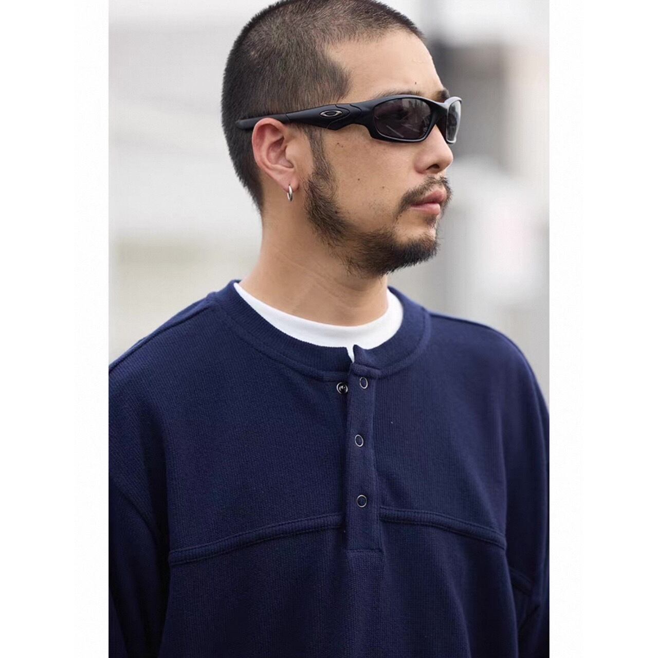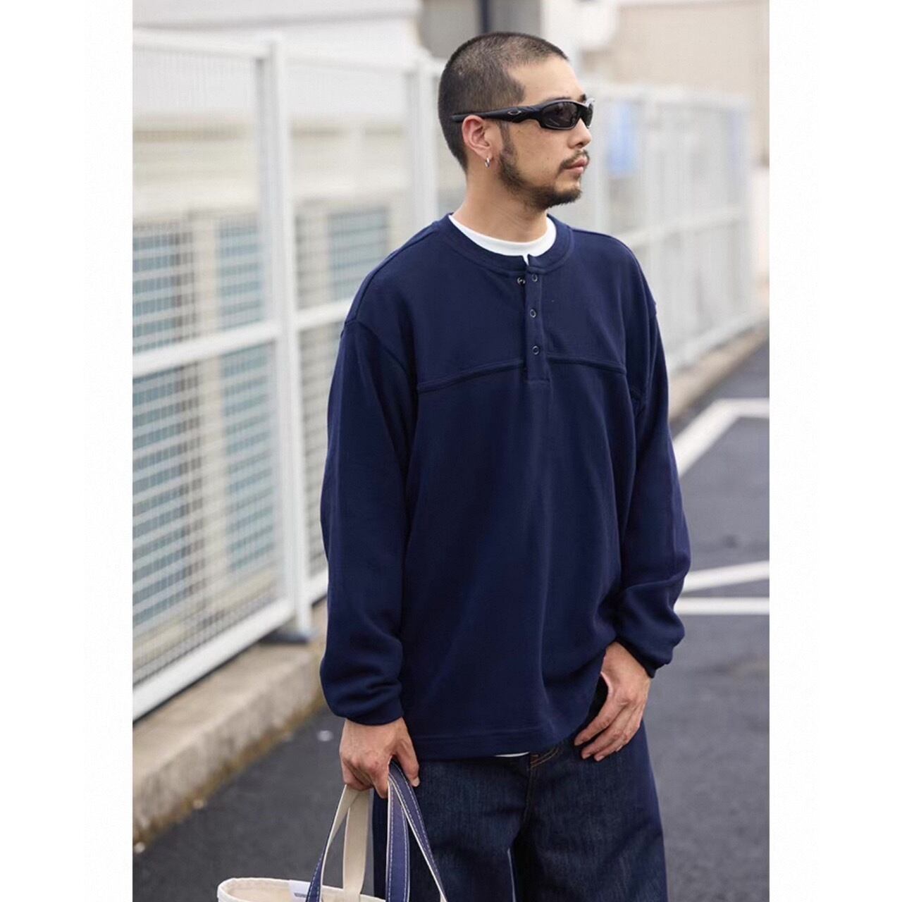 フロントのボタンデザインがポイントのヘンリーネックプルオーバー。
