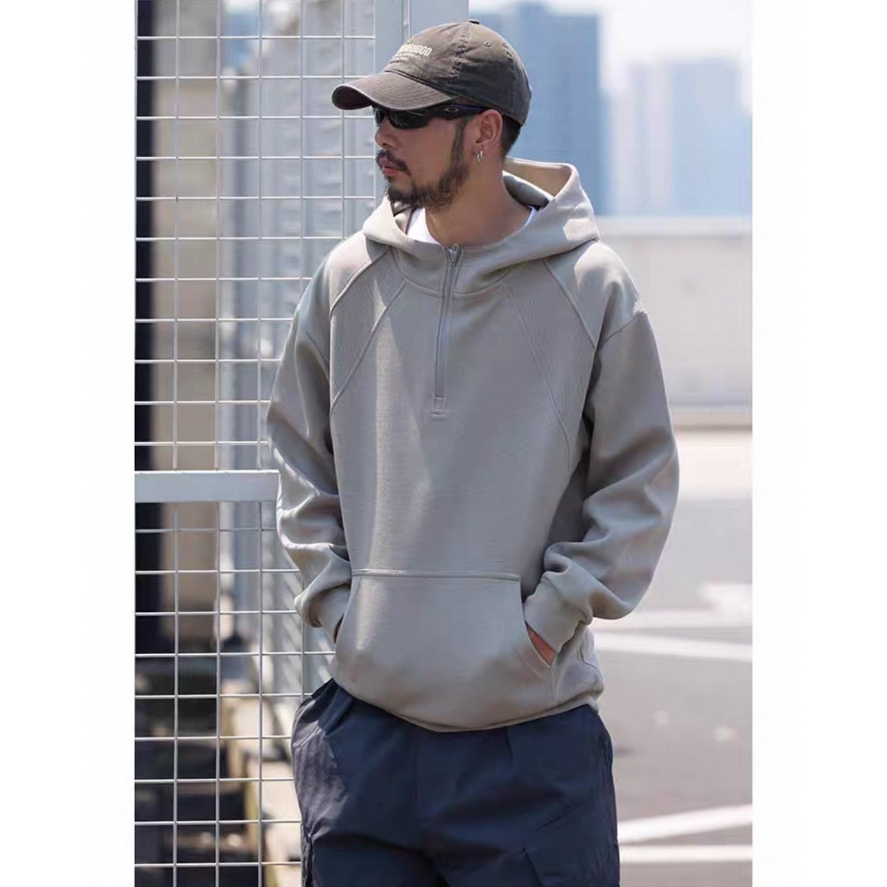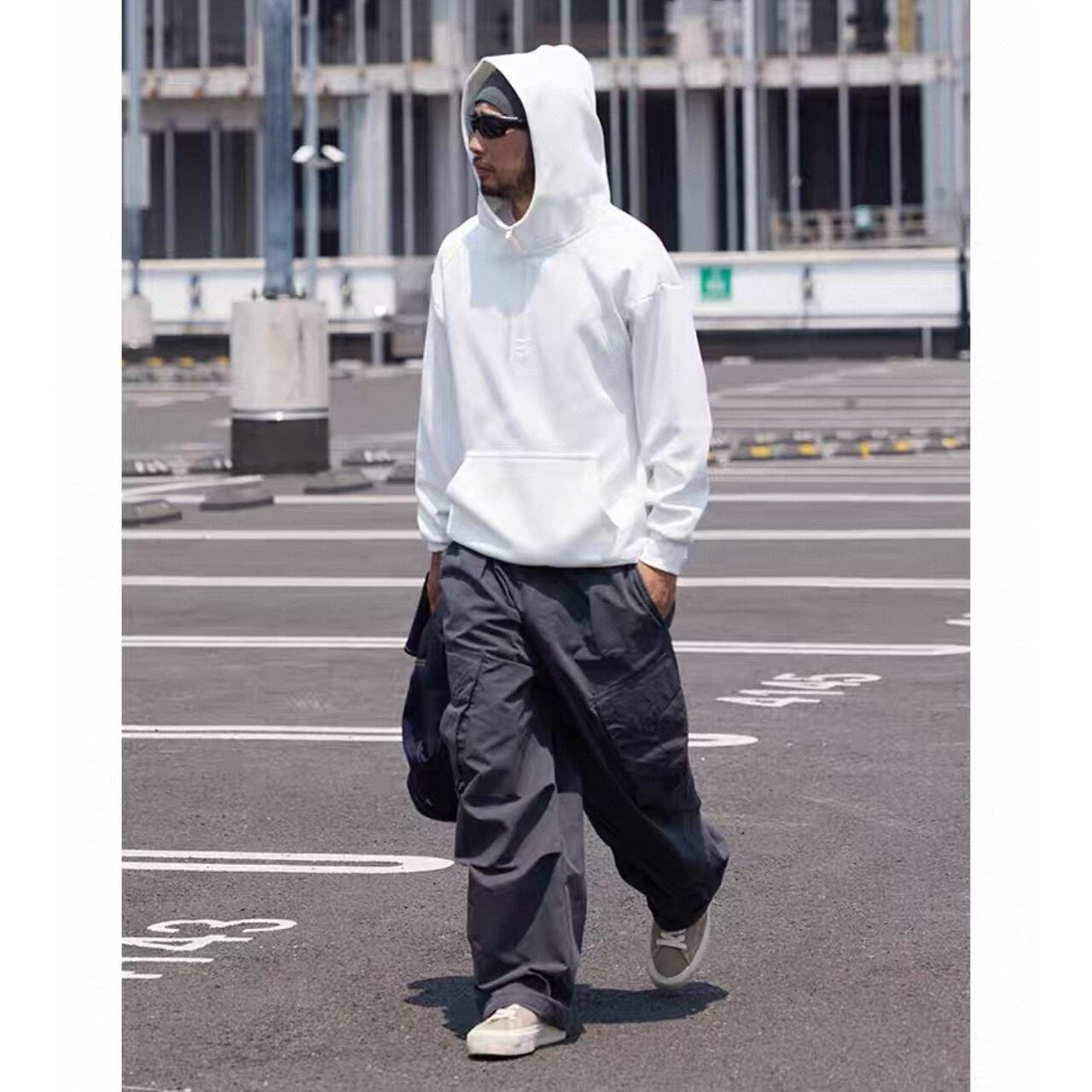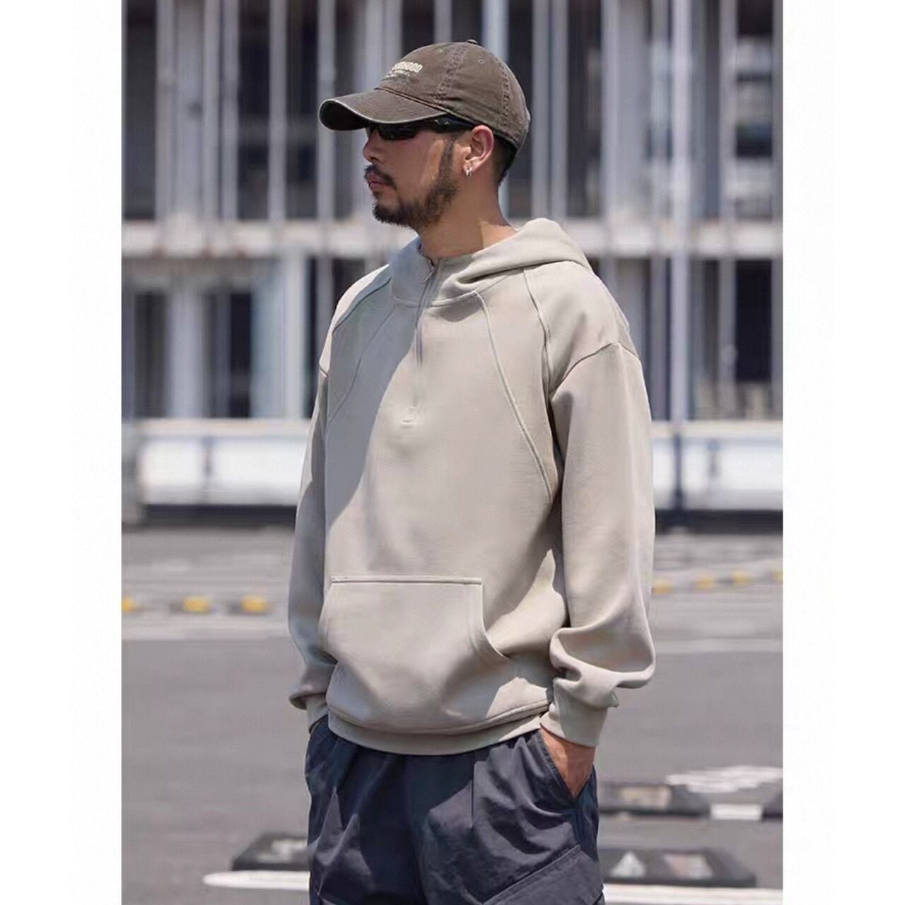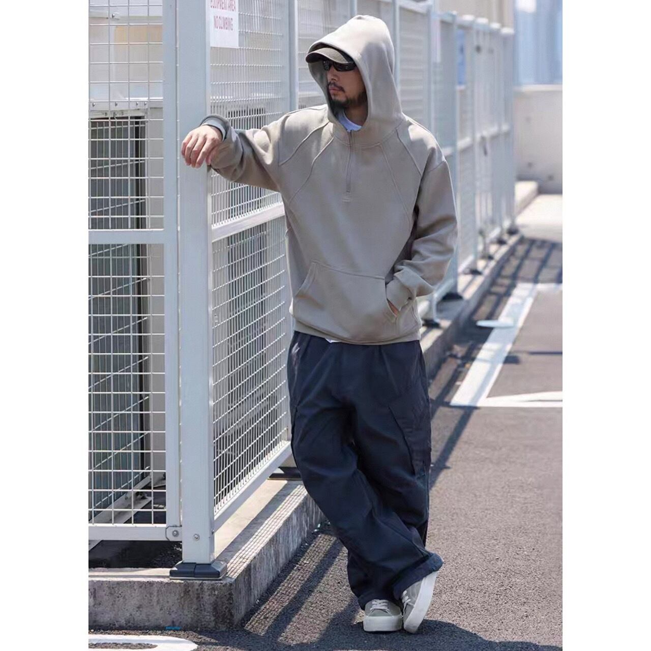シンプルな中に程よい個性を加えたハーフジップフーディ。