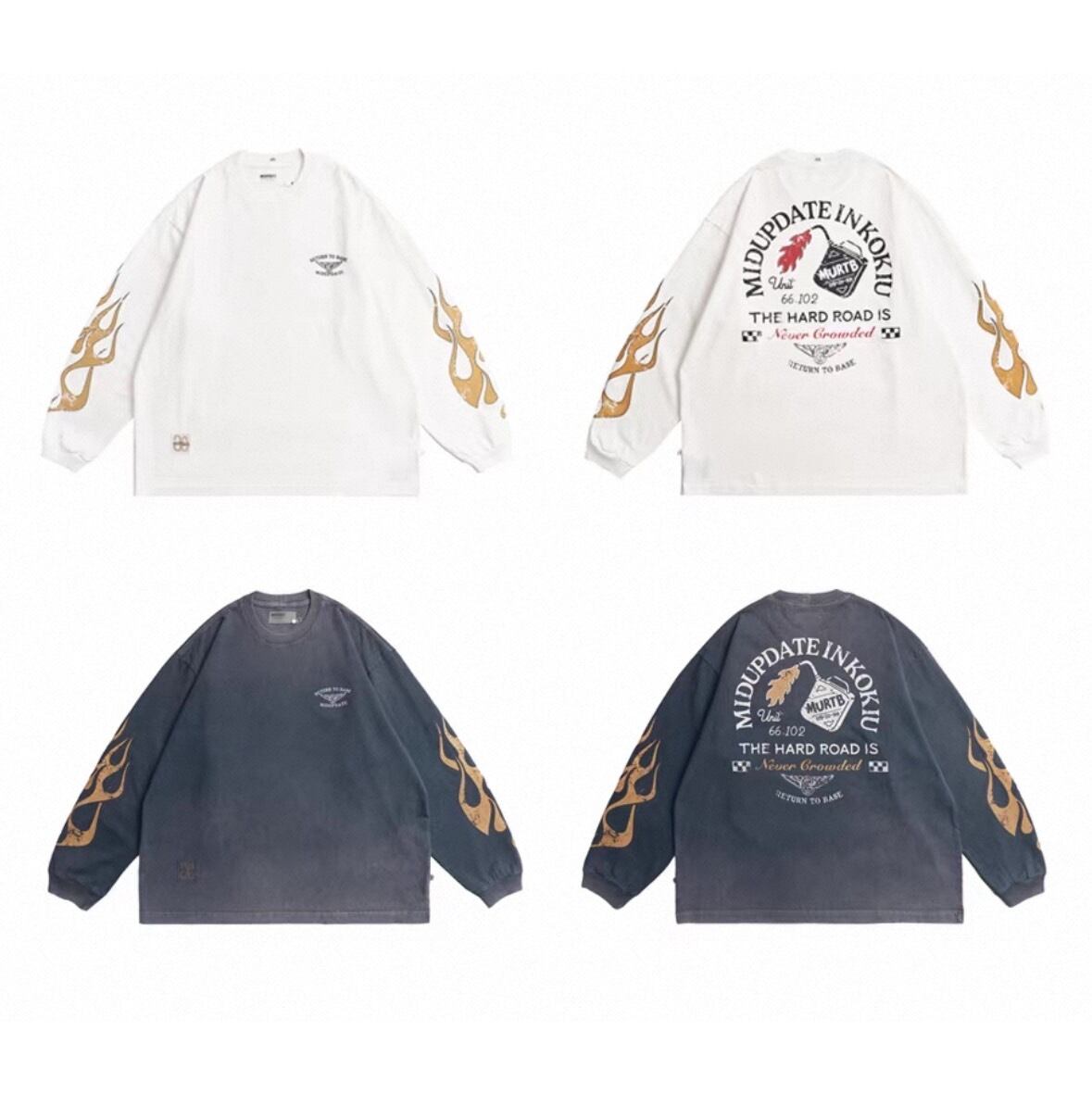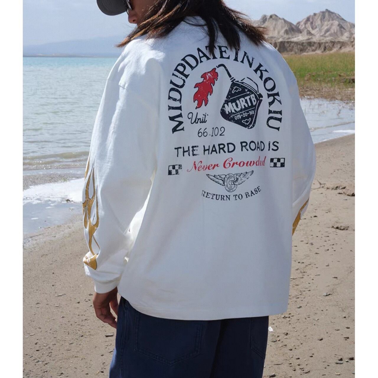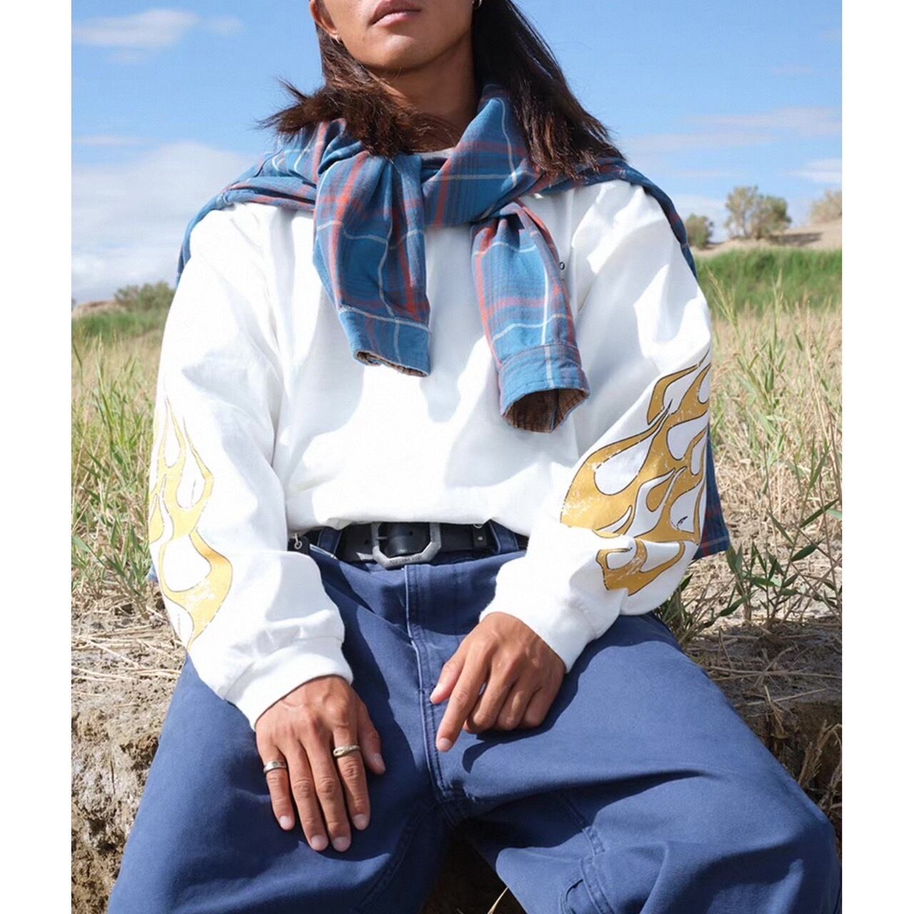 フレイムとタイポグラフィのプリントが映える一枚で、リラックスした雰囲気とストリート感を両立。
