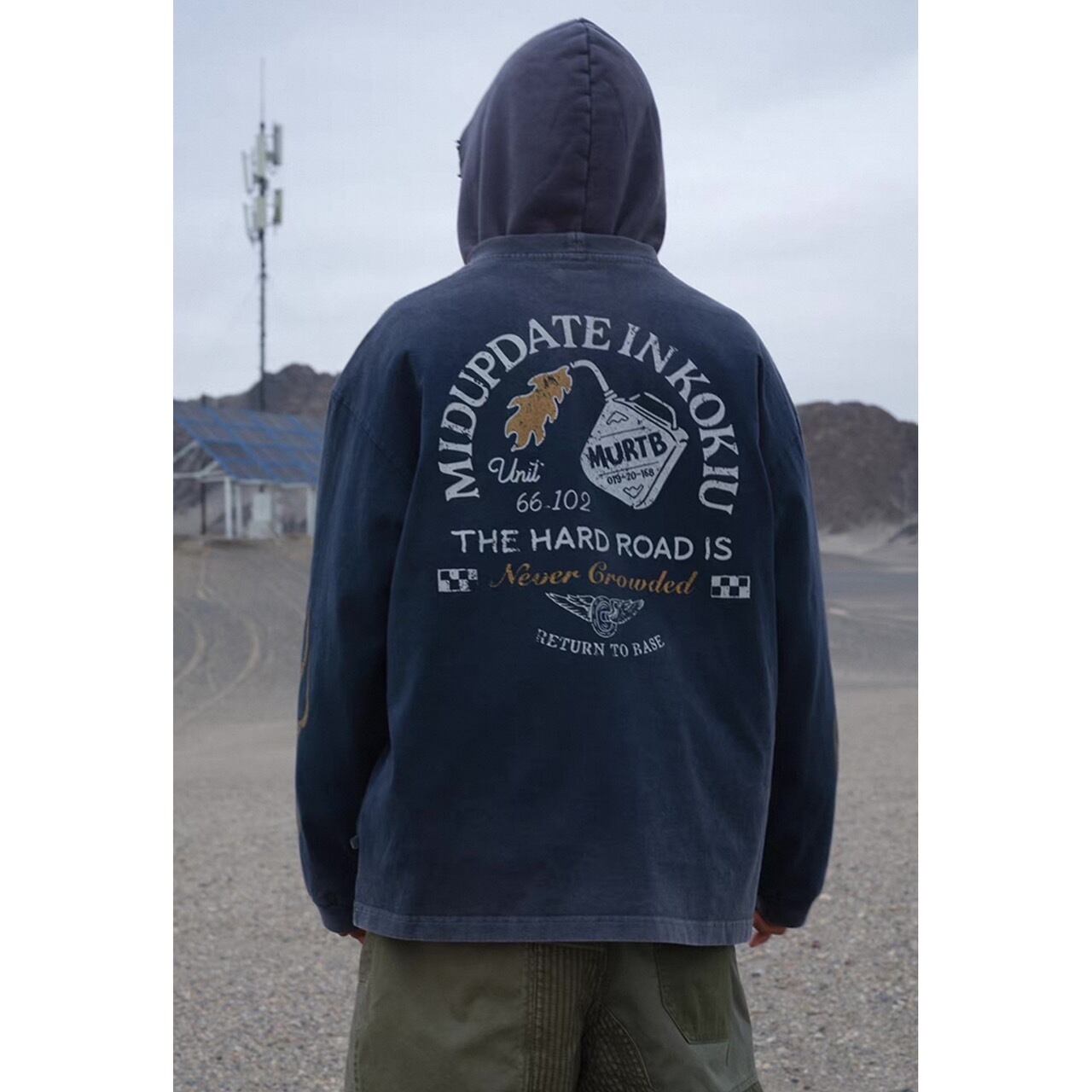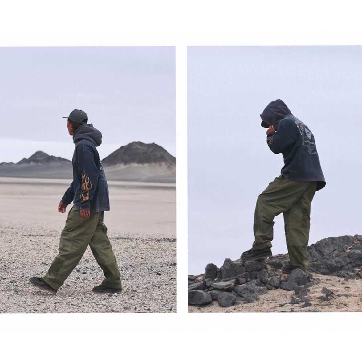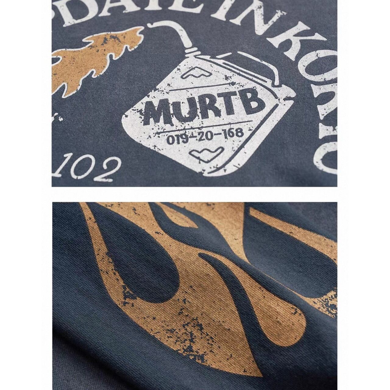 フレイムとタイポグラフィのプリントが映える一枚で、リラックスした雰囲気とストリート感を両立。