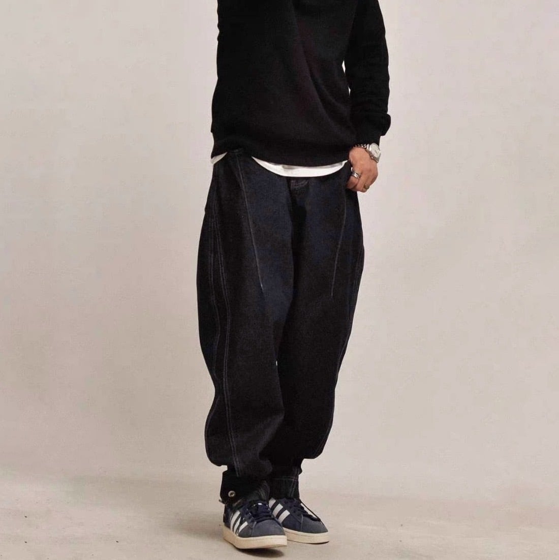 独特のシルエットが目を引くフルレングスデニム。