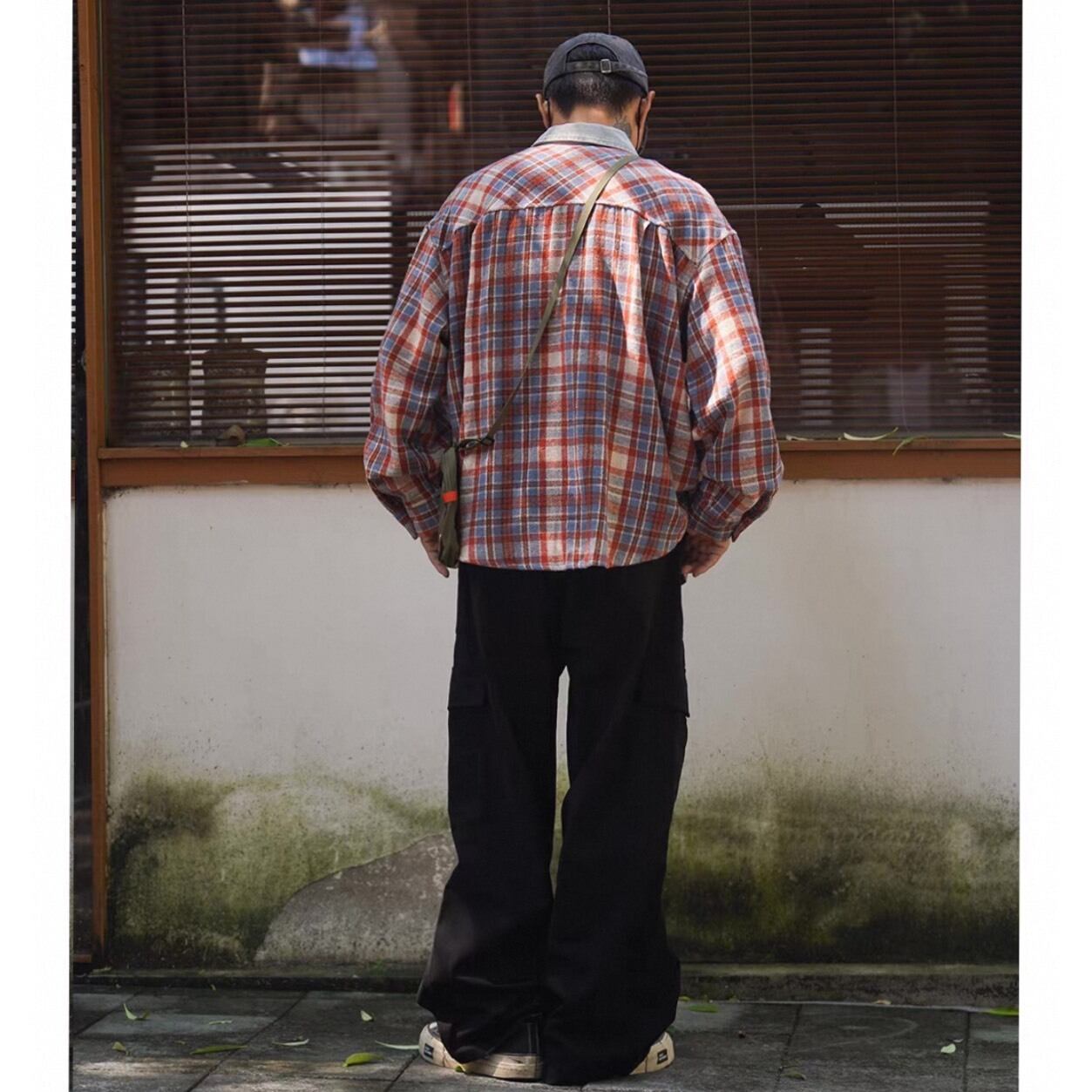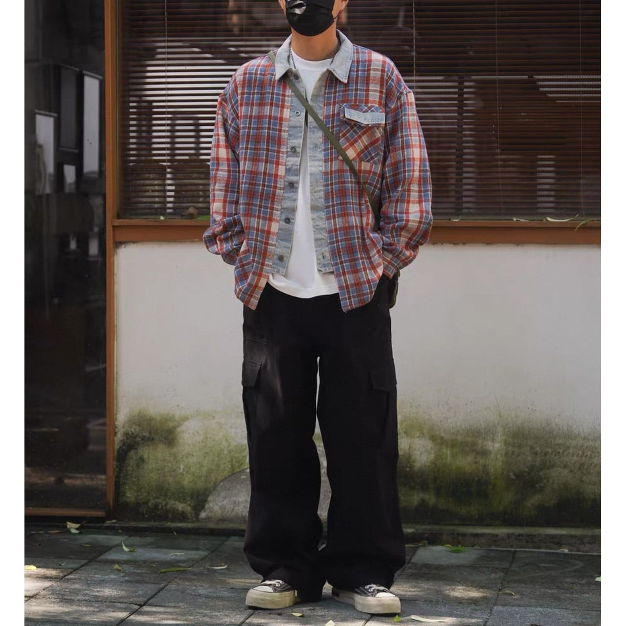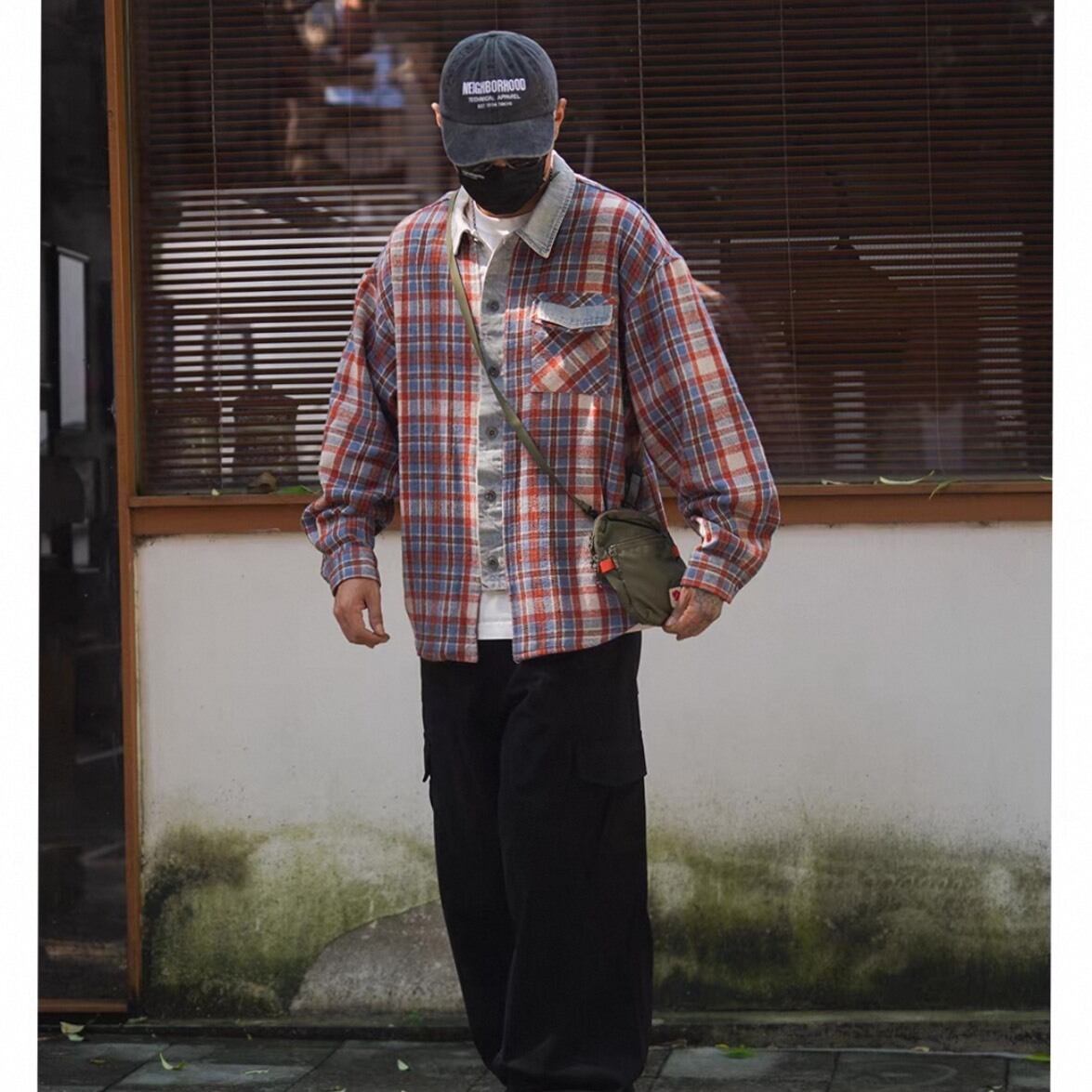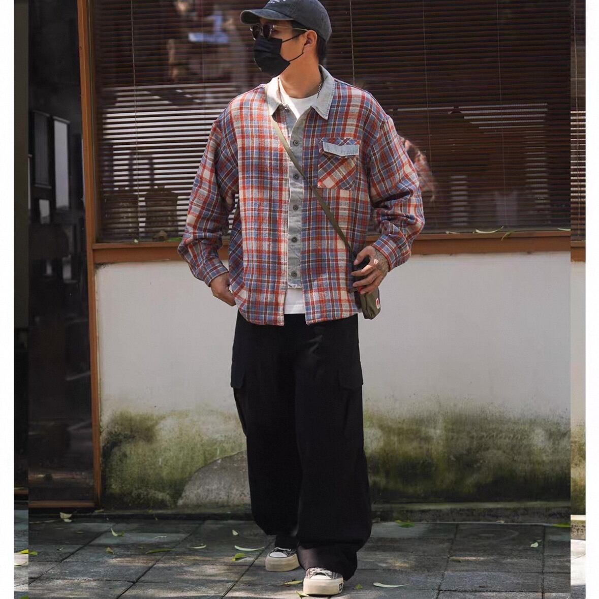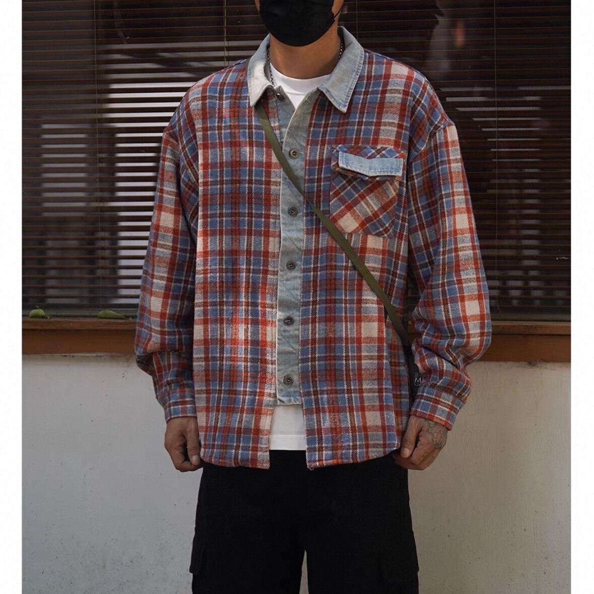 レッドとブルーを基調としたチェック柄に、デニム地をアクセントとして組み合わせたユニークなシャツ。