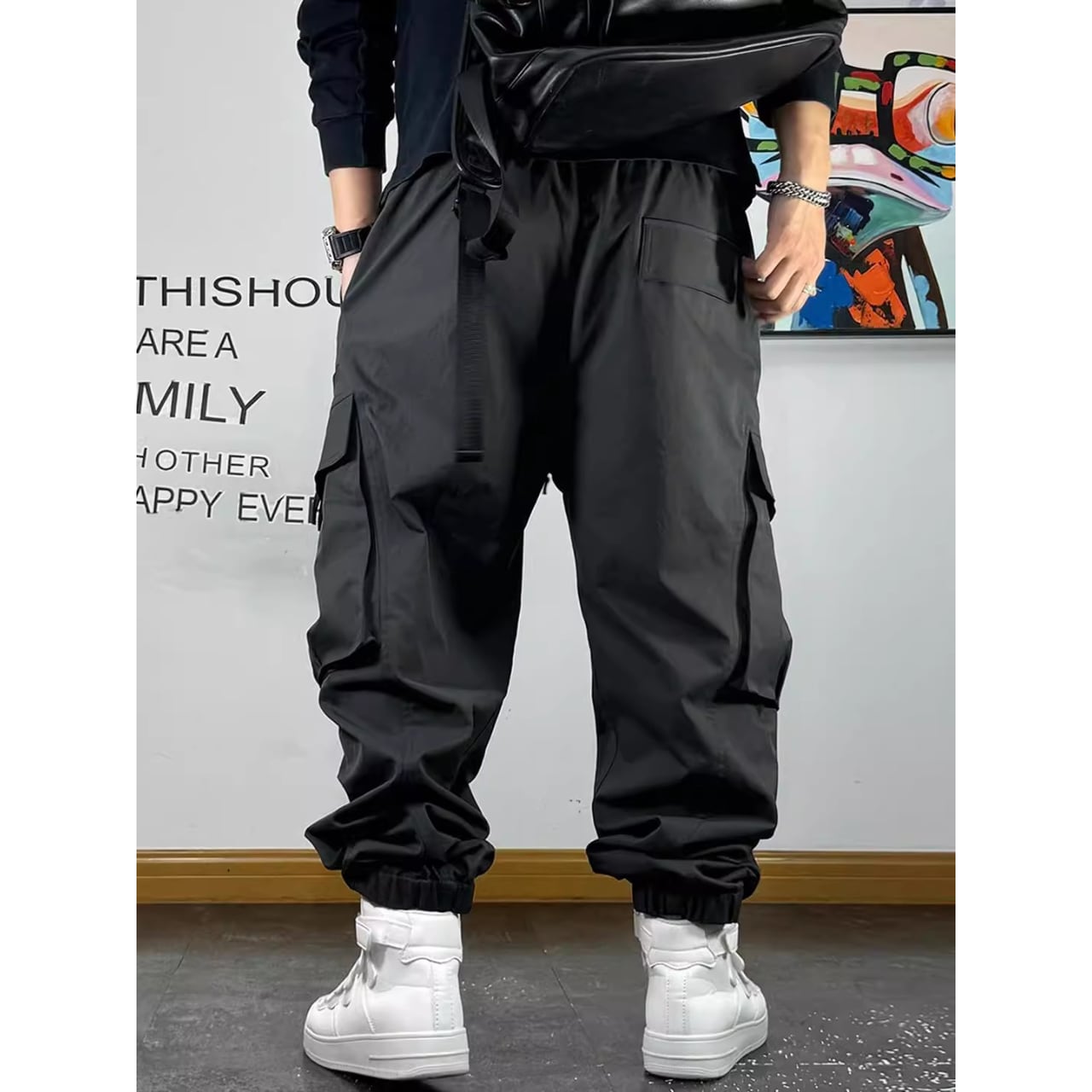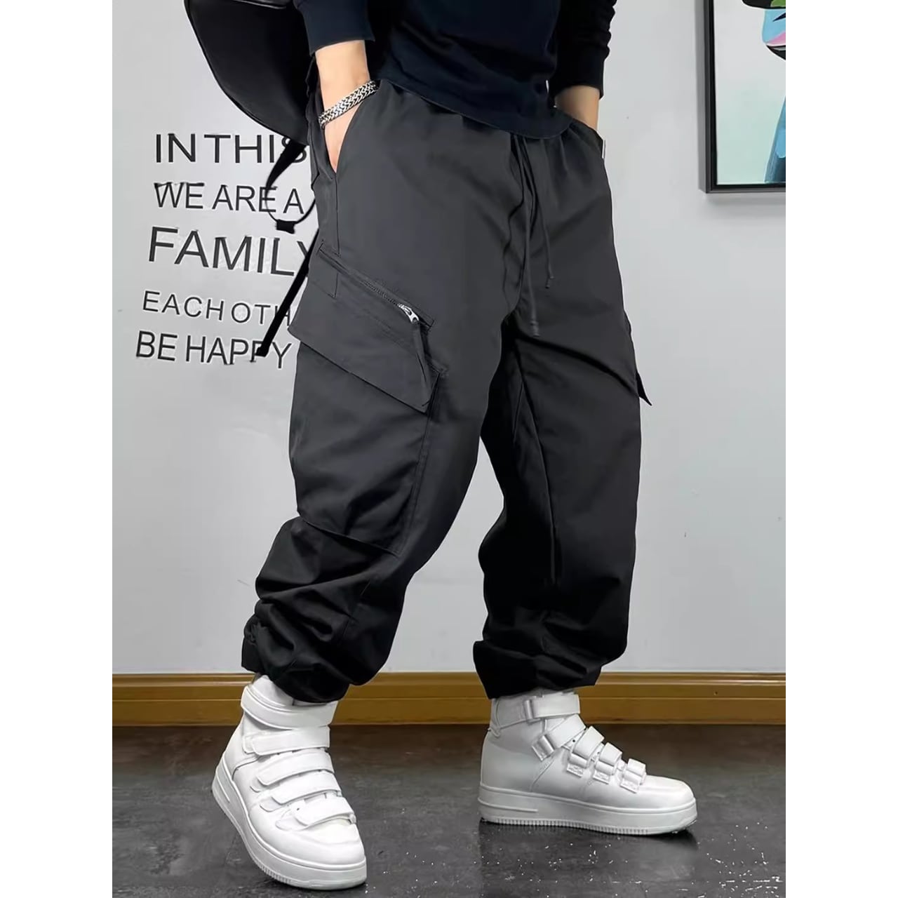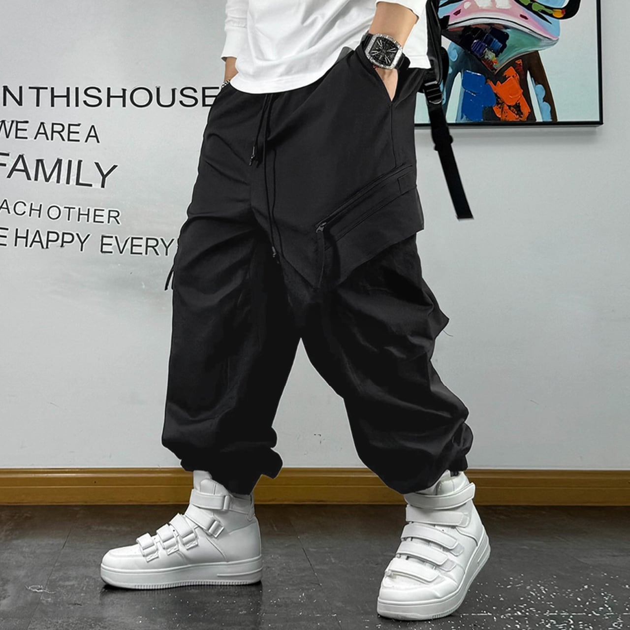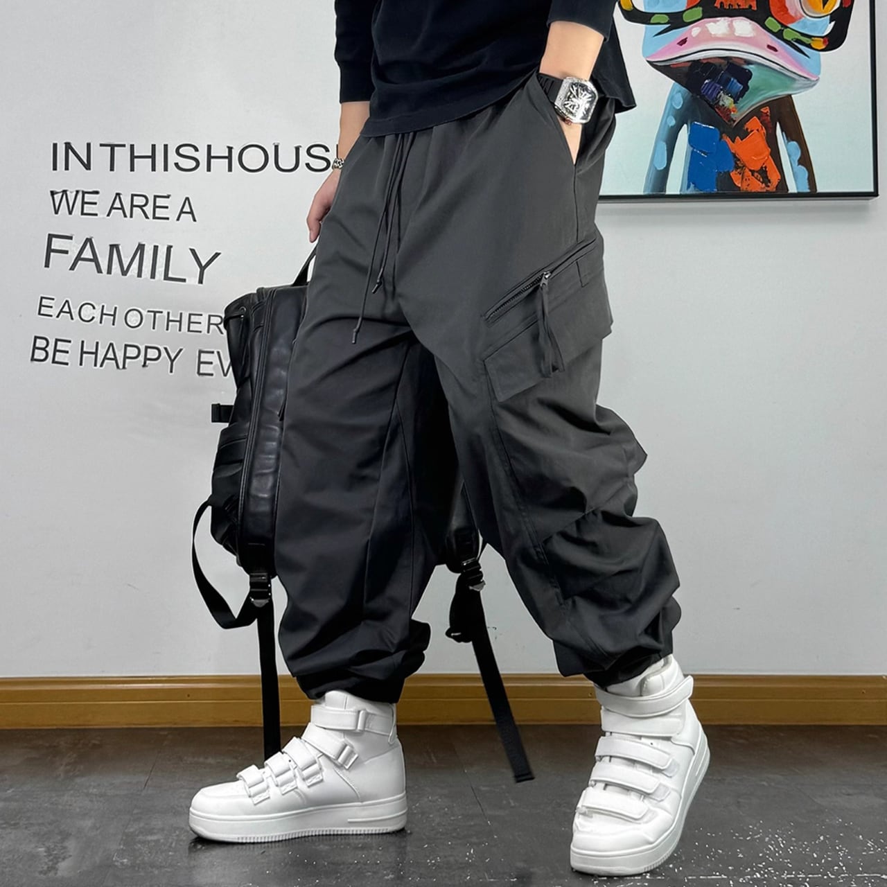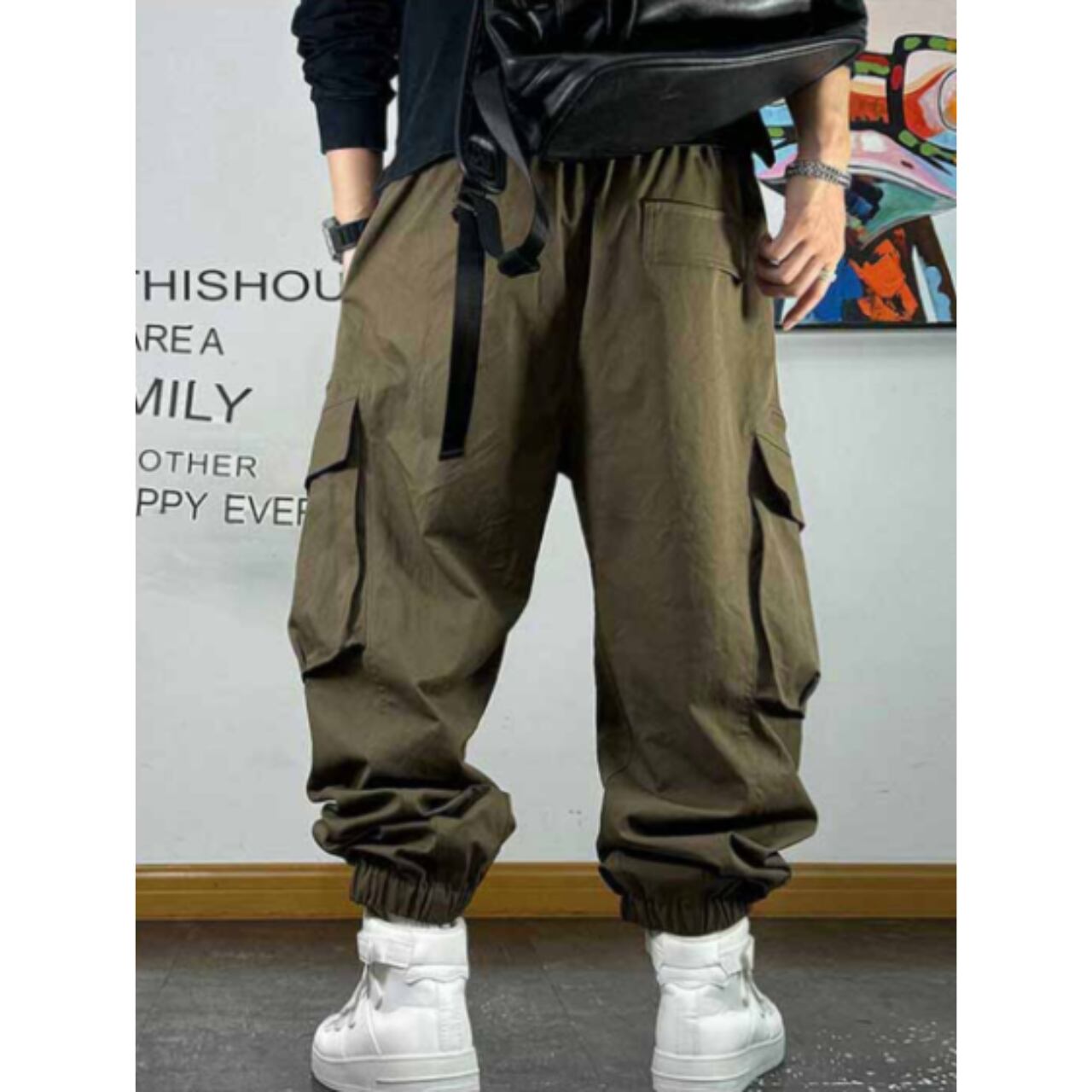 立体感のあるポケットやストラップディテールが特徴で、穿くだけで存在感のあるスタイルを演出します。