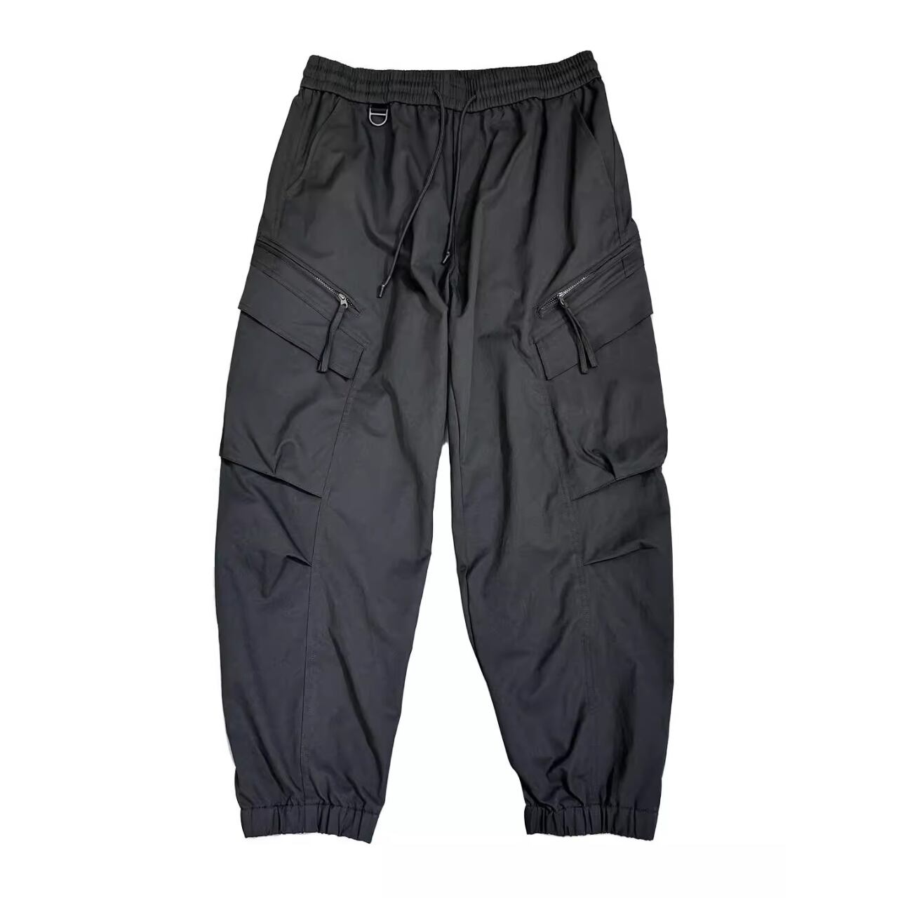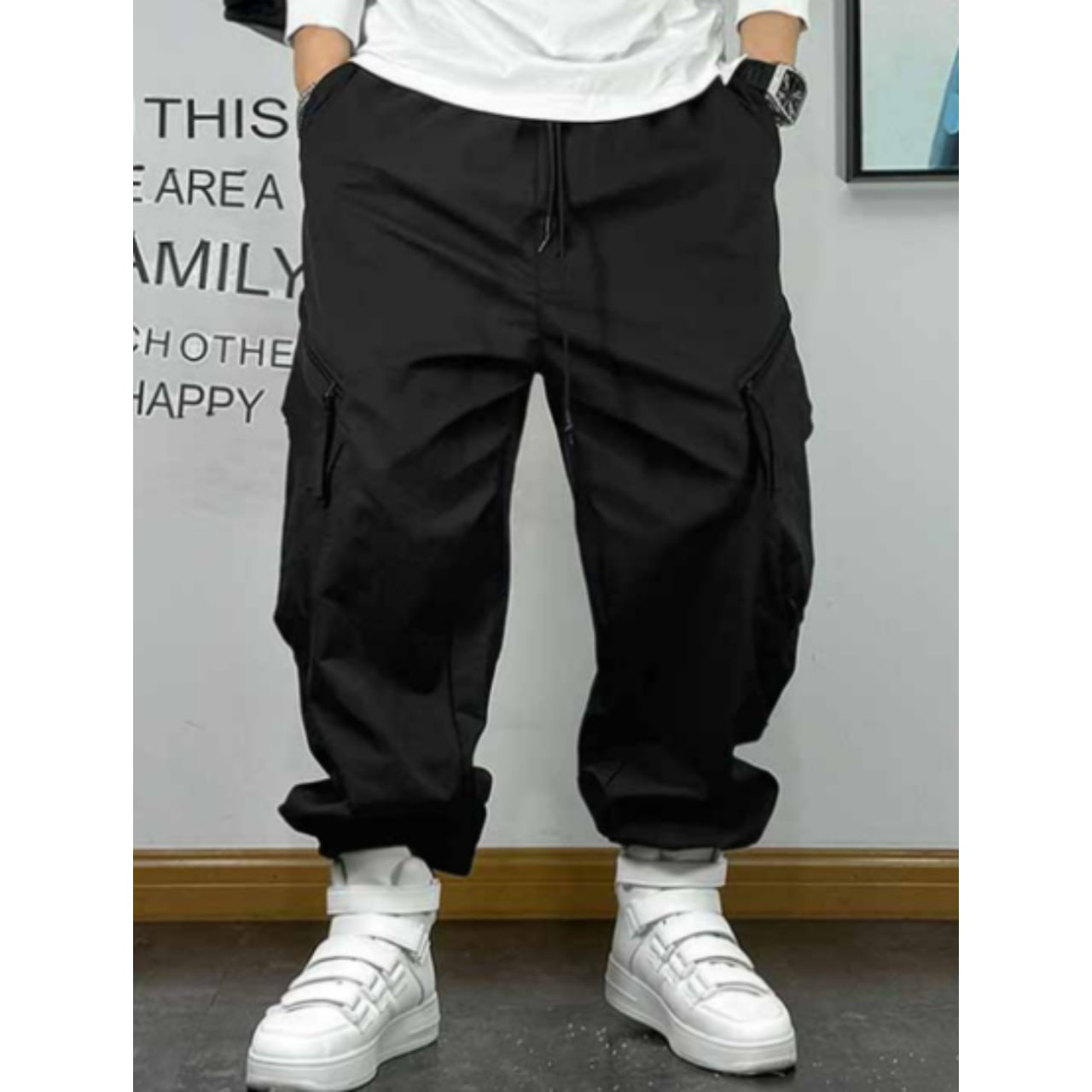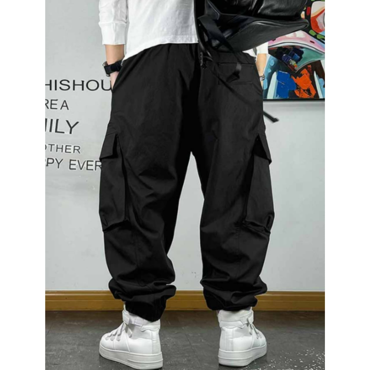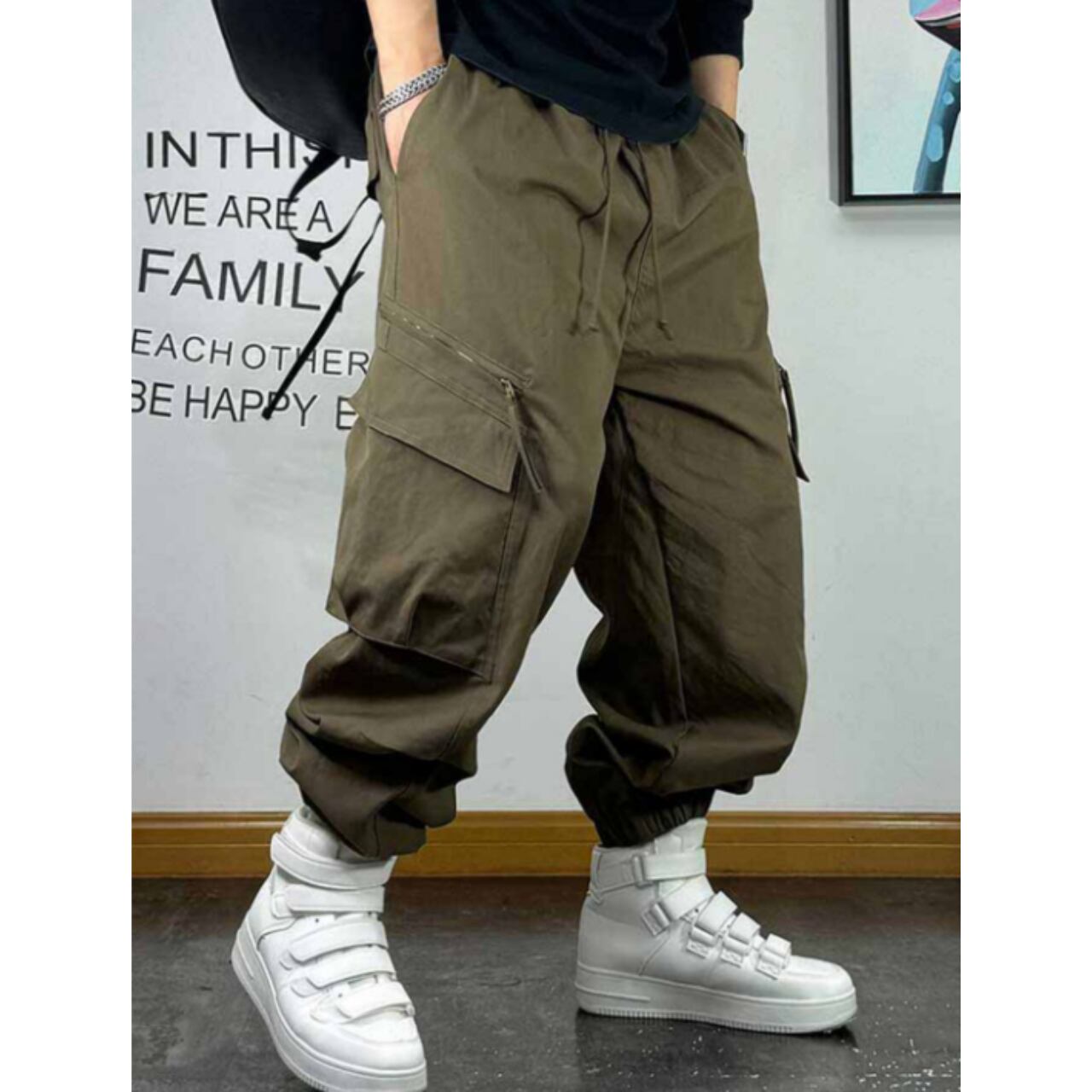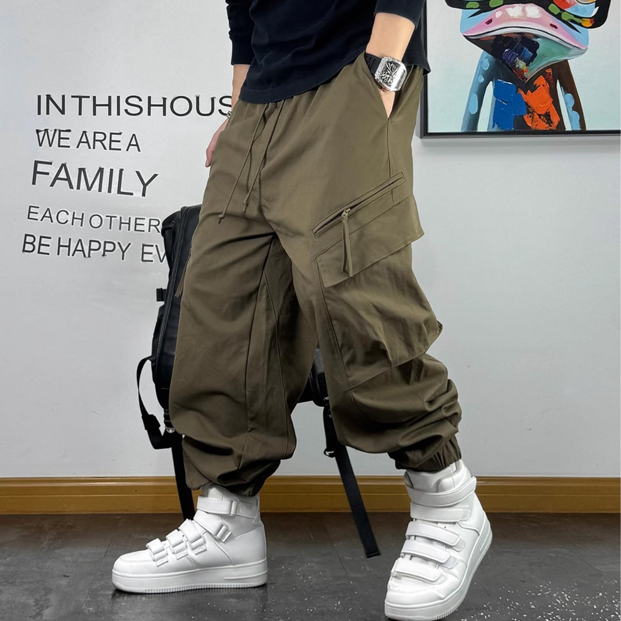 立体感のあるポケットやストラップディテールが特徴で、穿くだけで存在感のあるスタイルを演出します。