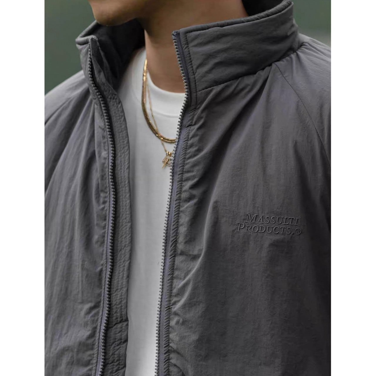 程よいオーバーサイズとシンプルなデザインが特徴のジップアップジャケット。