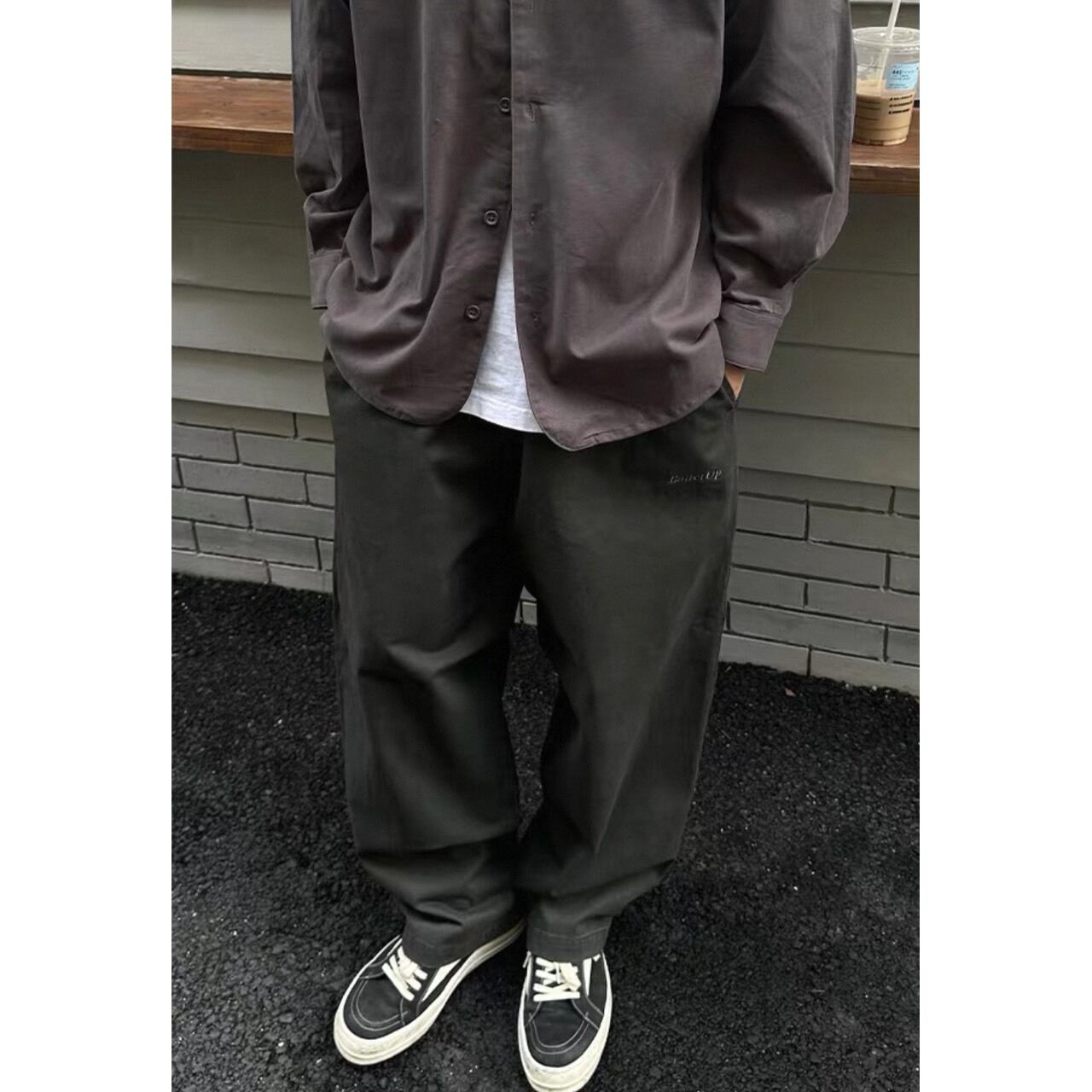 ゆったりとしたワイドシルエットが魅力のチノパン。