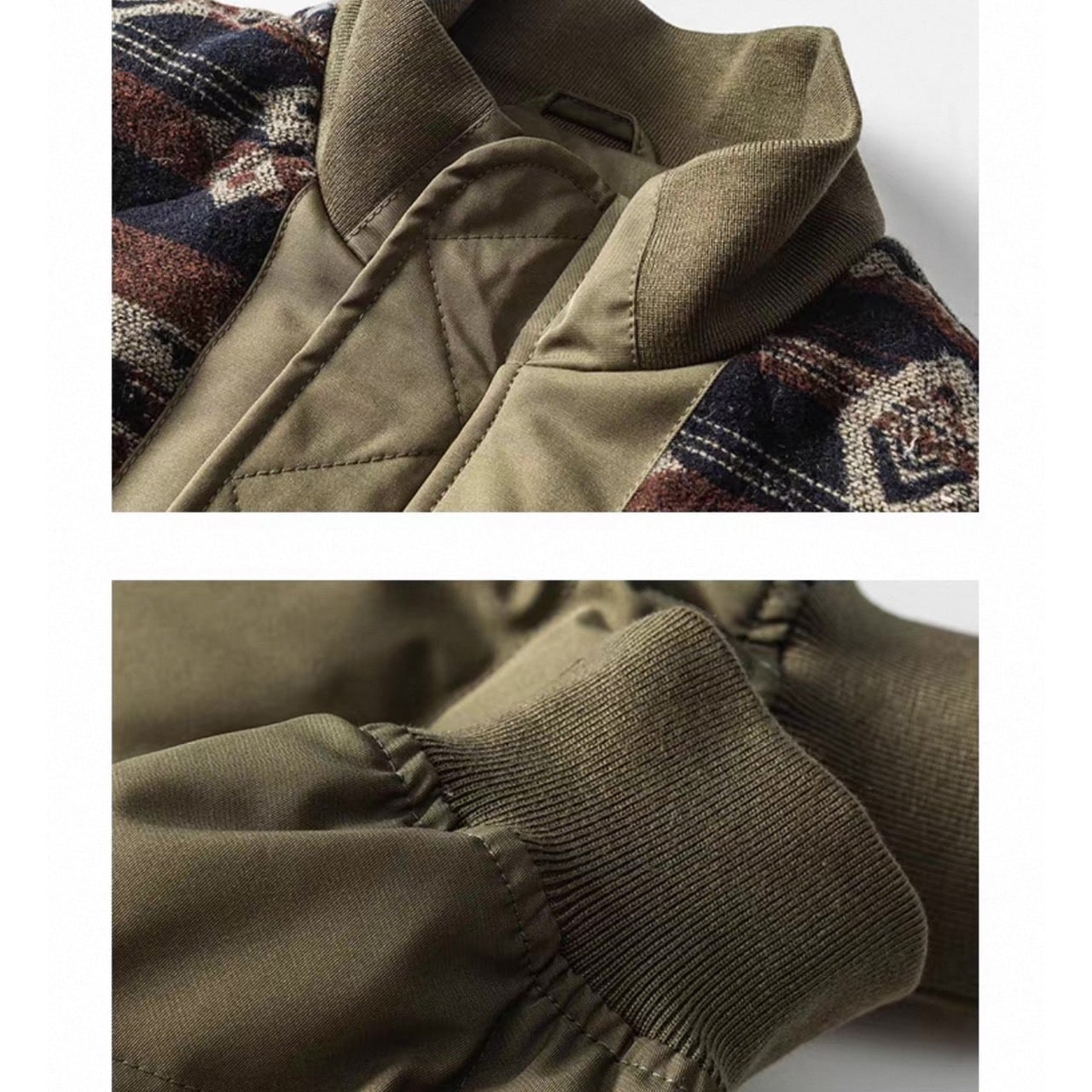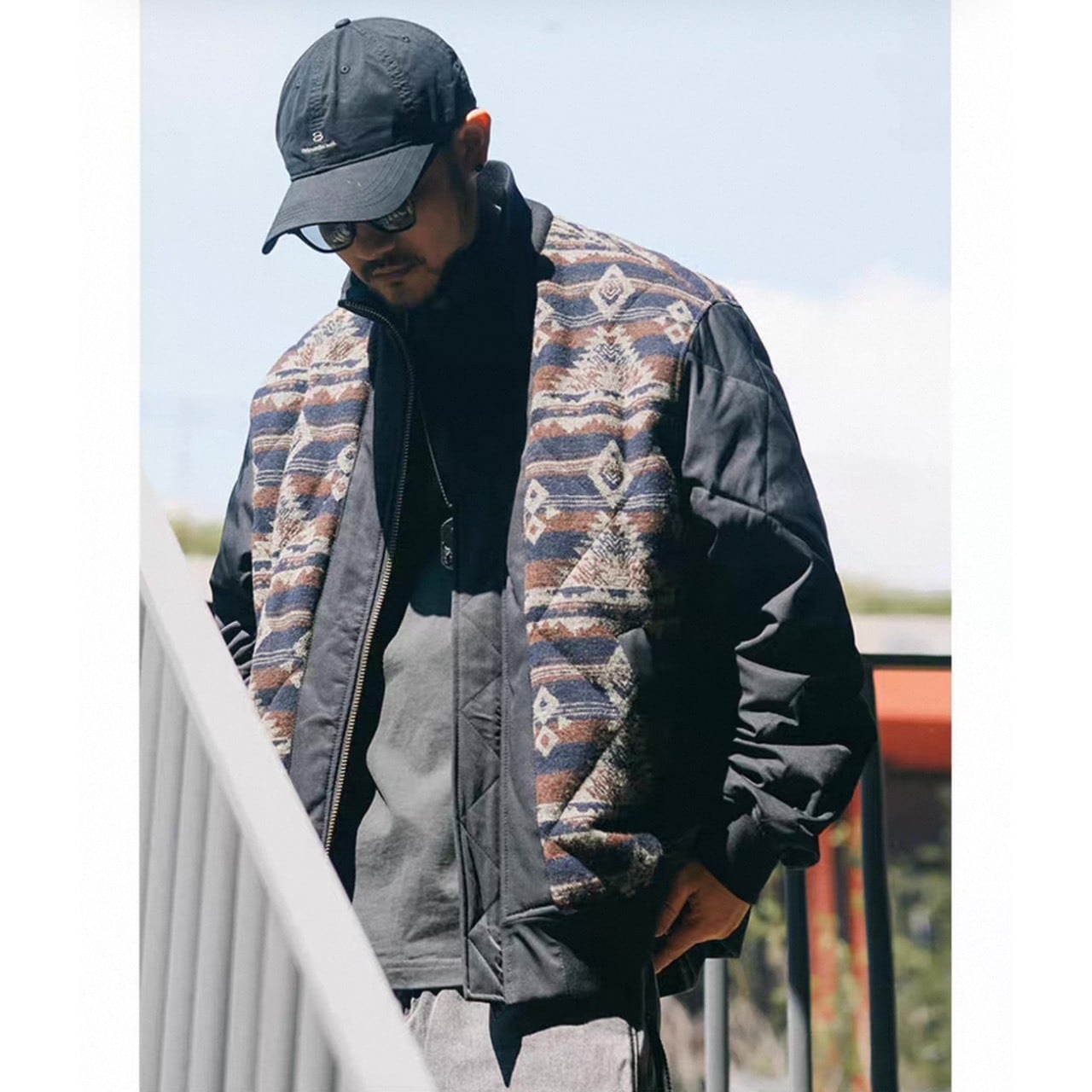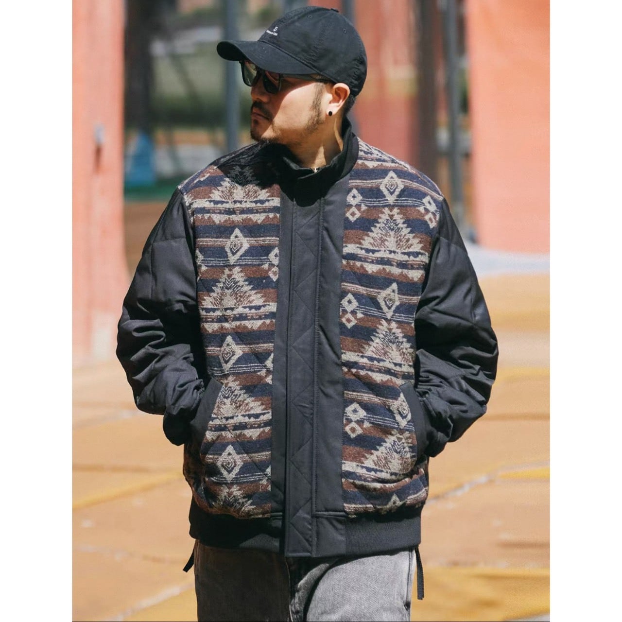 フロントにネイティブ柄を大胆にあしらった切り替えデザインのアウター。
