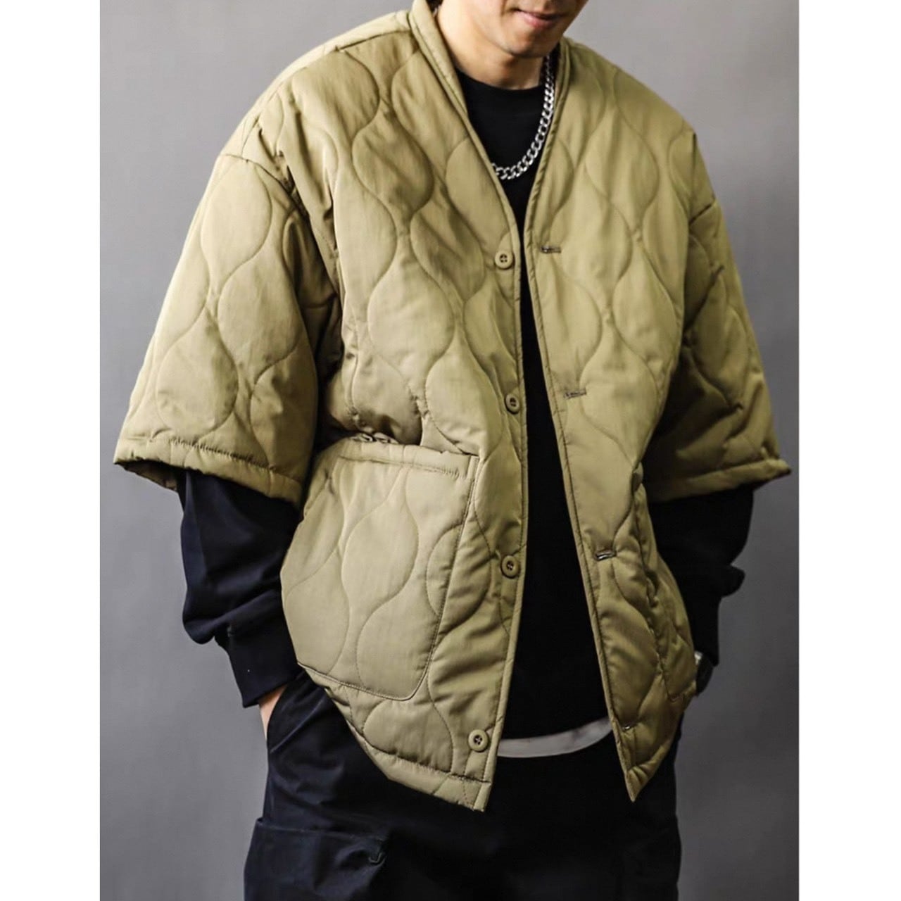 フロントのスナップボタンと大きめポケットで実用性も高く、ロングスリーブとのレイヤードも相性抜群。