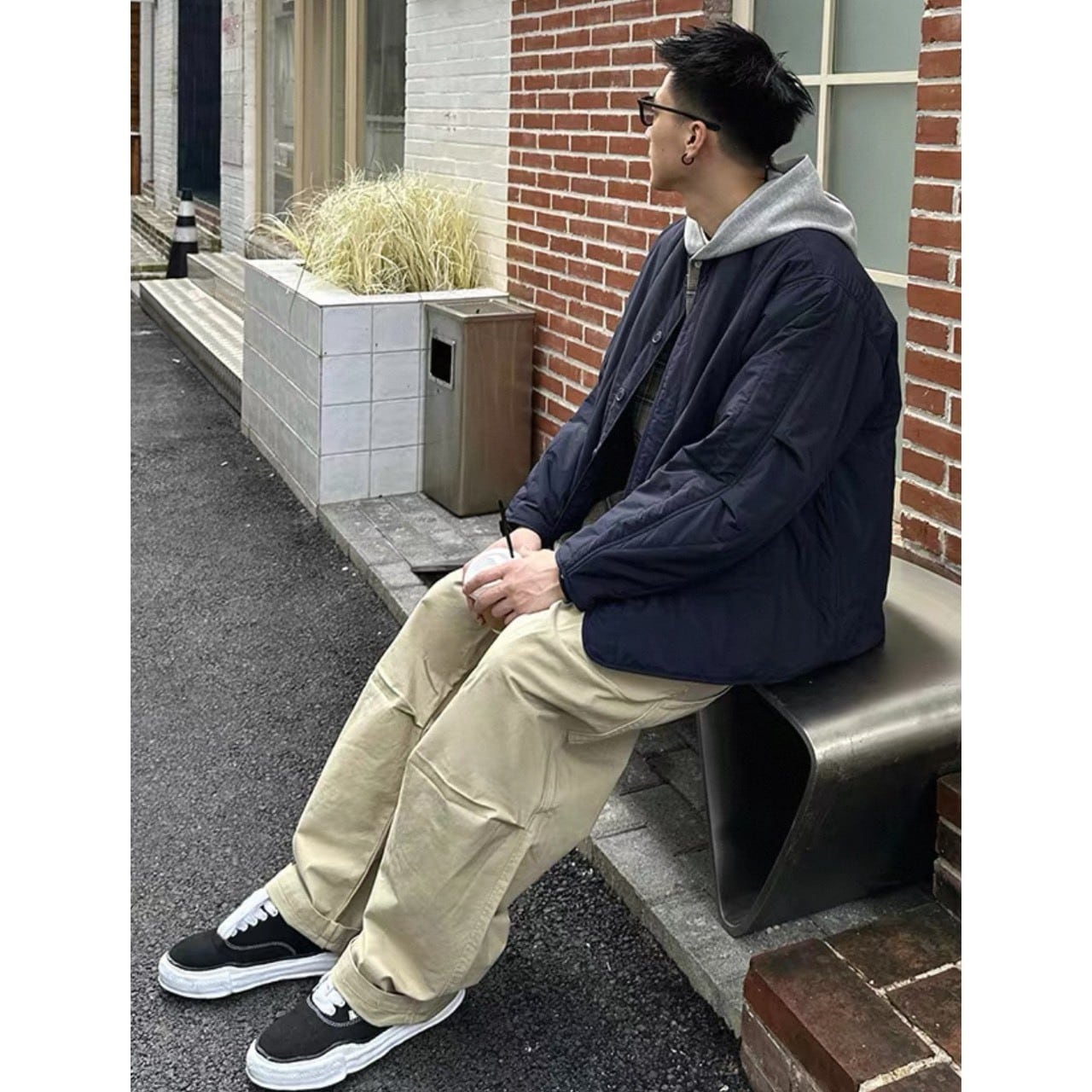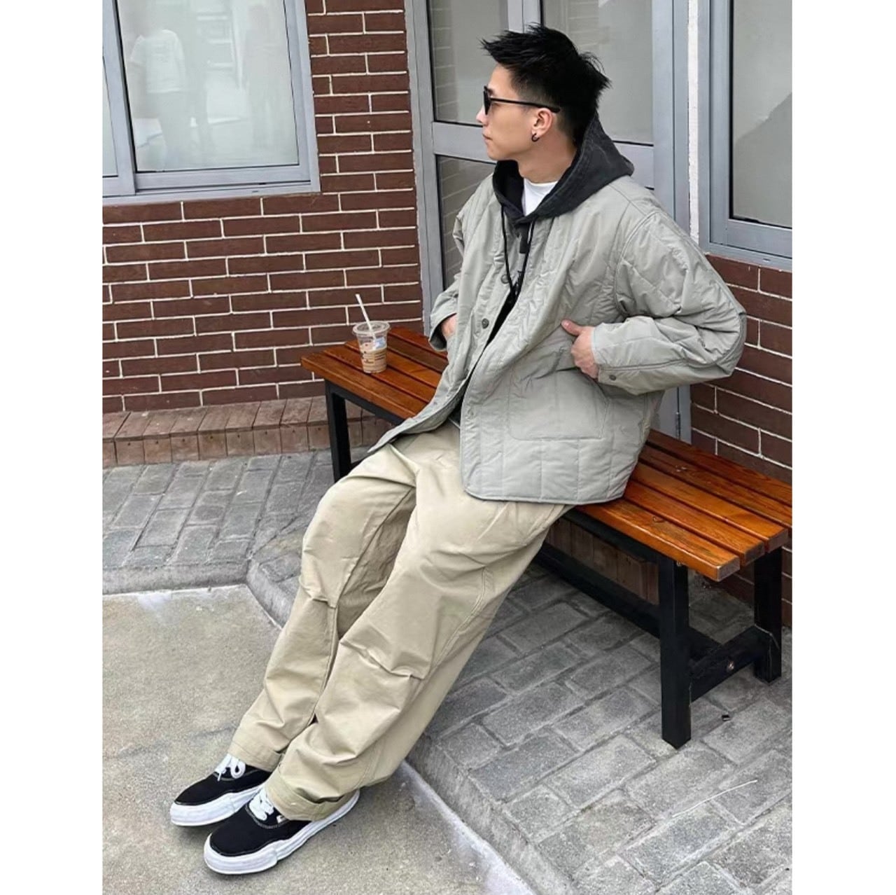 程よいゆとりのあるシルエットで、フーディやスウェットとのレイヤードがしやすいバランスに仕上げています。フロントはボタン仕様で着脱しやすく、無駄を削ぎ落としたミニマルなデザインが大人のストリートスタイルにフィットします。