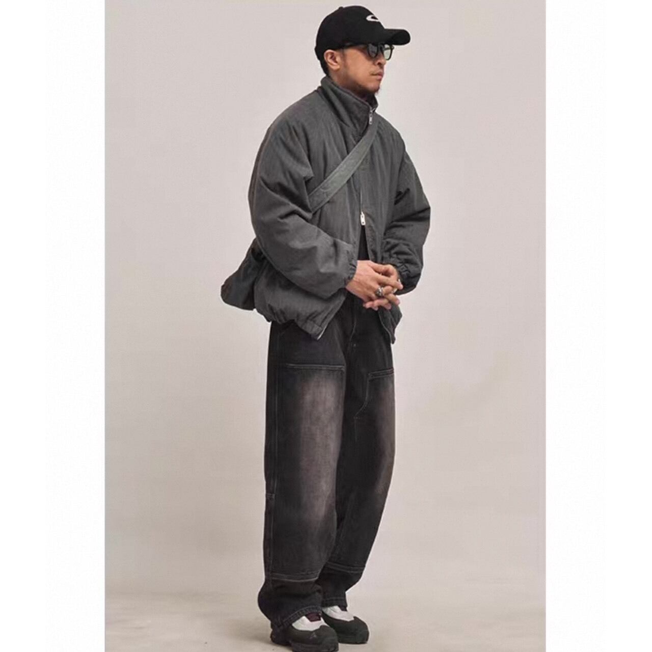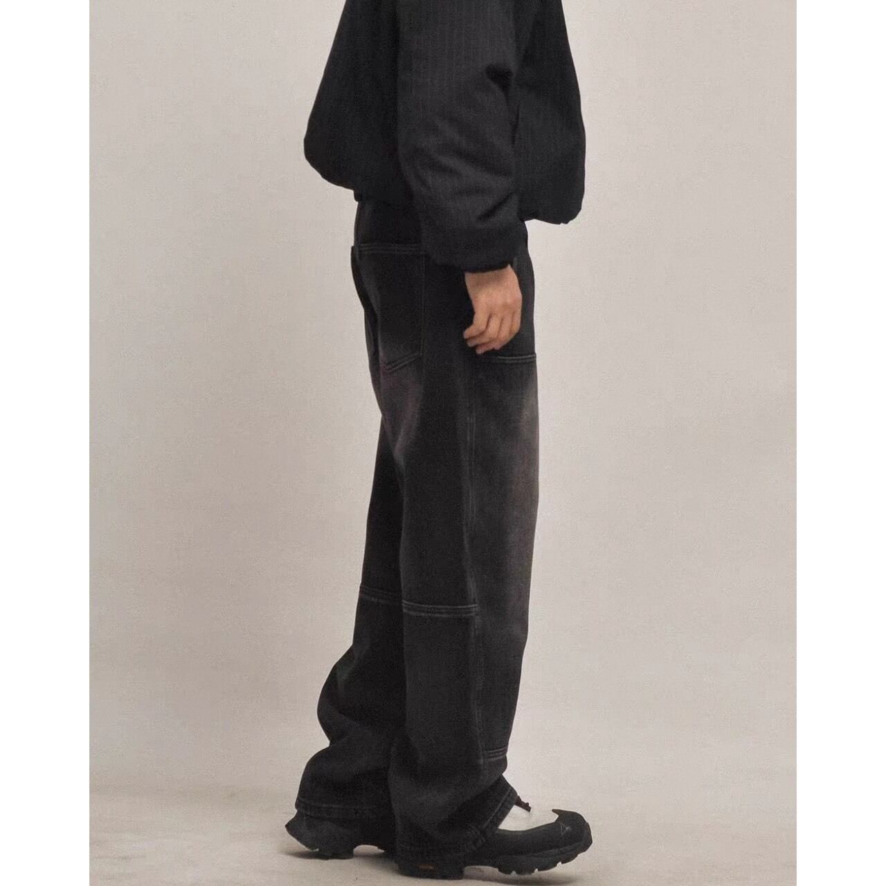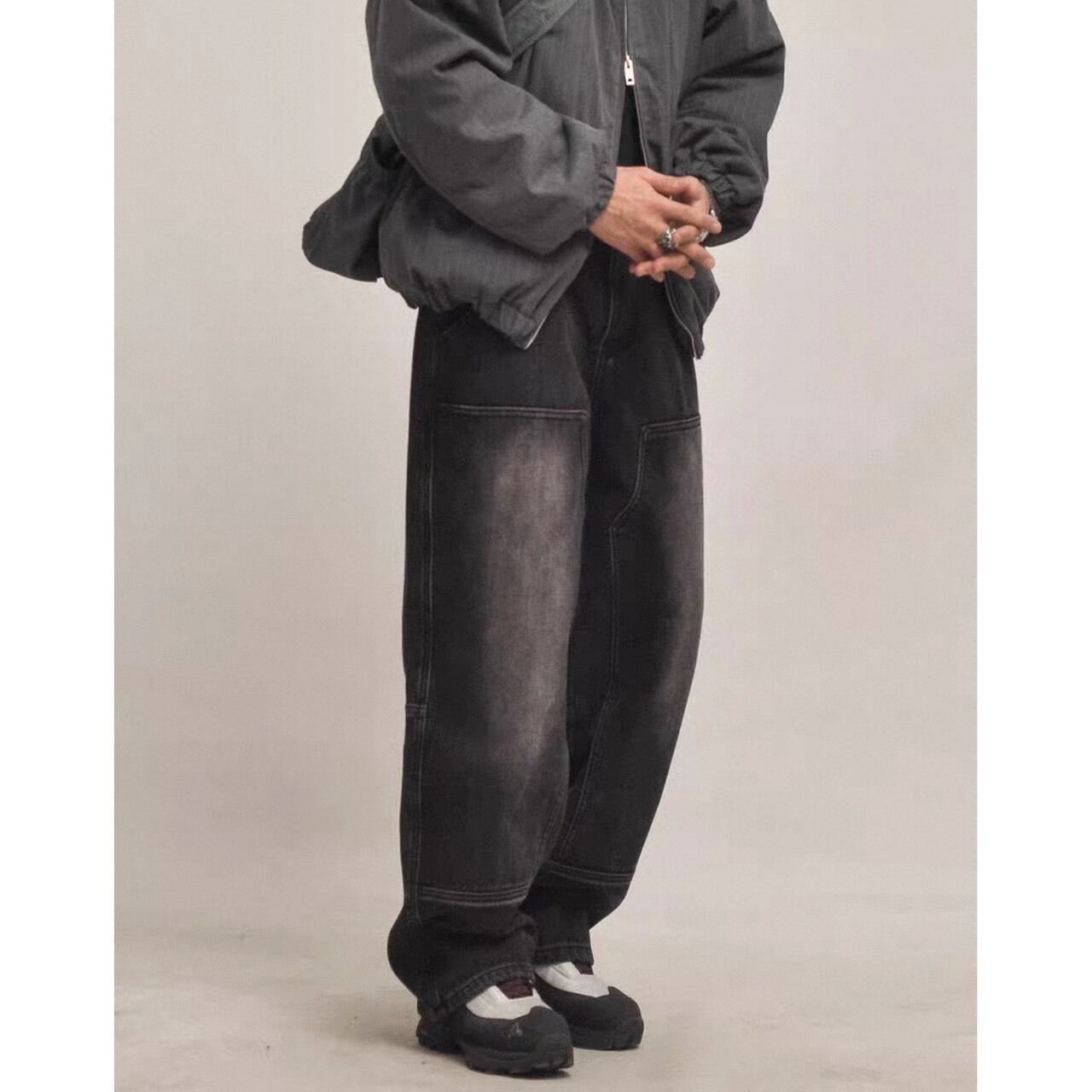 落ち着いたブラックデニムに、さりげないフェード感を効かせた大人向けのワイドジーンズ。