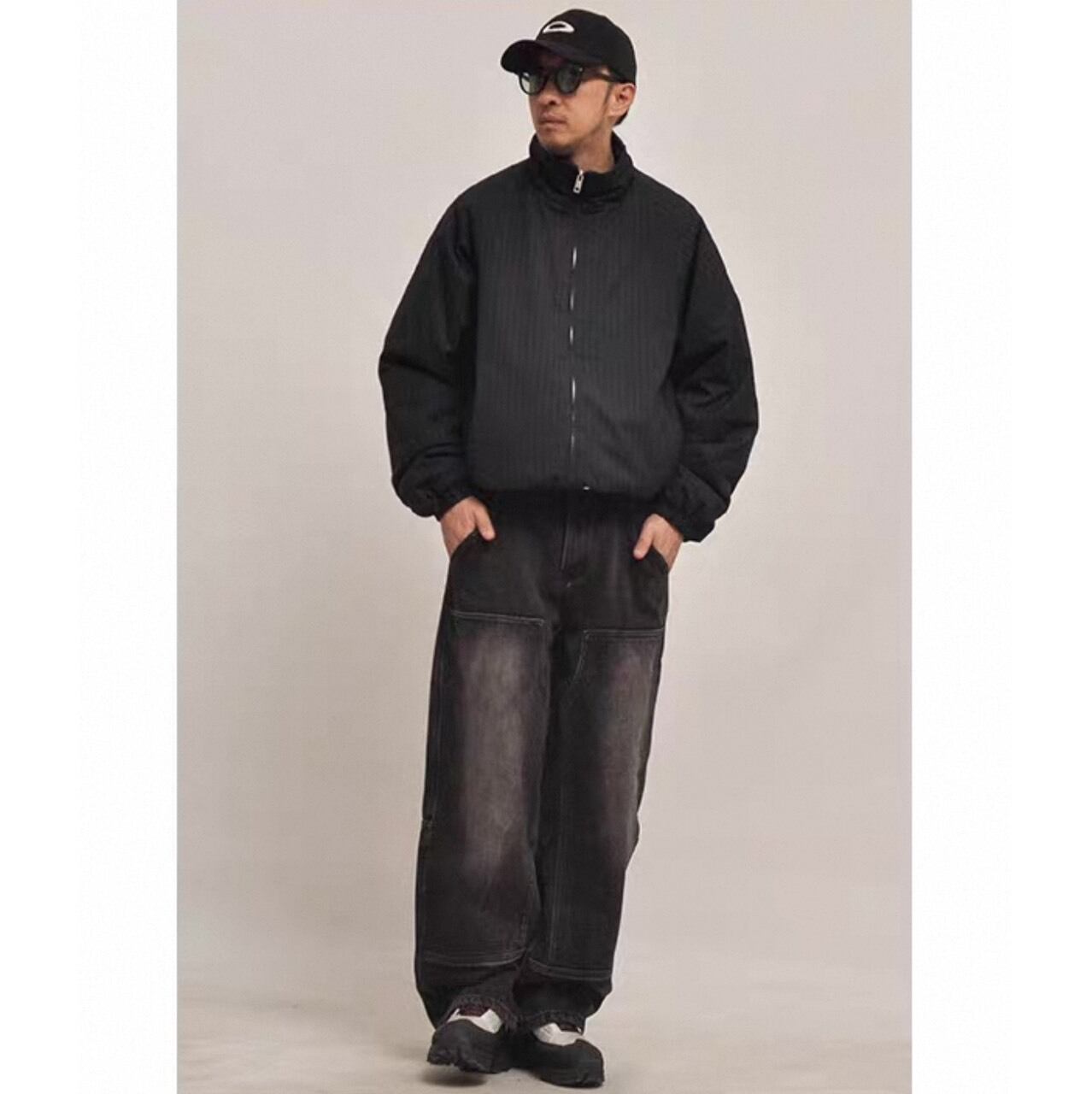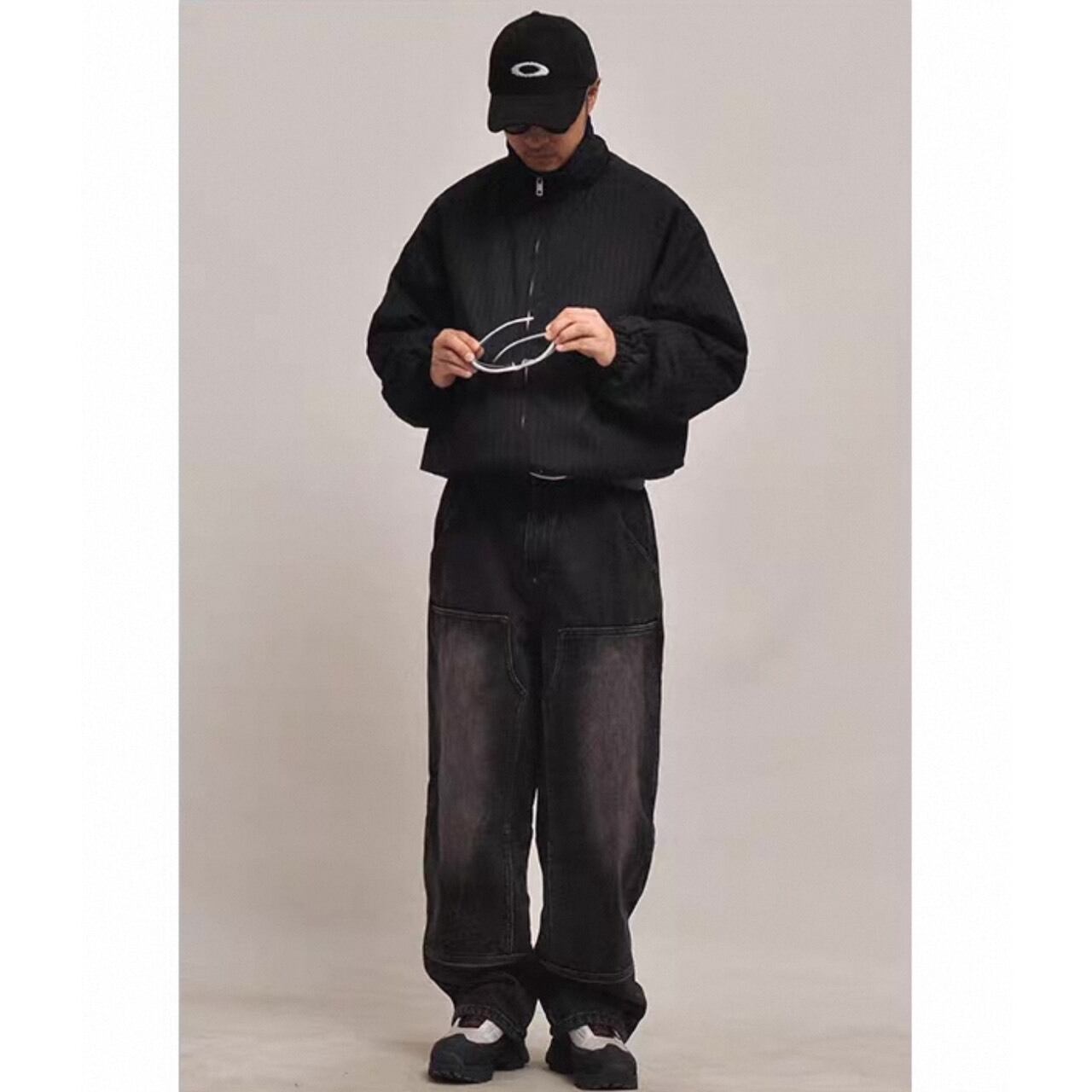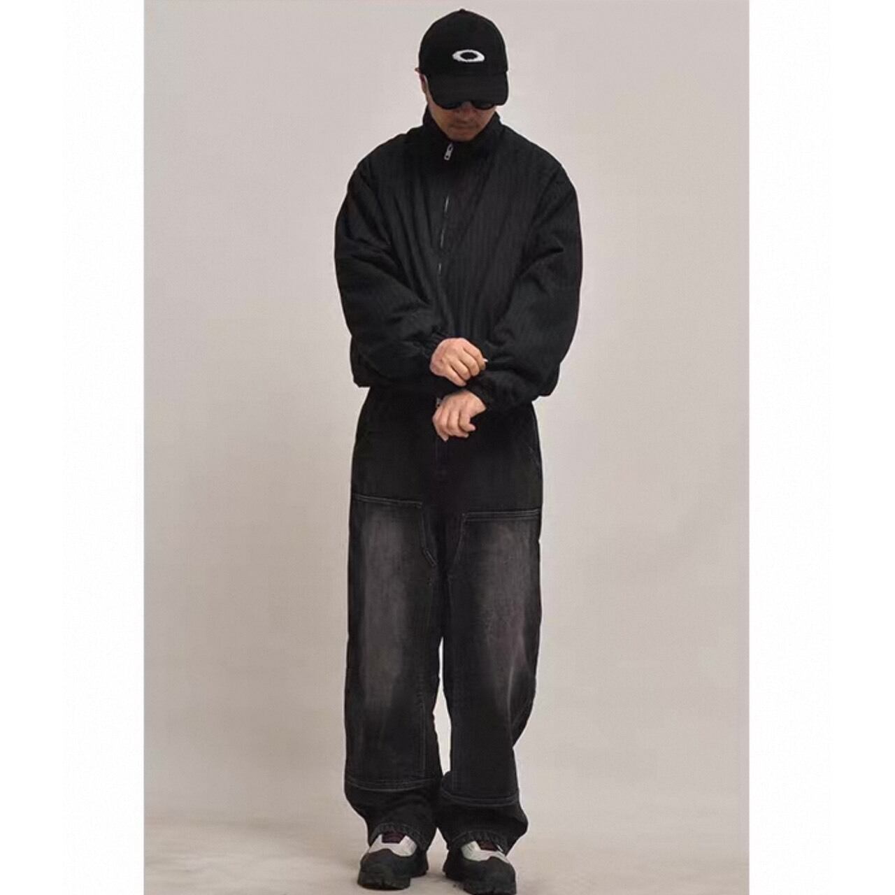 落ち着いたブラックデニムに、さりげないフェード感を効かせた大人向けのワイドジーンズ。