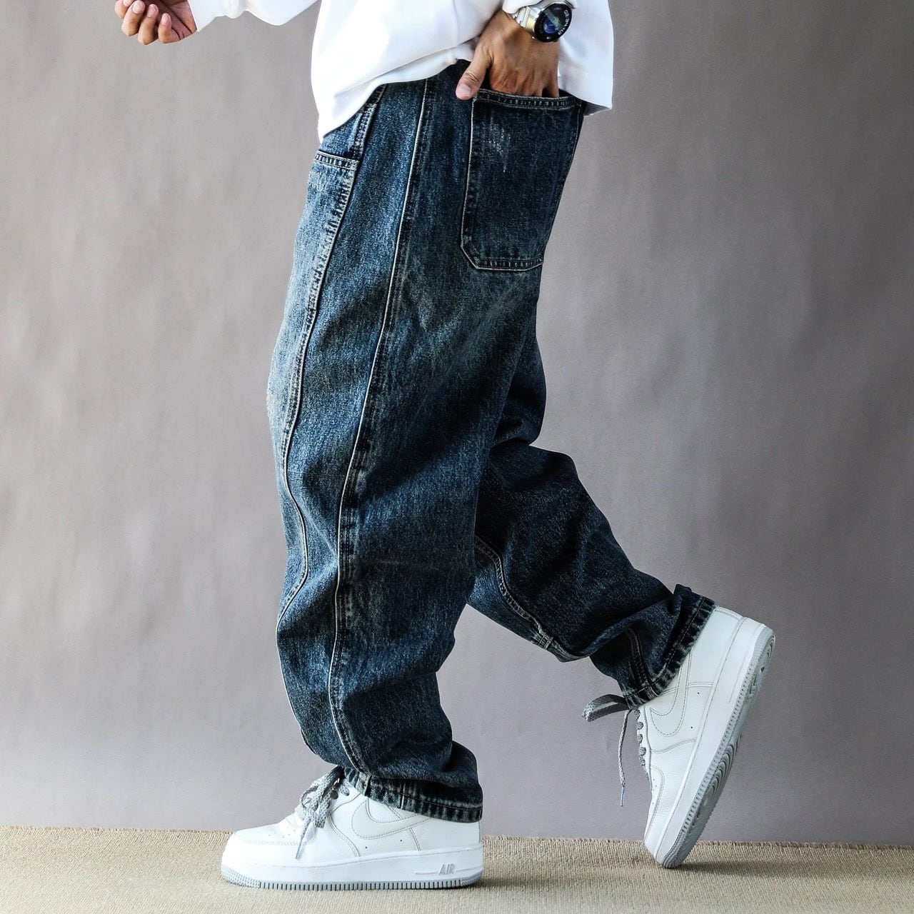 深みのある色落ちと独特のパネルラインが魅力のワイドデニム。
