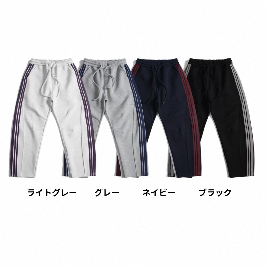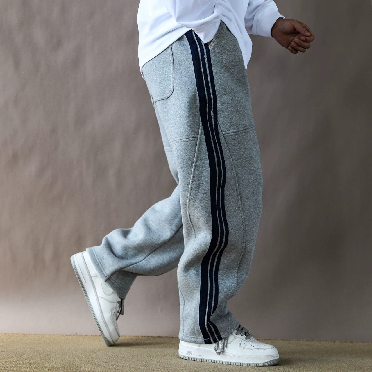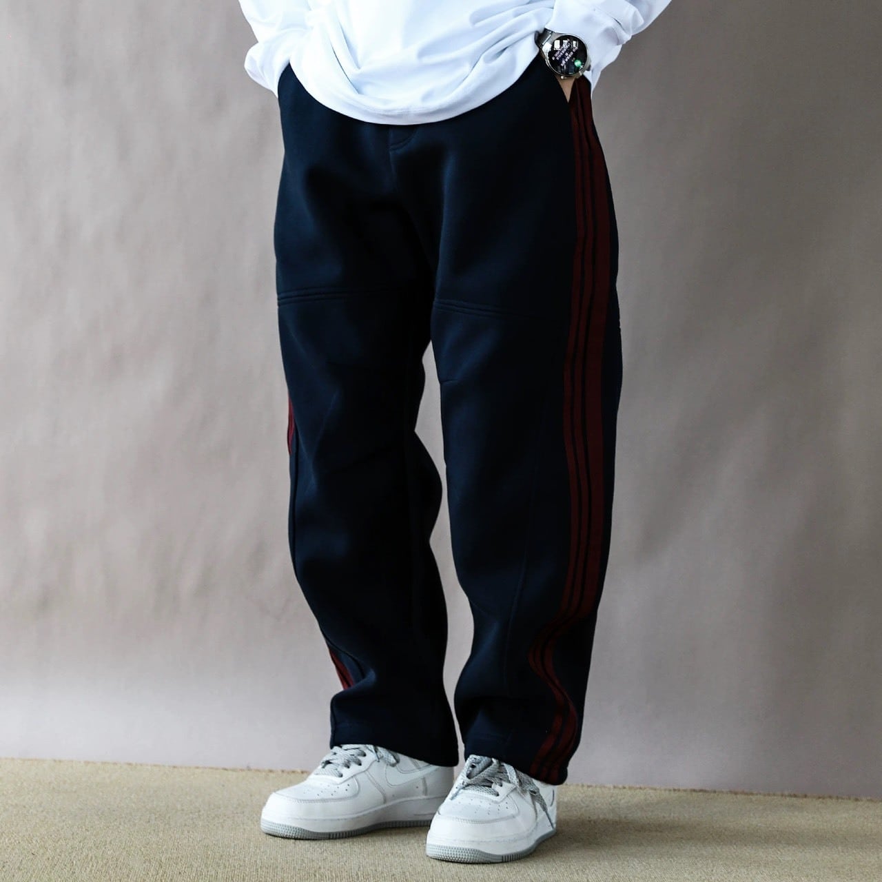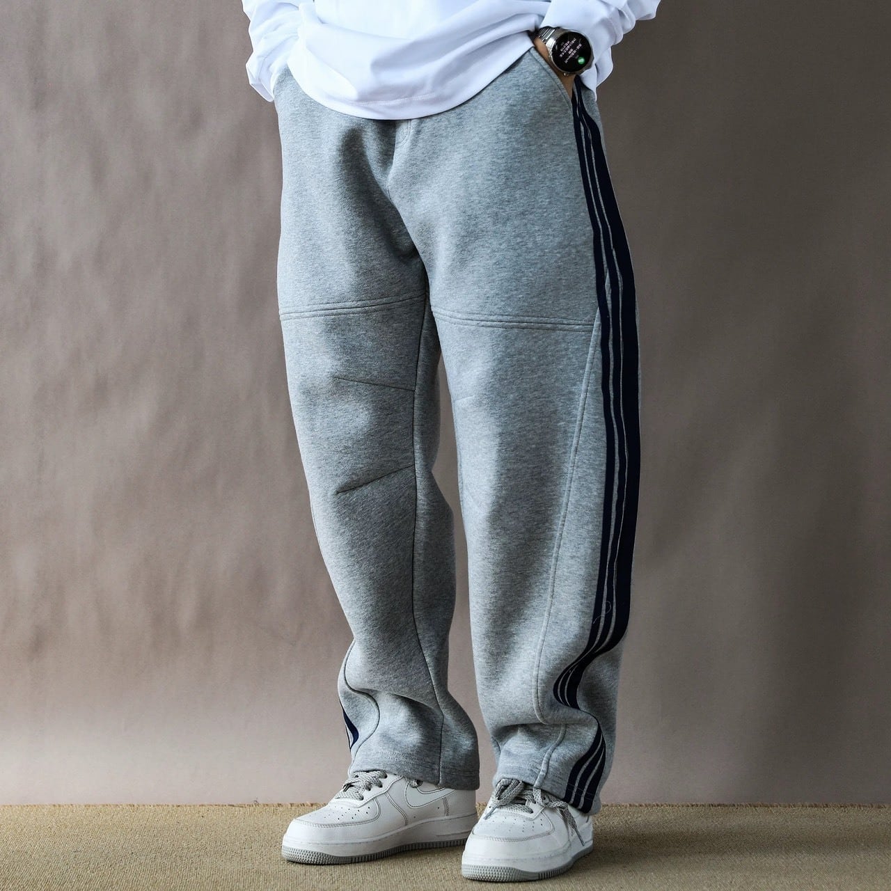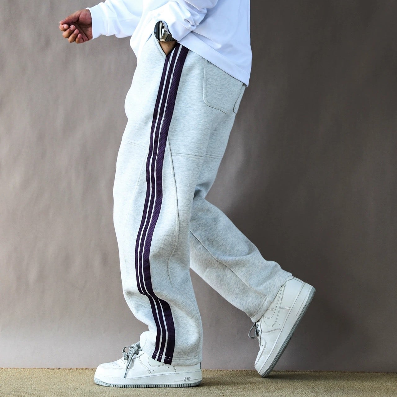 スポーティなサイドラインを落ち着いたトーンでまとめることで、大人仕様に仕上げたワイドスウェットパンツ。