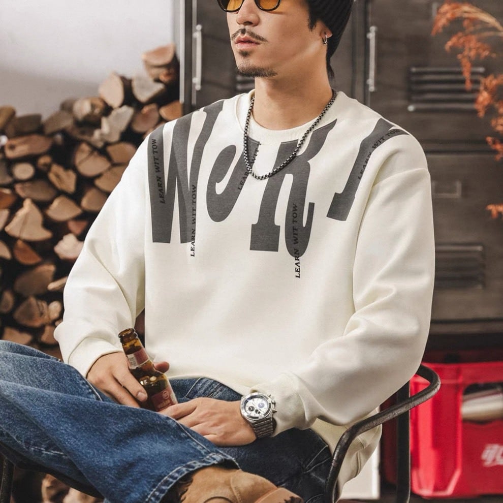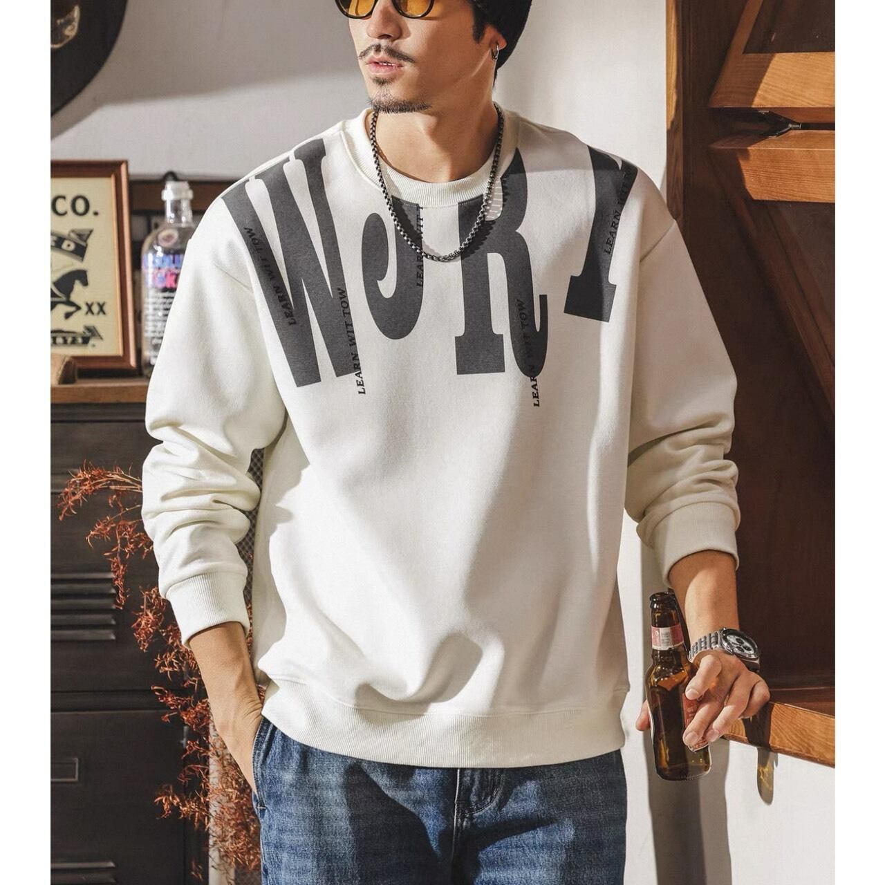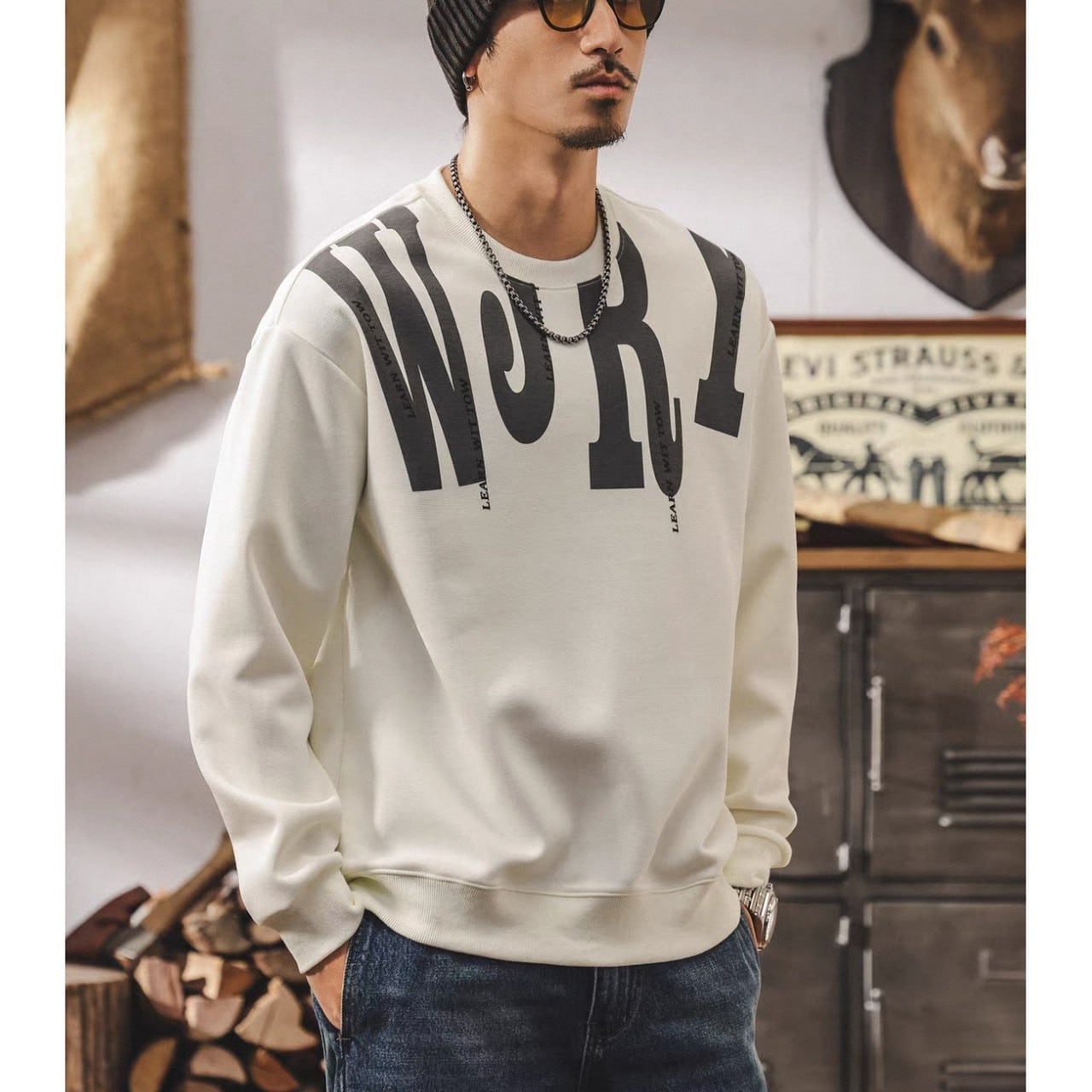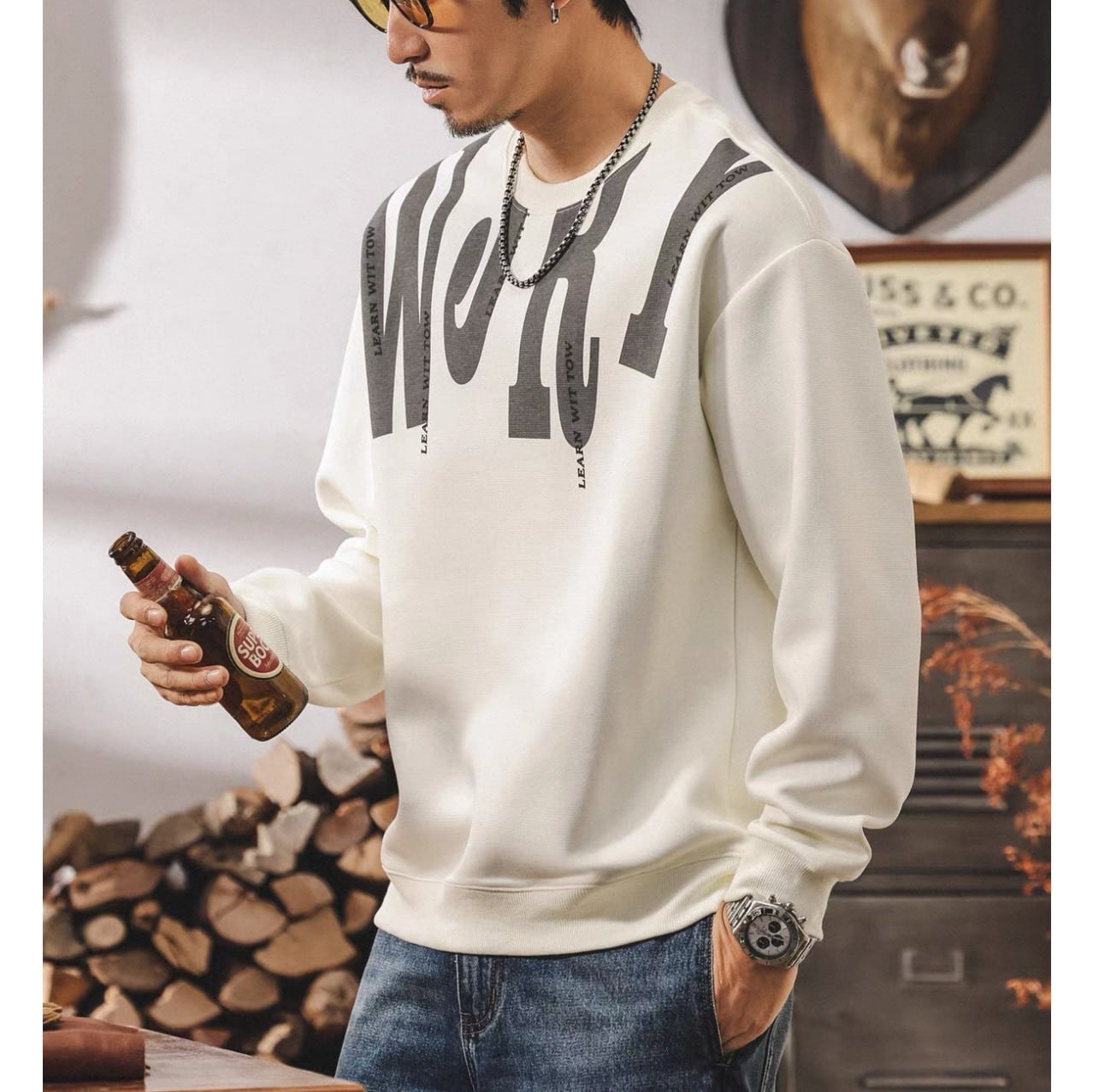 フロントに大胆に配したタイポグラフィが印象的なクルーネックスウェット。