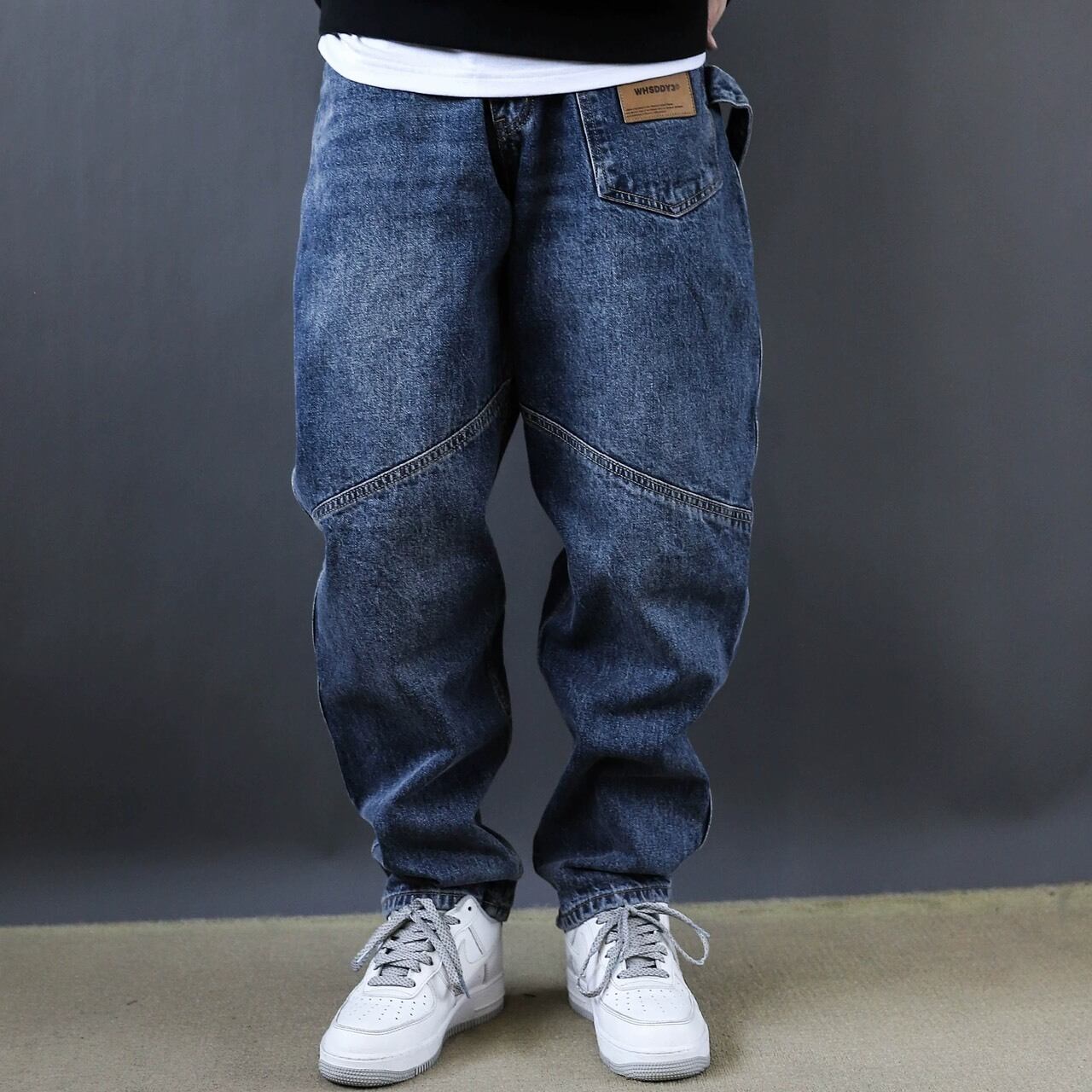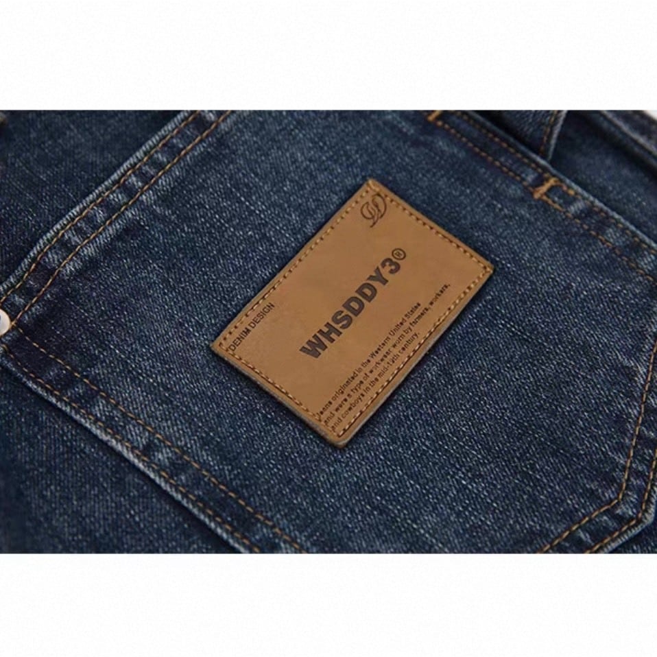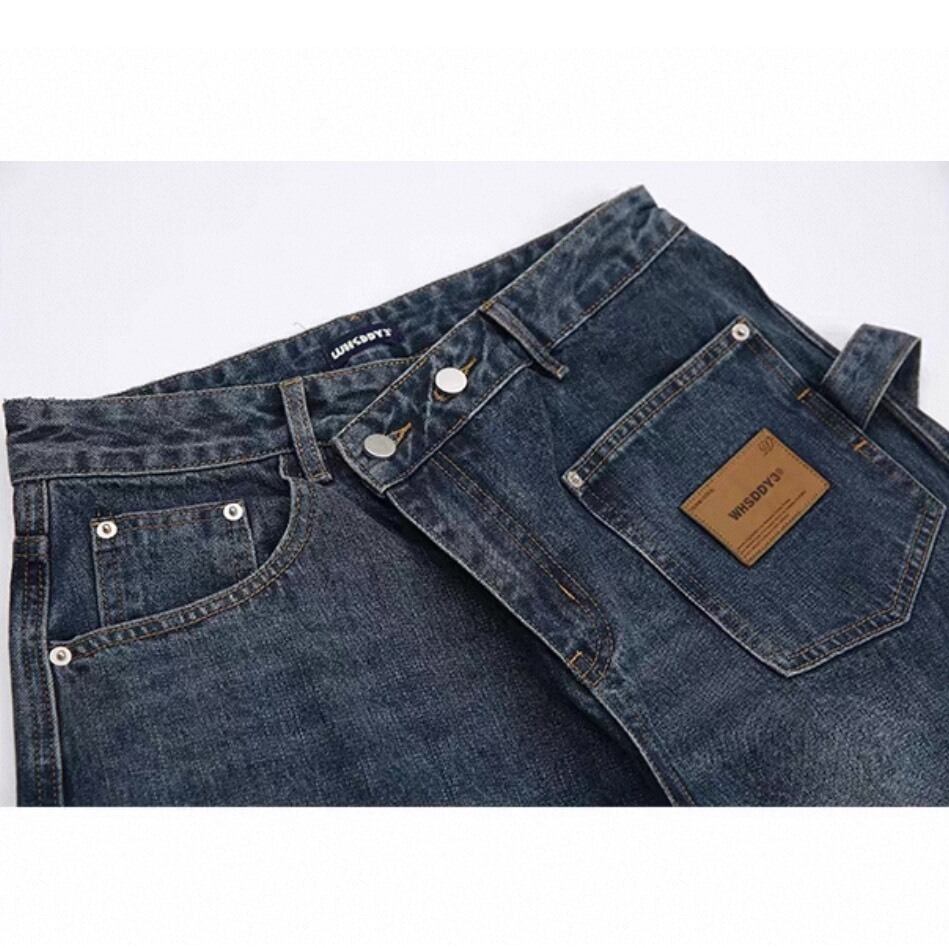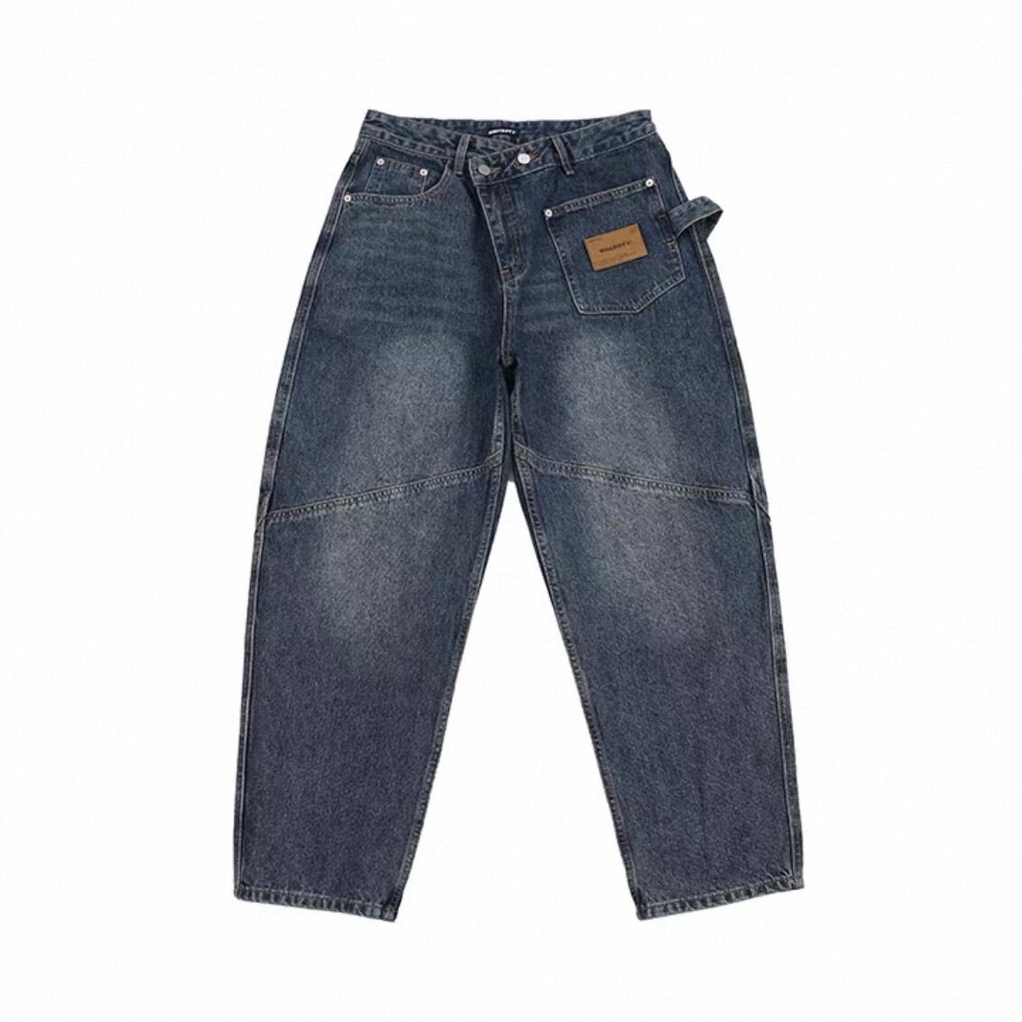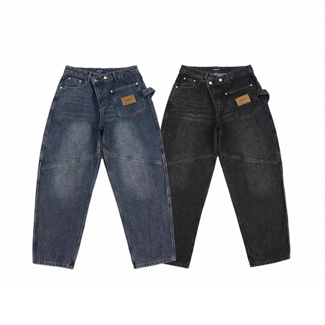 フロントに施された斜めの切替デザインが印象的なワイドデニムパンツ。