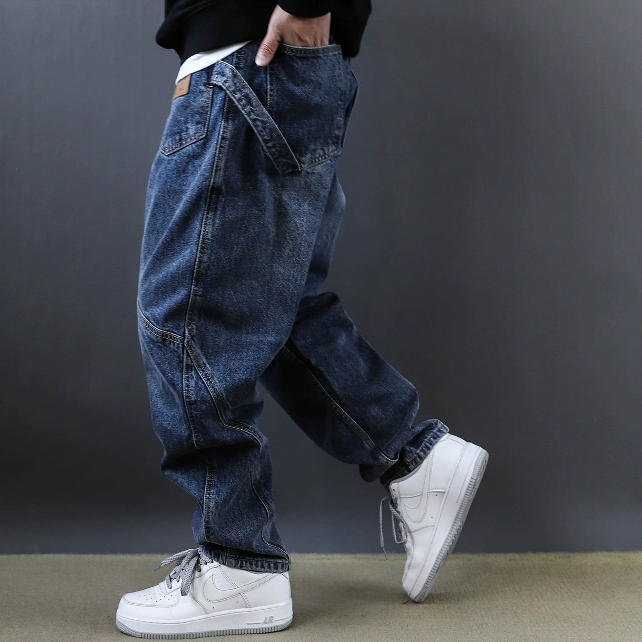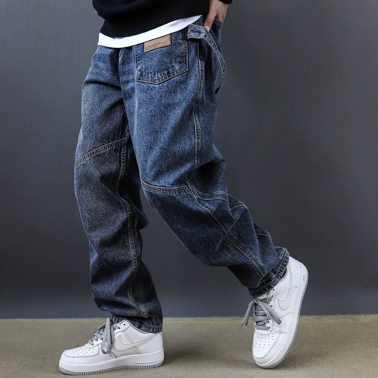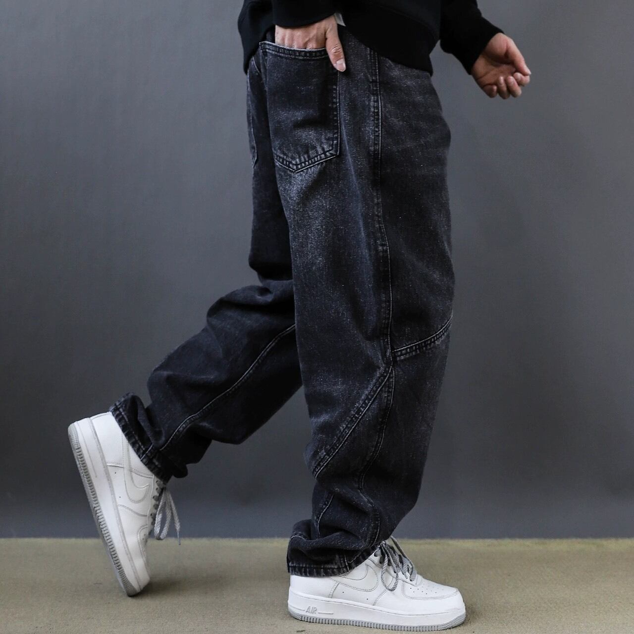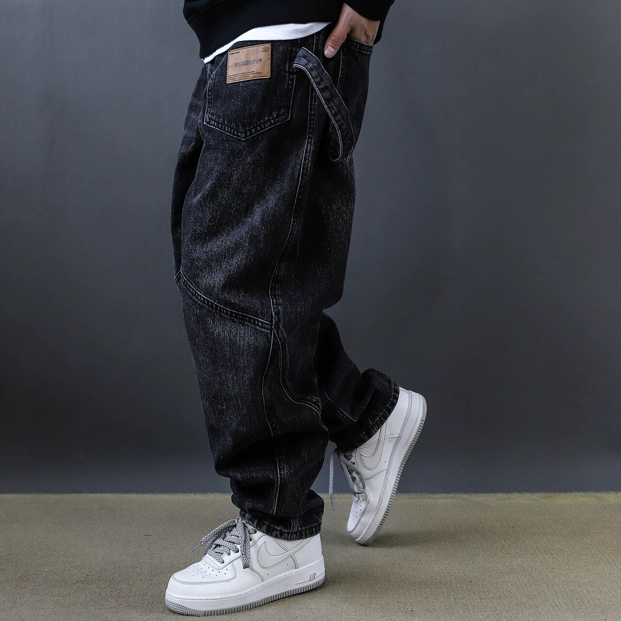 フロントに施された斜めの切替デザインが印象的なワイドデニムパンツ。