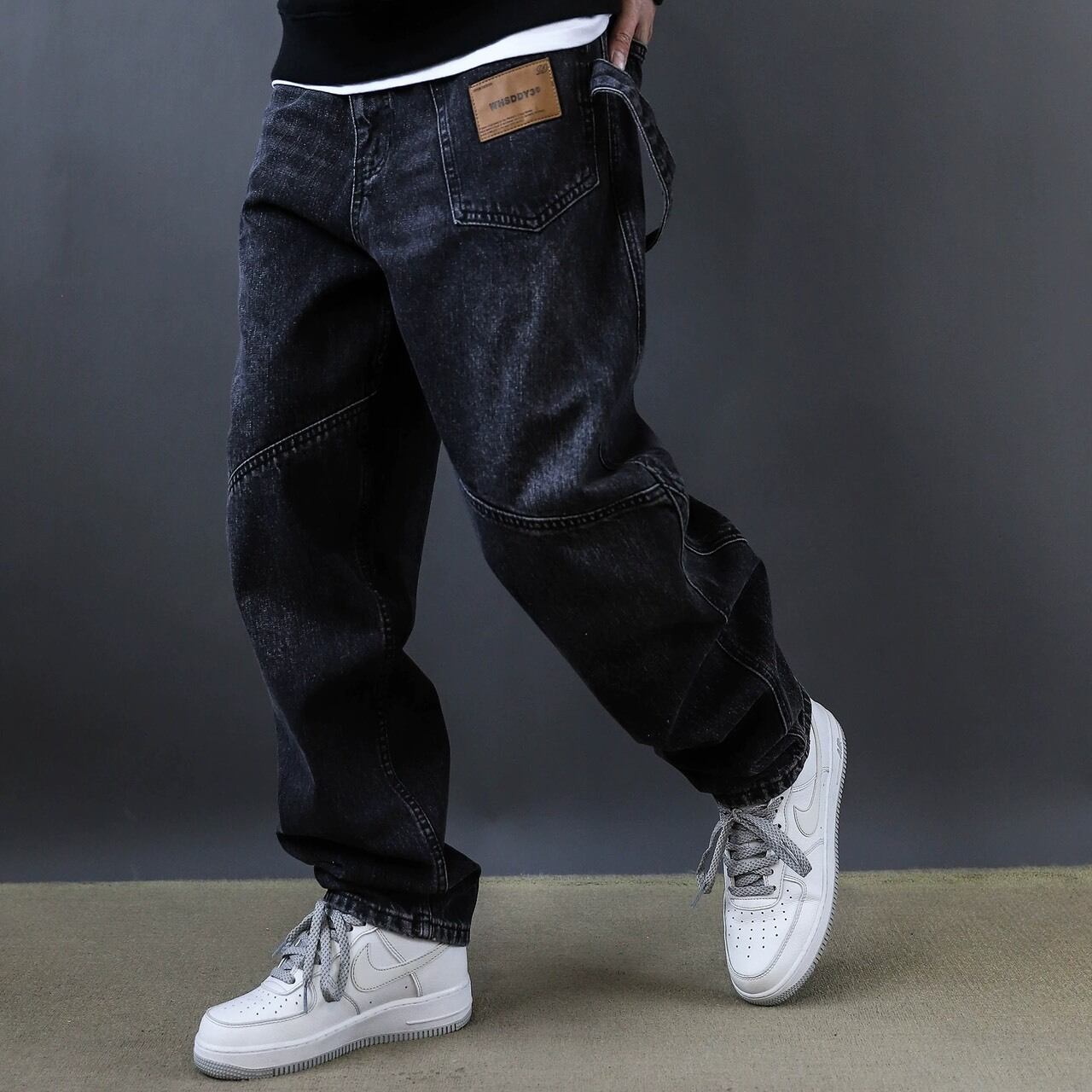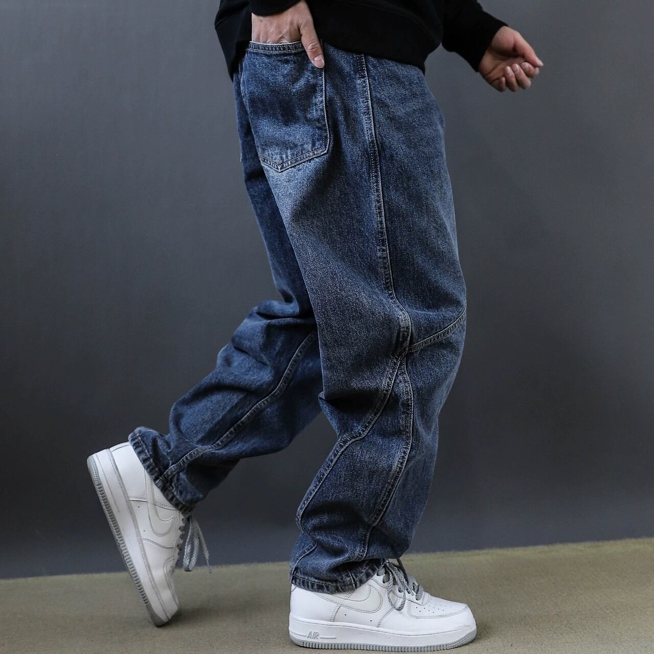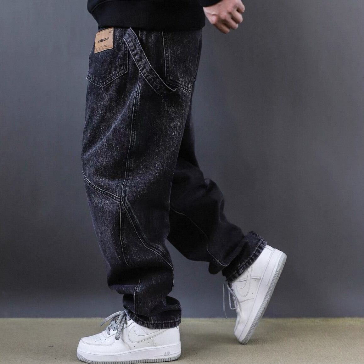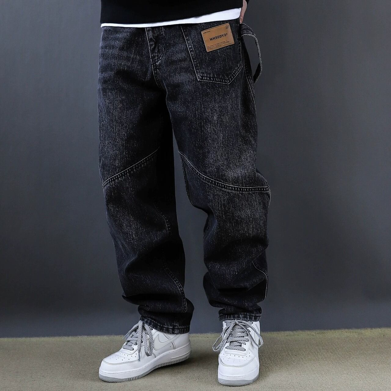 フロントに施された斜めの切替デザインが印象的なワイドデニムパンツ。