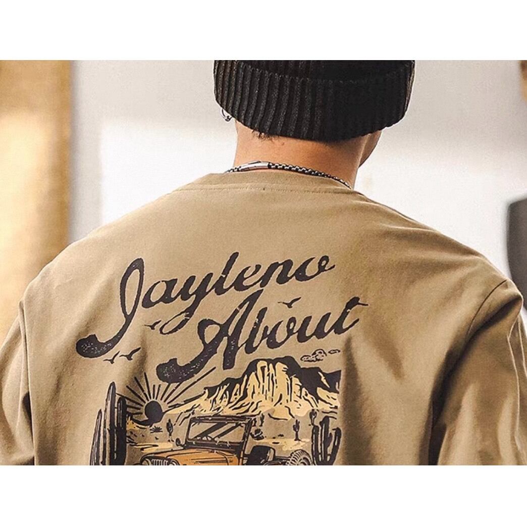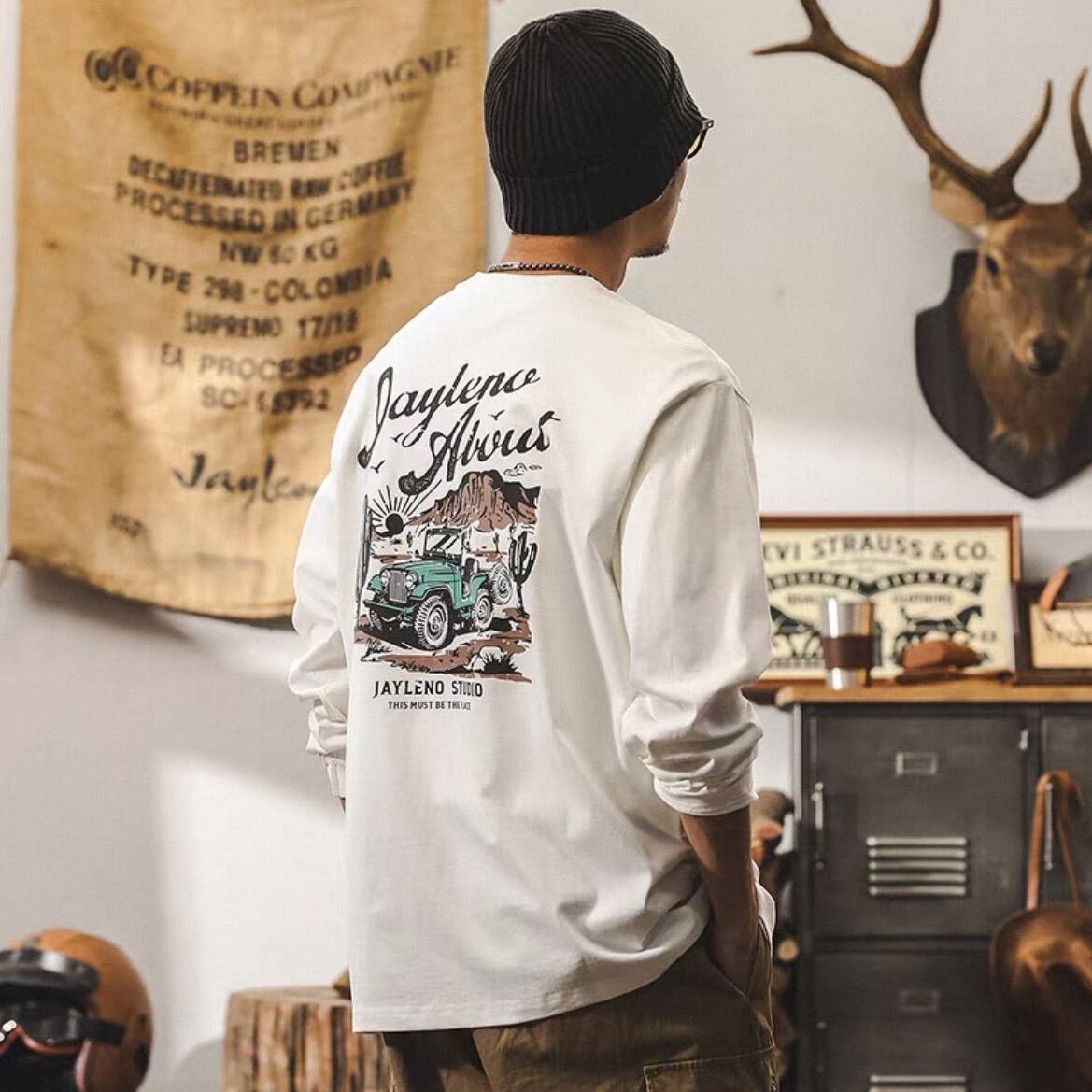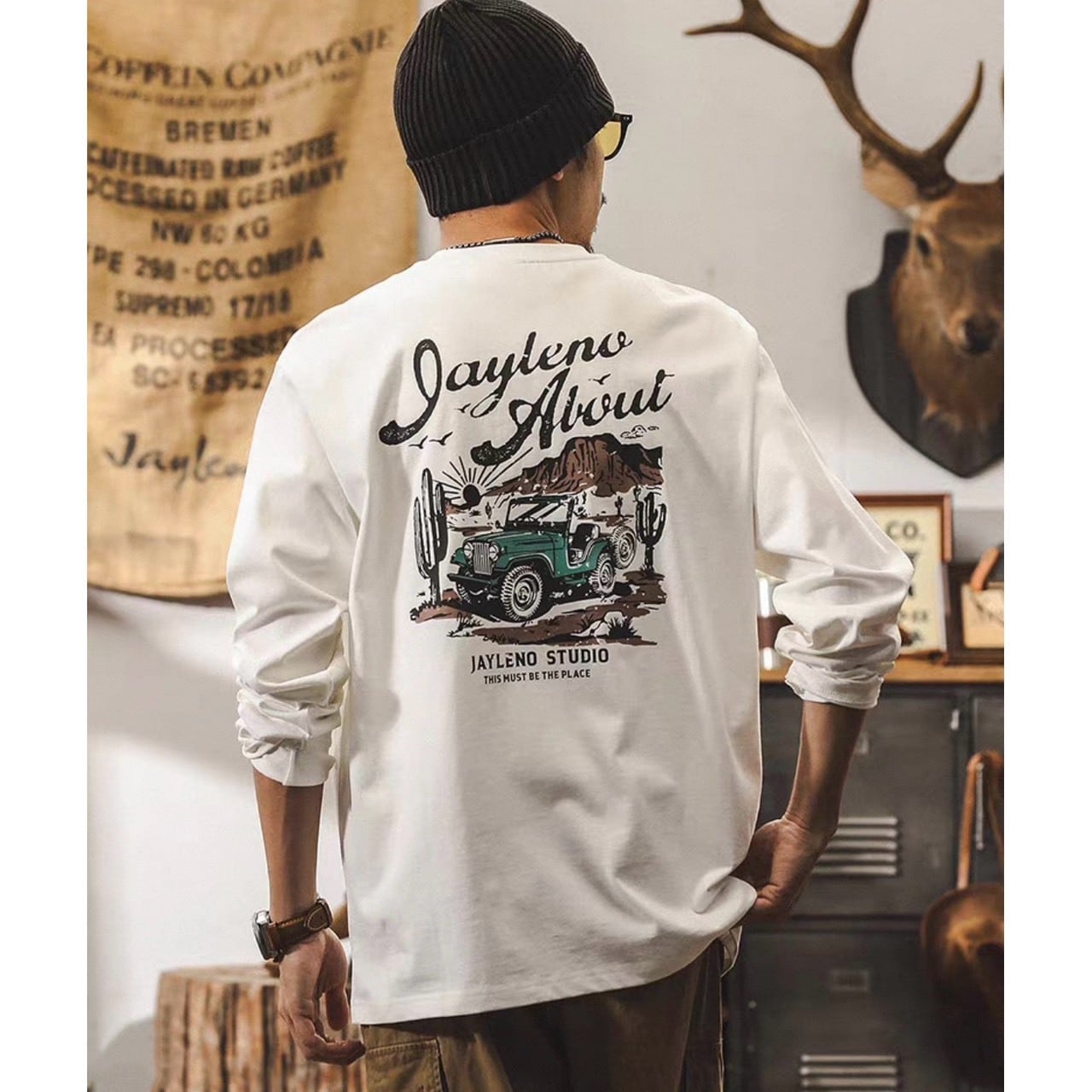 ヴィンテージポスターを思わせるデザインが目を引く一着。
