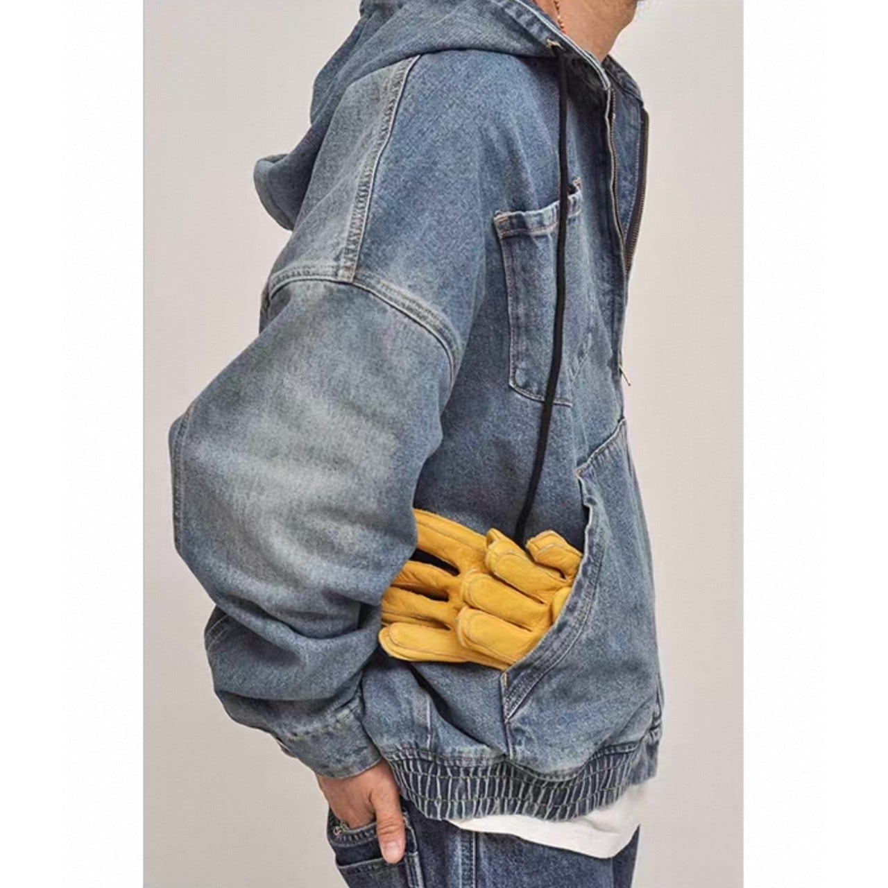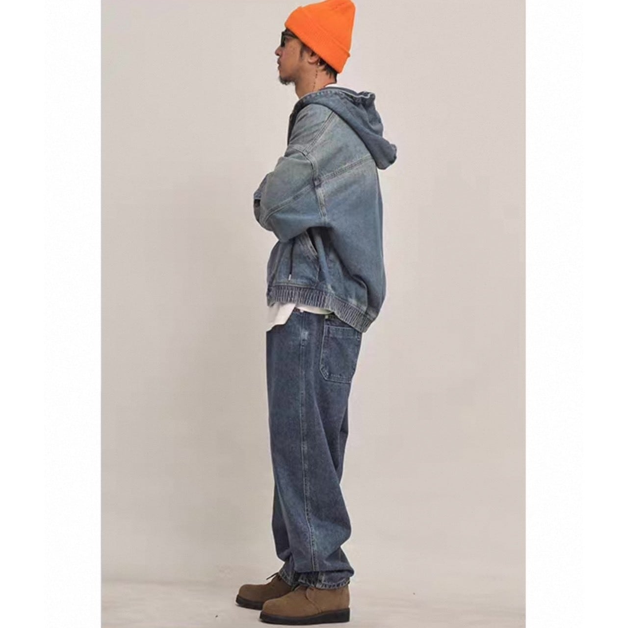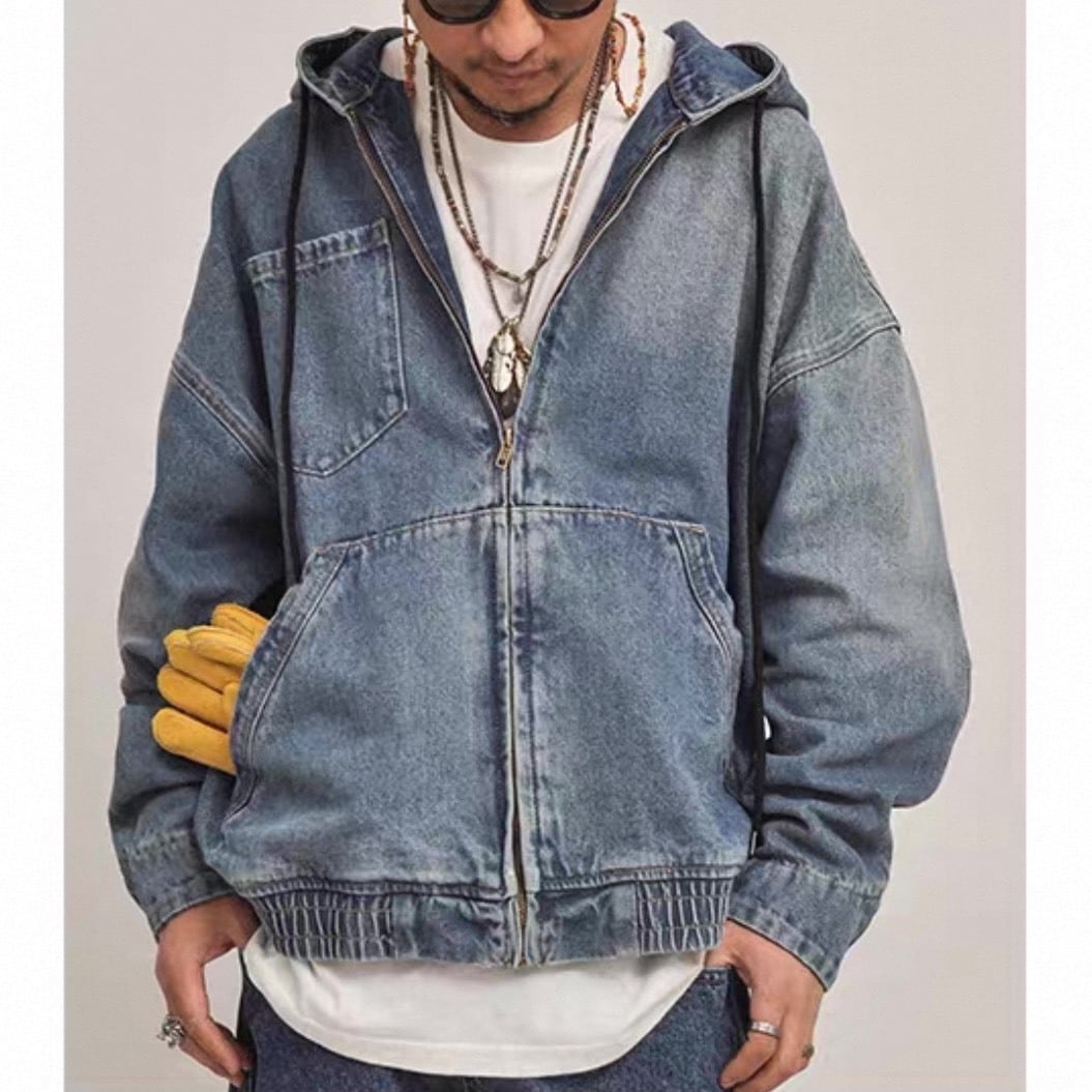 フード付きデザインでカジュアルさを強調したデニムアウター。
