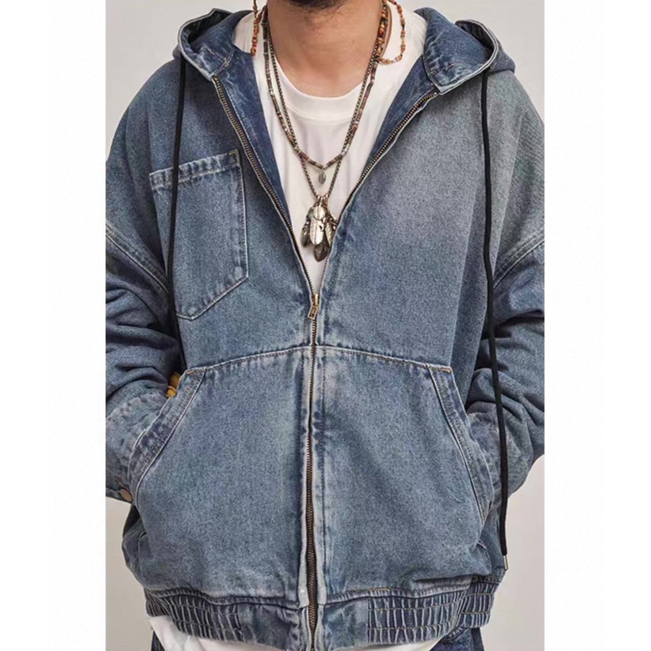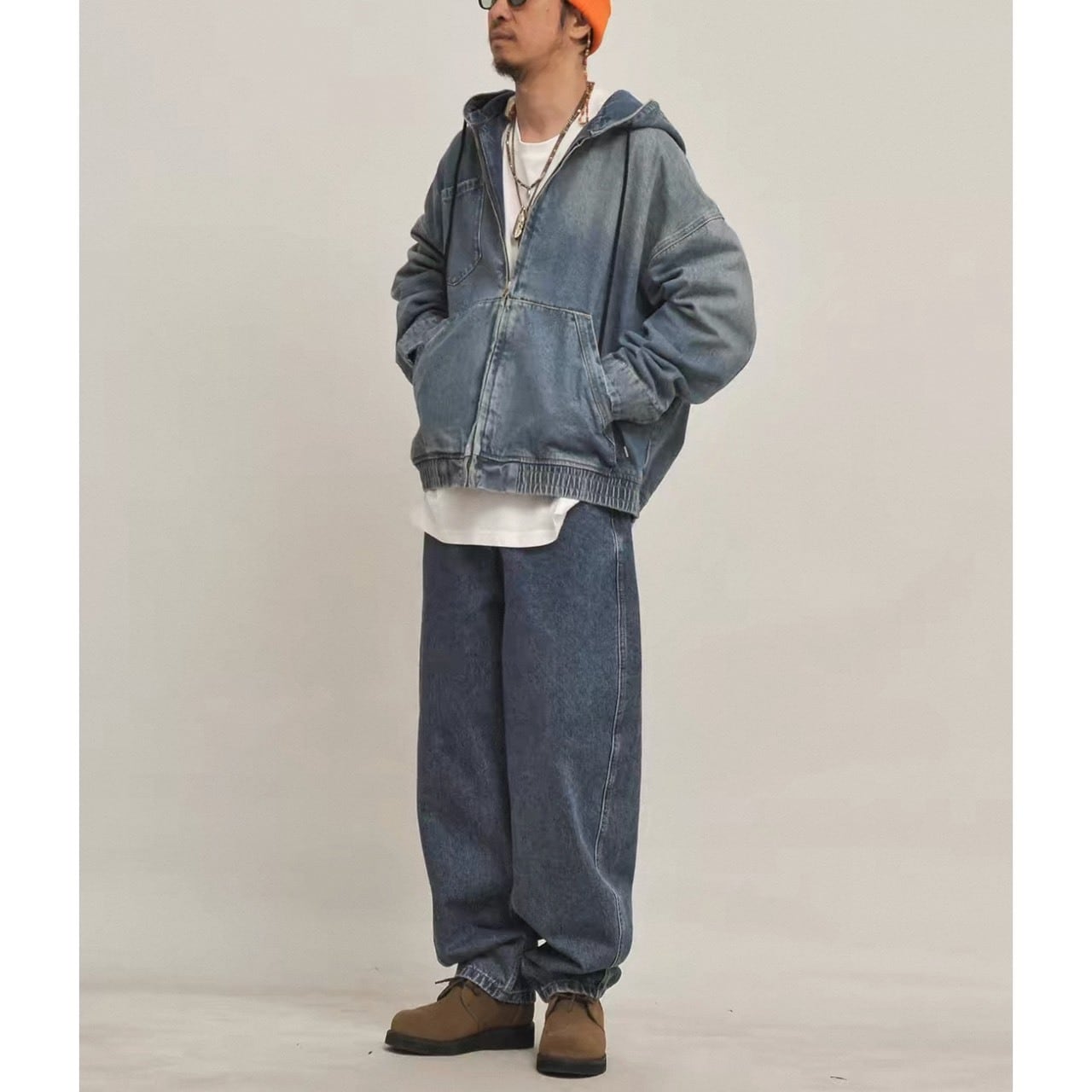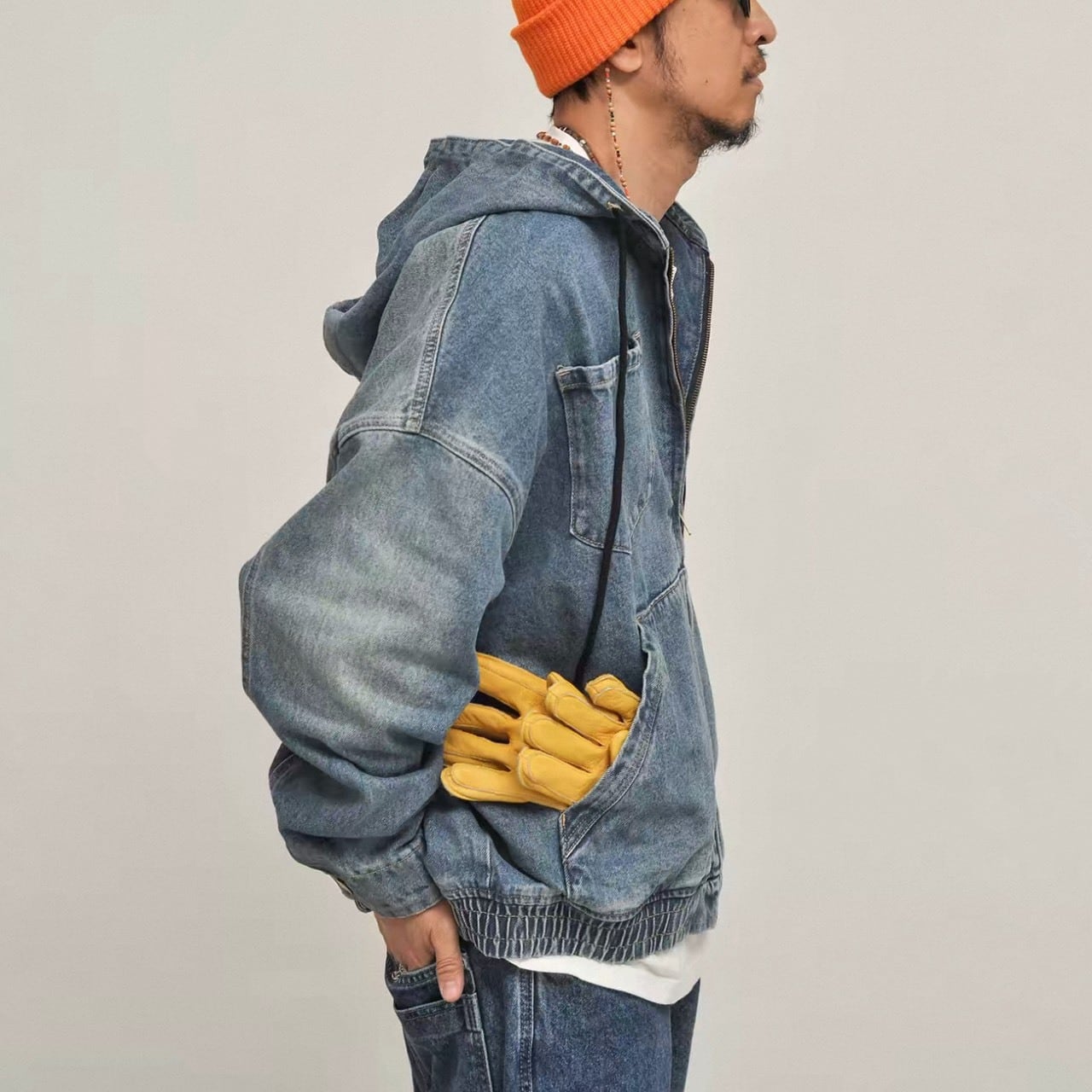 フード付きデザインでカジュアルさを強調したデニムアウター。