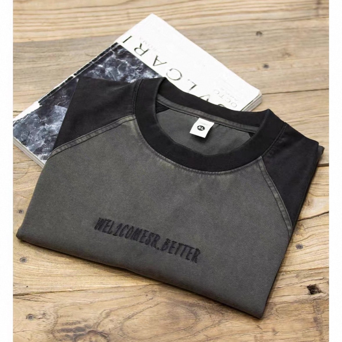 配色切り替えが印象的なクルーネックトップス。