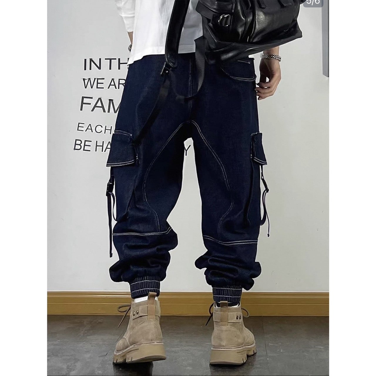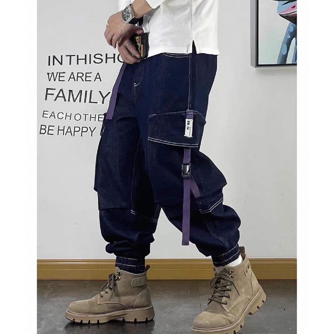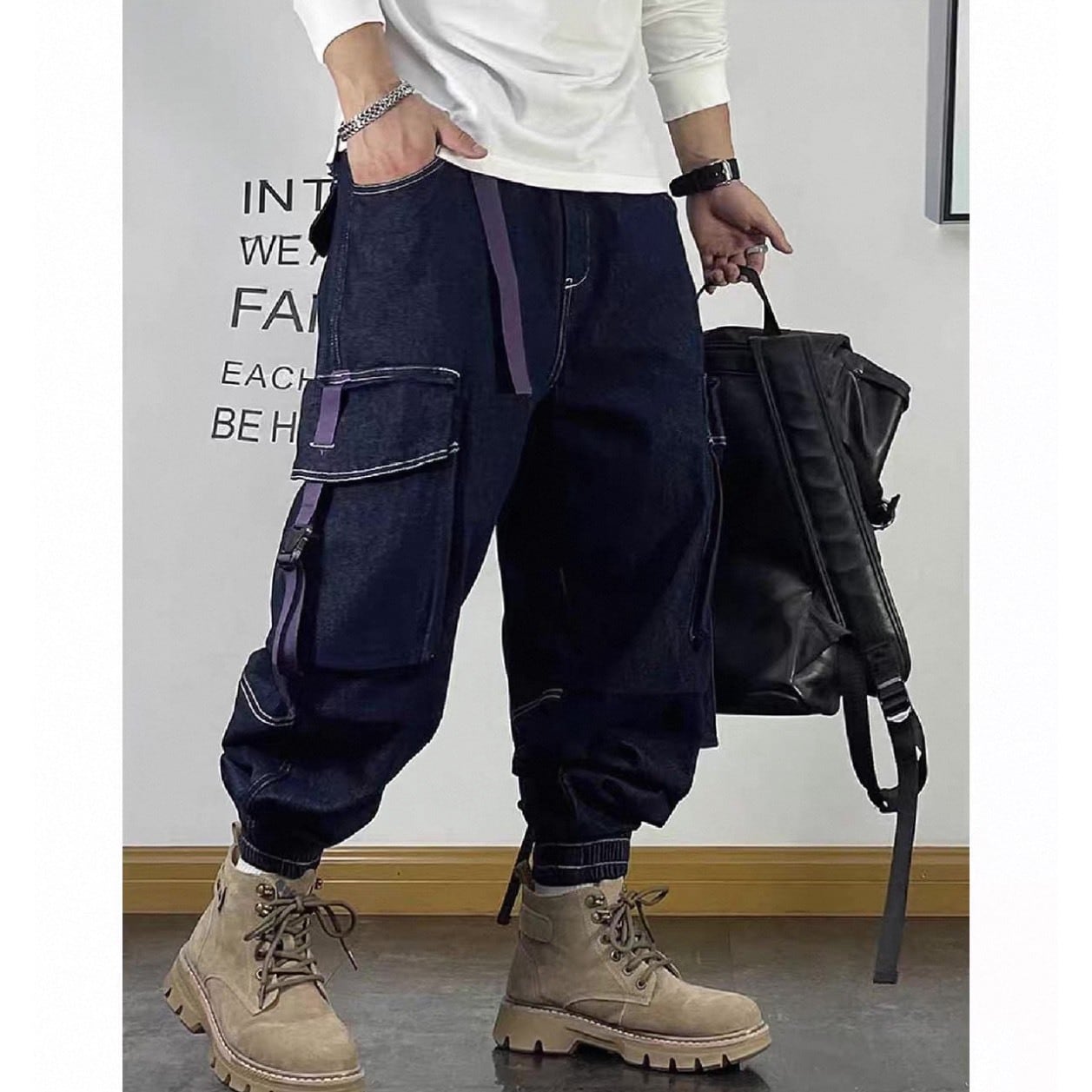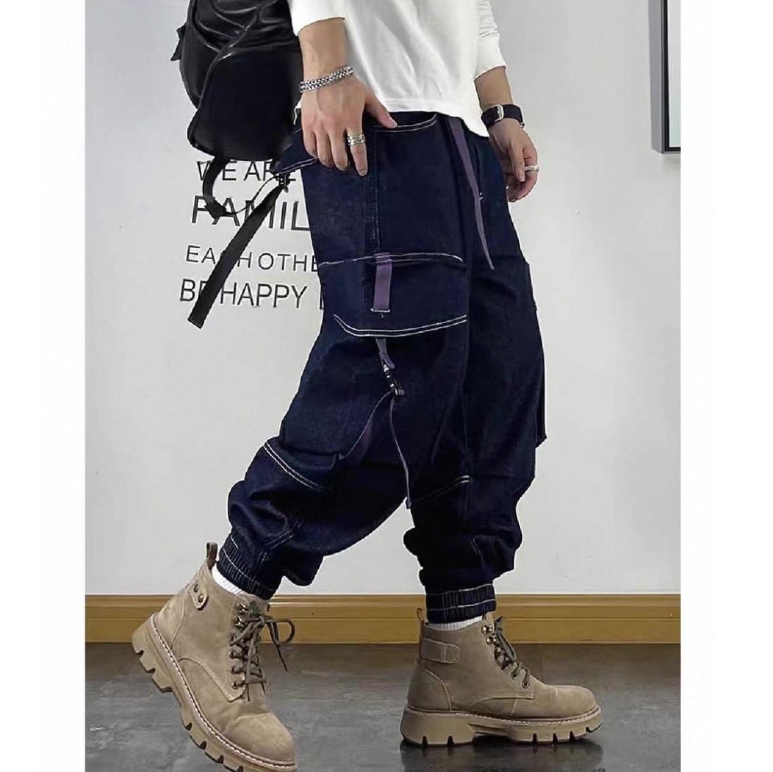 存在感のあるカーゴポケットとストラップディテールが目を引くデニムパンツ。
