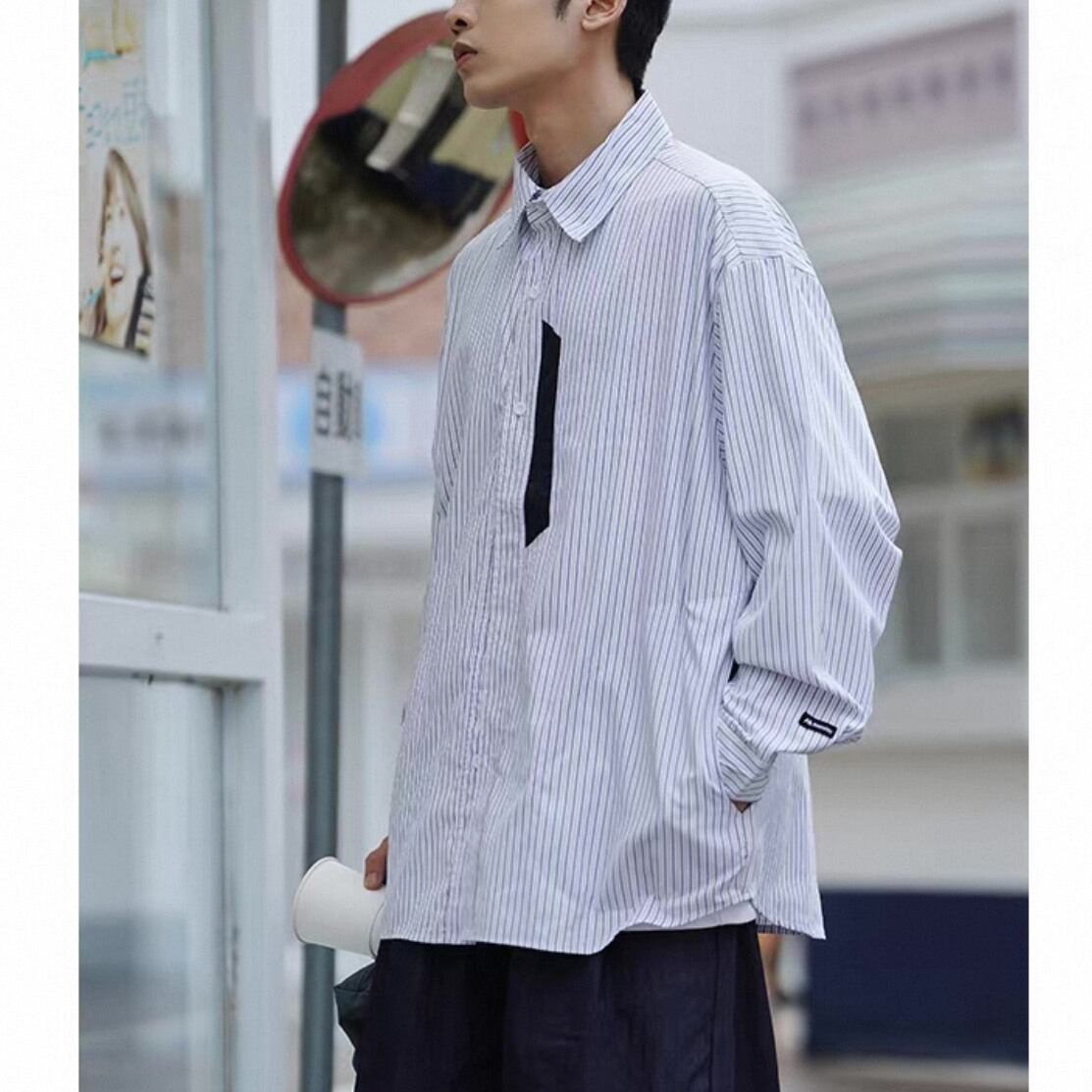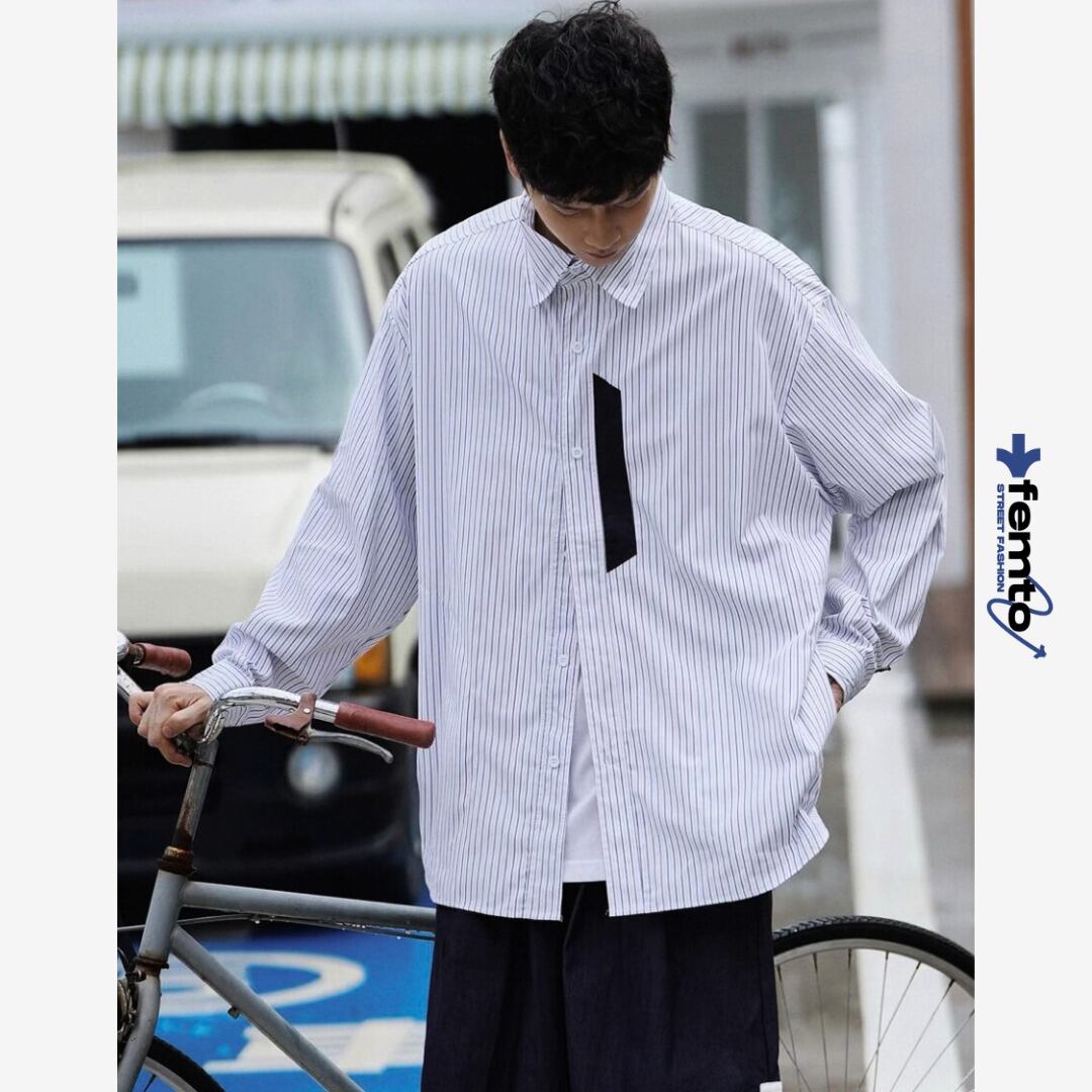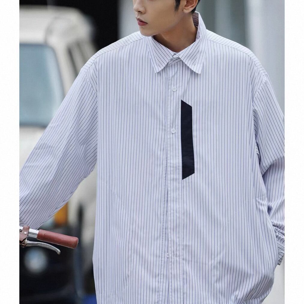 縦のラインが印象的なデザインに、胸元のアクセントディテールを加えたデザインシャツ。