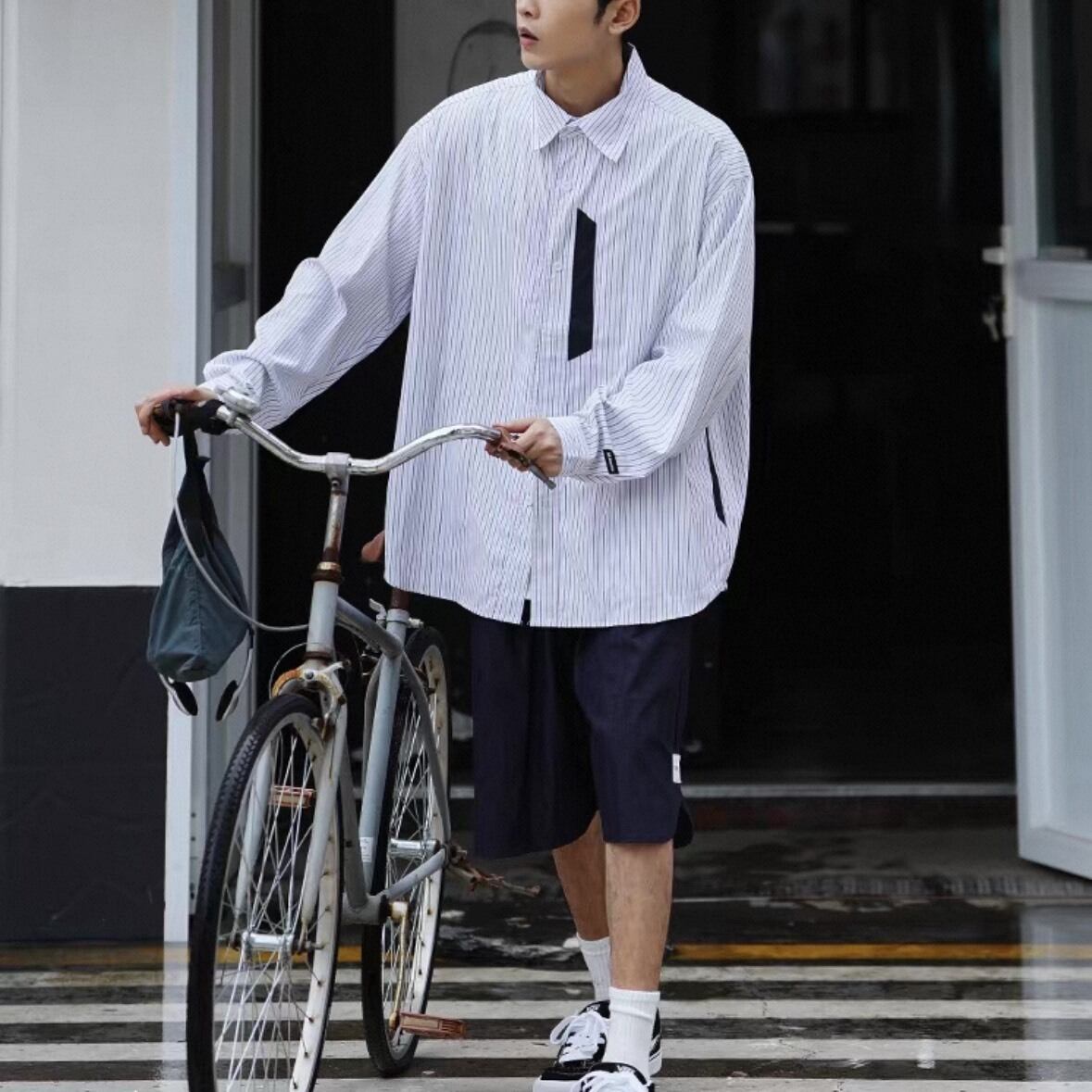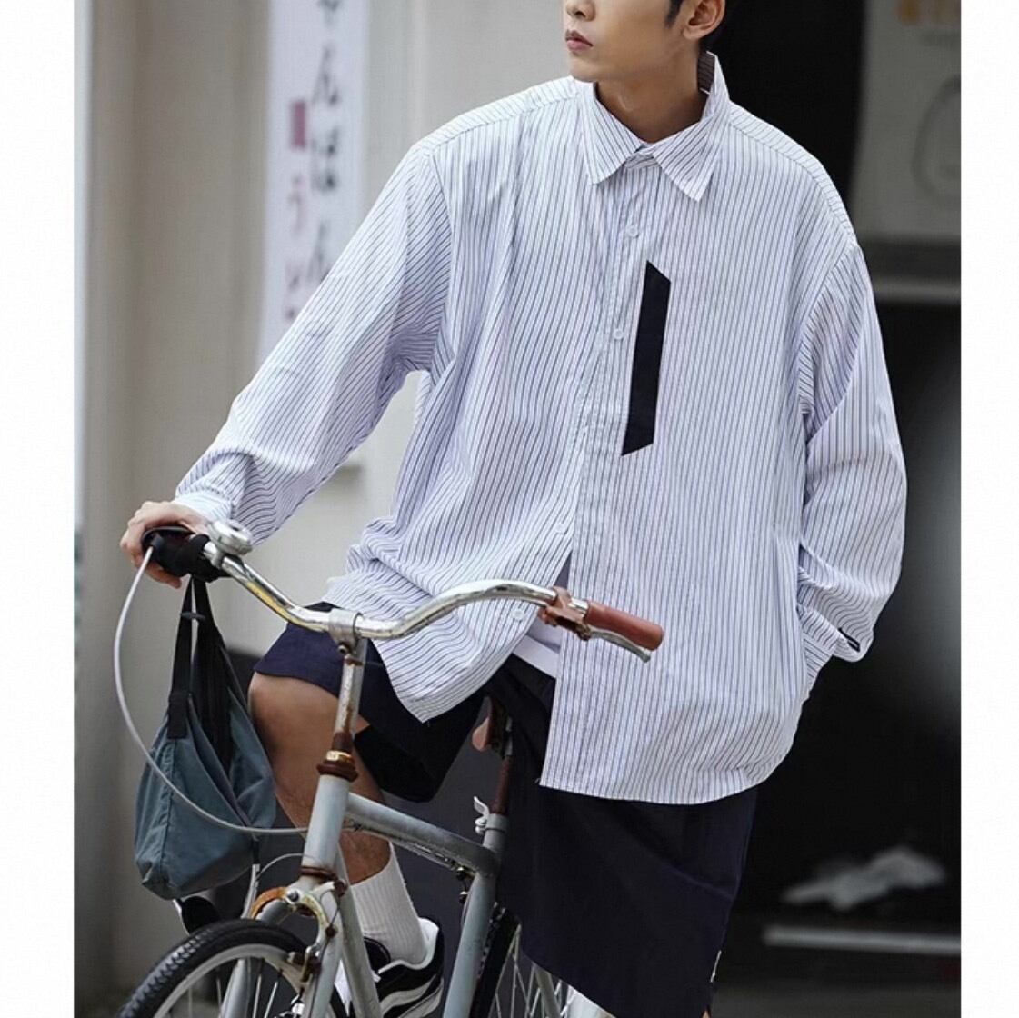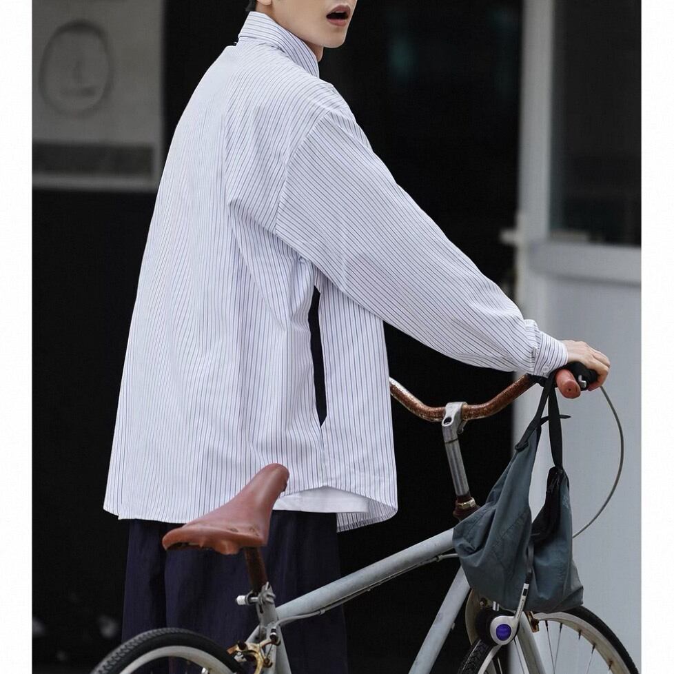 縦のラインが印象的なデザインに、胸元のアクセントディテールを加えたデザインシャツ。