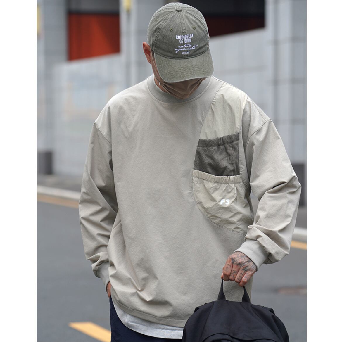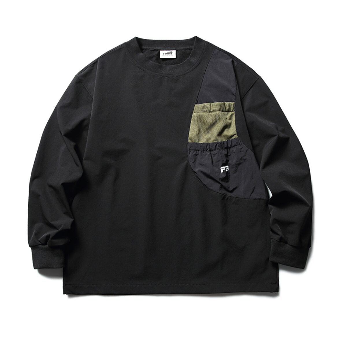 パッチワークデザインが目を引く、ロングスリーブクルーネックシャツ。