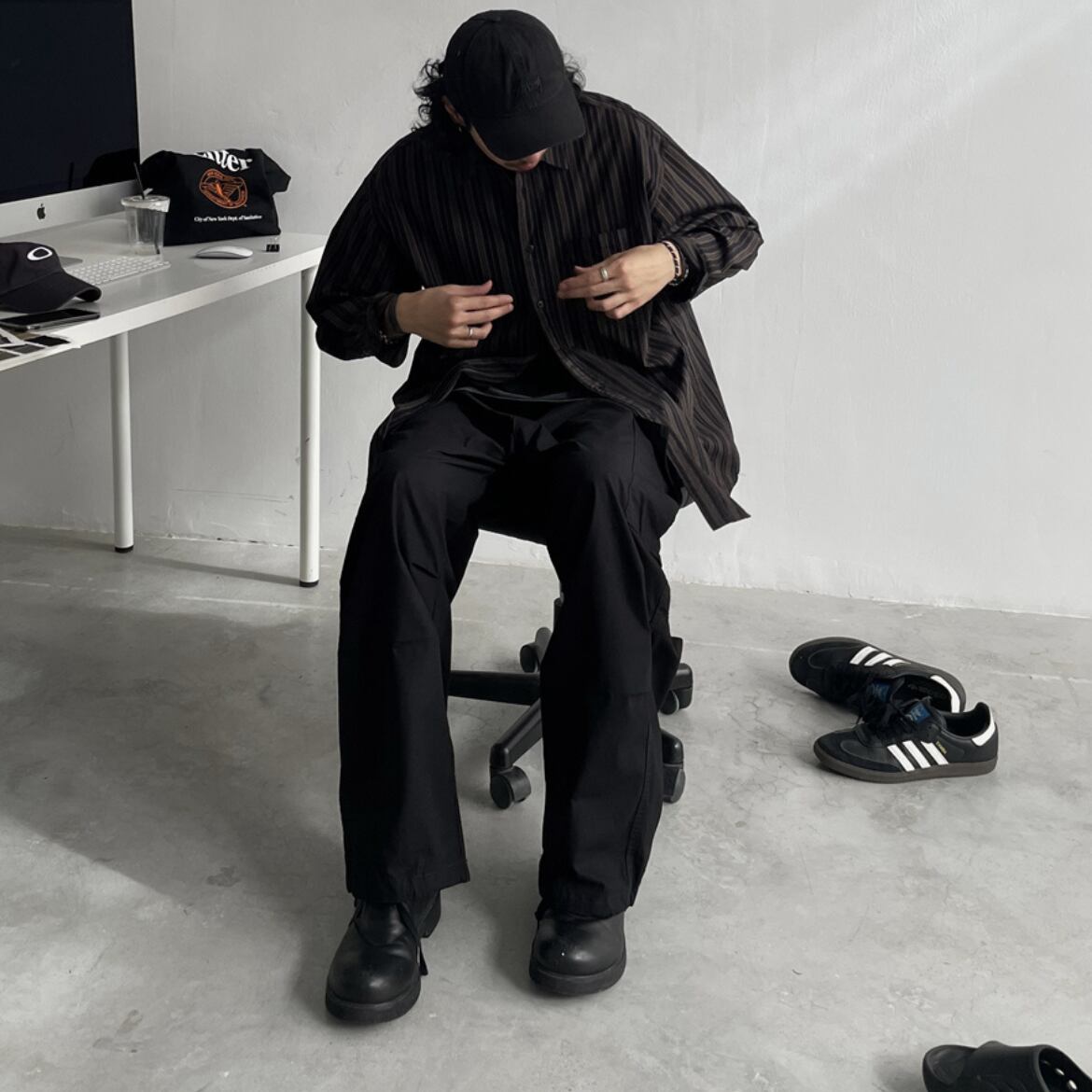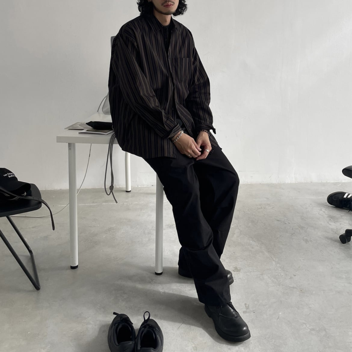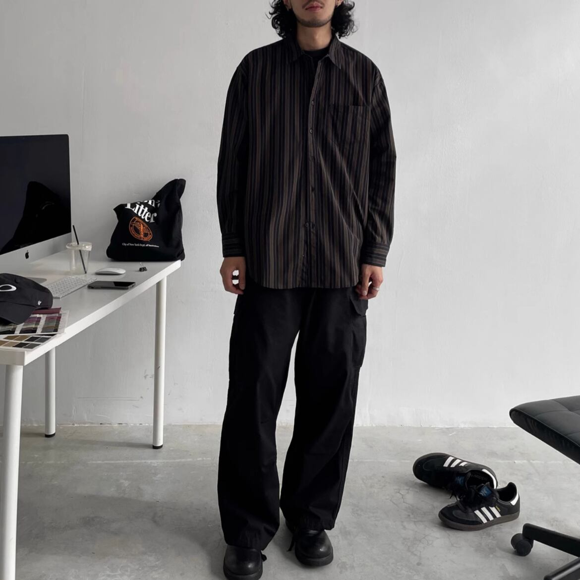 ストライプ柄のオーバーサイズ長袖シャツ。