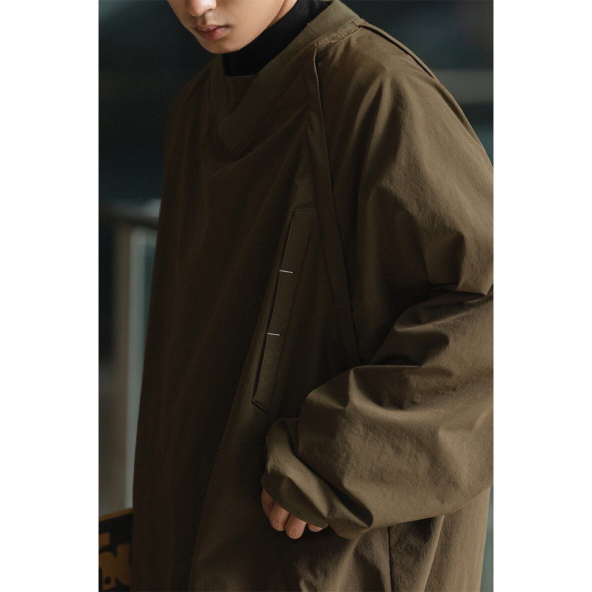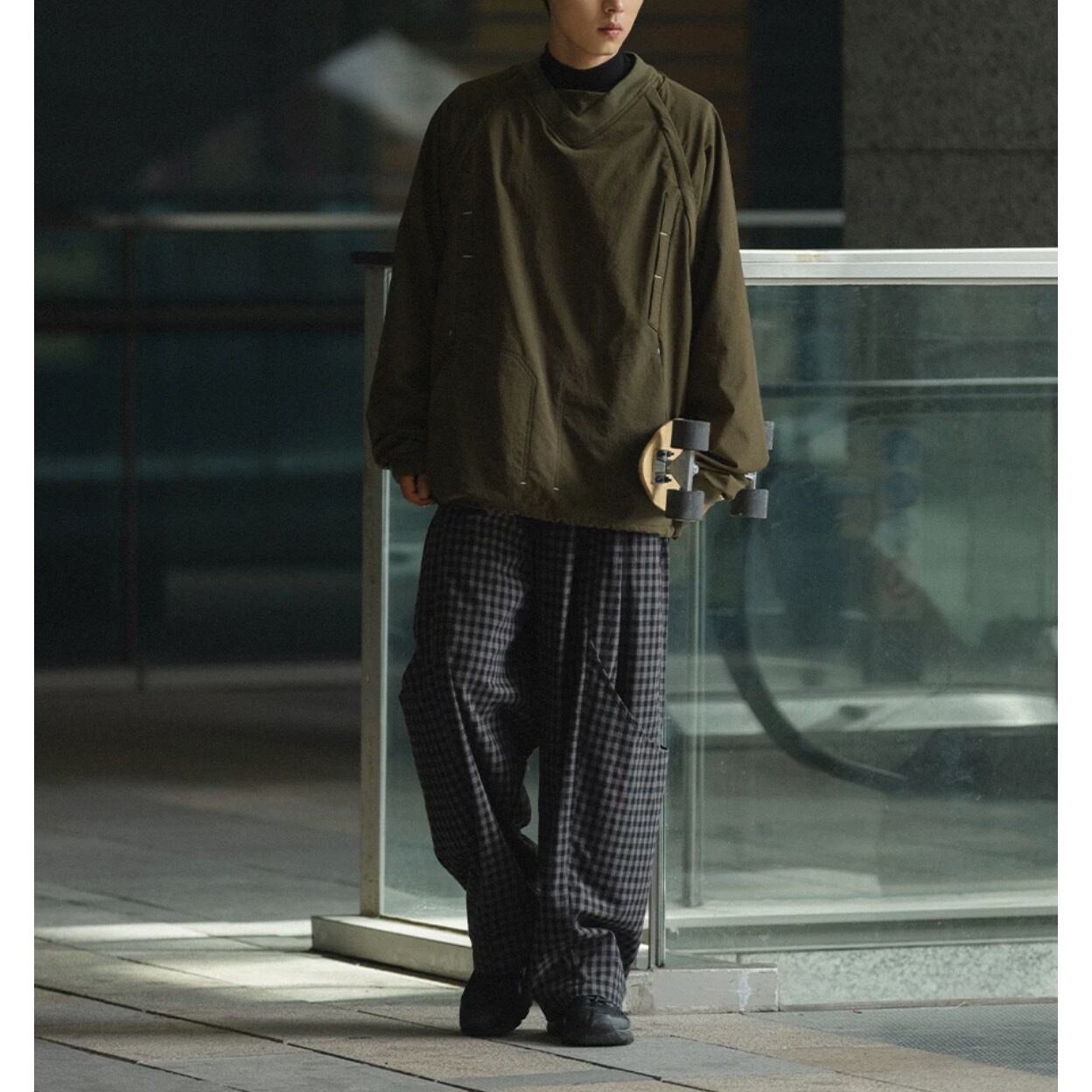 オーバーサイズで体型をカバーしながらも、スタイリッシュな印象を与えます。