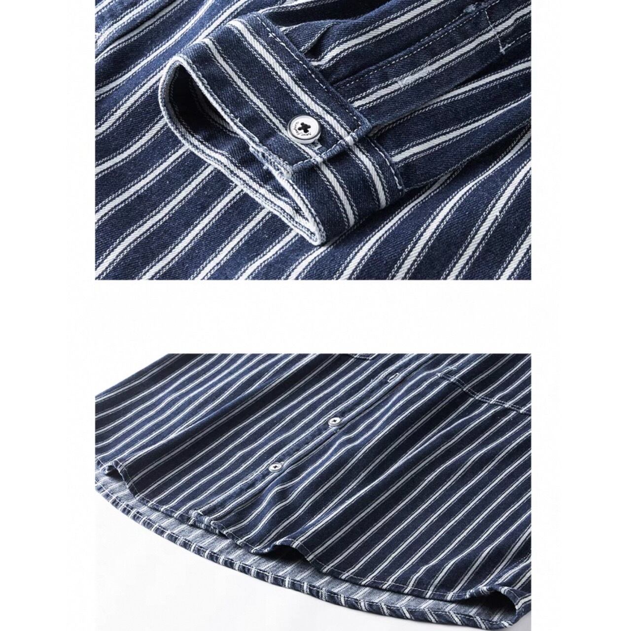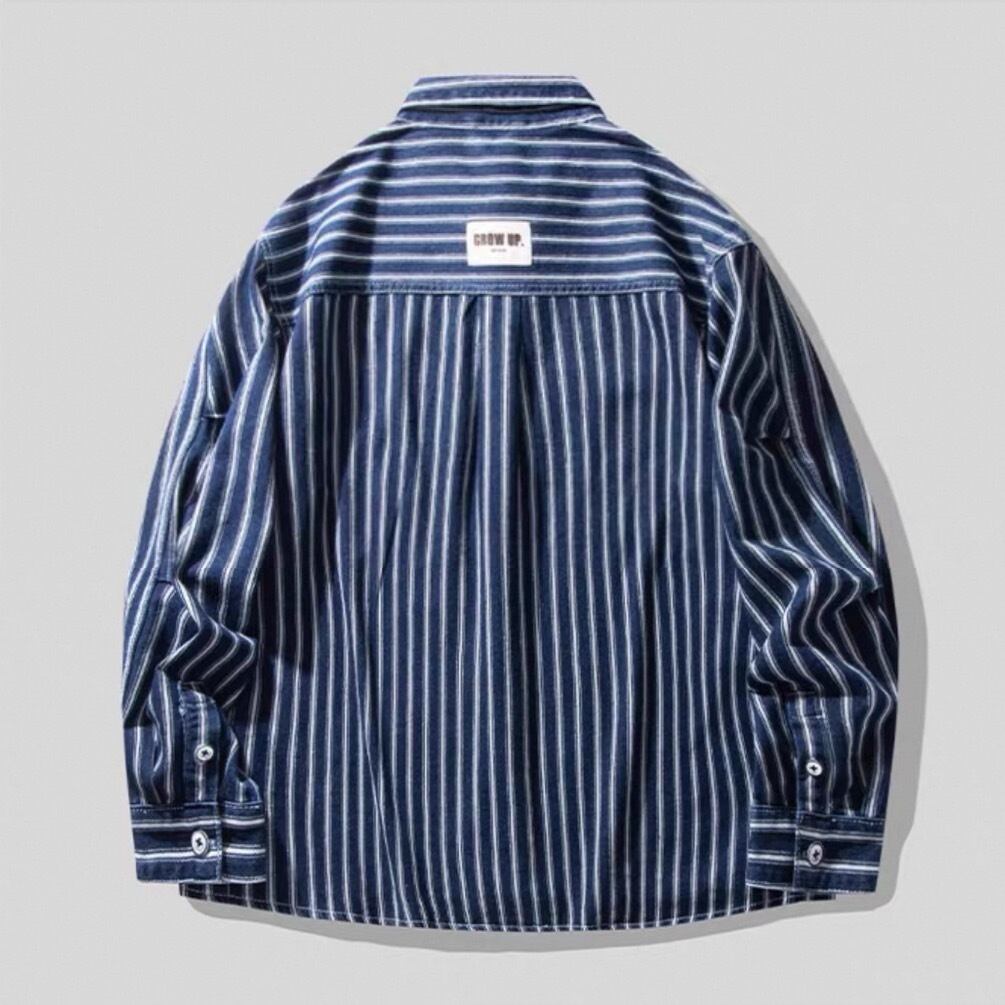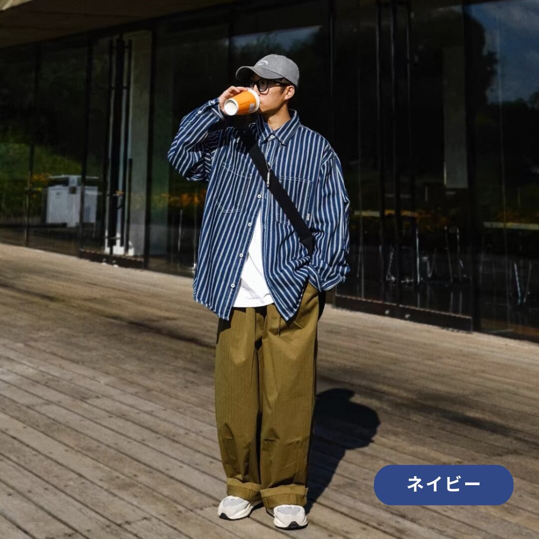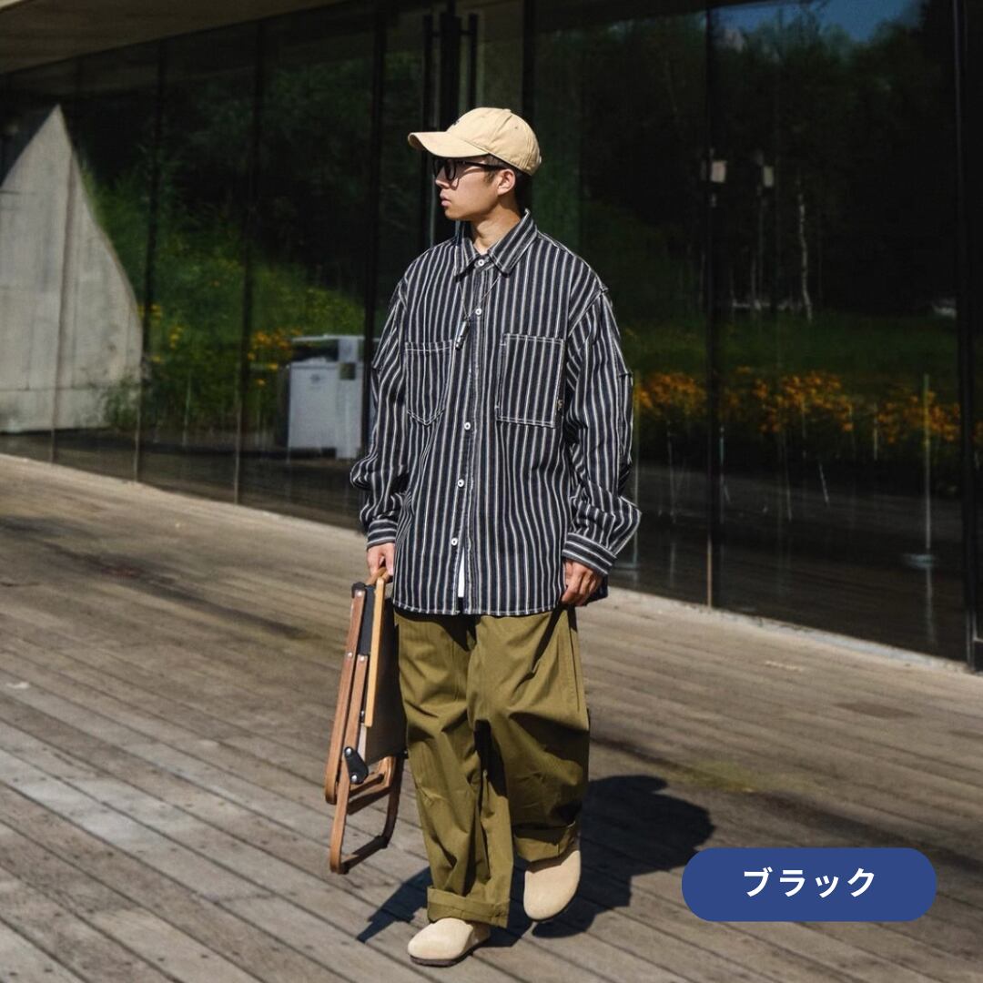 縦ストライプがスタイルをすっきりと見せる長袖ボタンダウンシャツ。